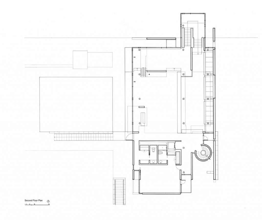 Two separate stairs provide access to the three floors of the house: an enclosed spiral stair to the south and an open switchback stair to the north. This contrast between private and public circulation is echoed consistently in the organization of the volumes within.