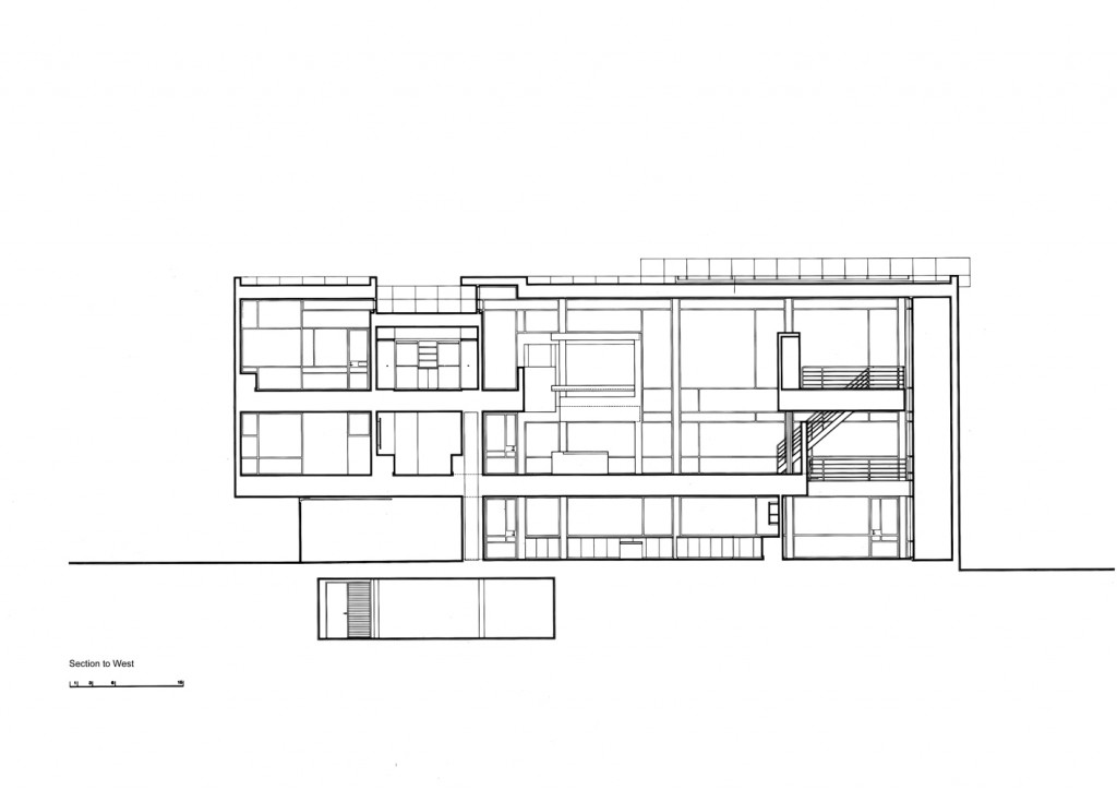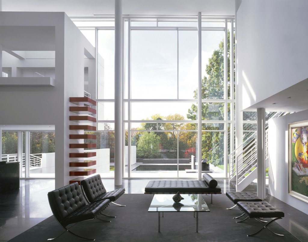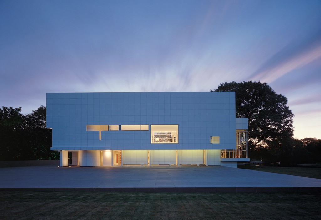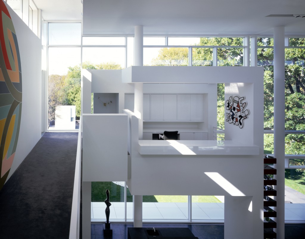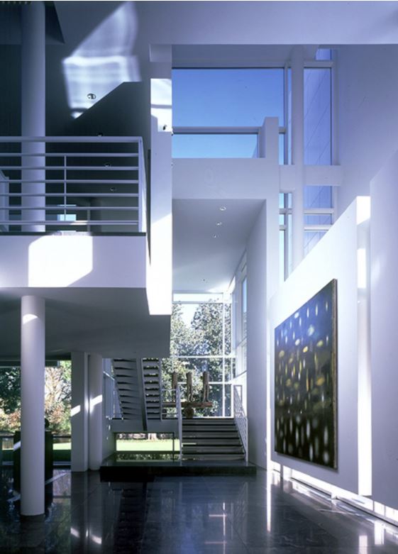 The white form of the house hovers on pilotis above the podium like an opaque plane, pierced by a number of discrete openings. A succession of spatial layers recedes from this taut surface to accommodate the house’s principal volumes. The metal-faced front elevation that shields the living volume gives way on the north and west elevations to taut curtain walls that, together with the opaque front, inflect the interior layered space toward a small body of water to the southwest. Two sheets of water-a reflecting pool and a swimming pool-penetrate the podium at the rear of the house. The swimming pool, plus a cubic pool house and a low wall, effectively terminate the sitework at the western end.
