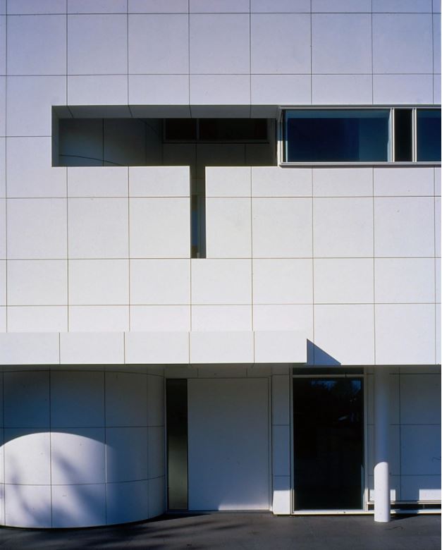 Stairs giving access from the swimming pool and to the roof terrace, along with a two-car garage under the guest suite on the south side of the house, complete the symmetrical repertoire. The exterior of the house is clad in white-enameled aluminum panels with aluminum fenestration and insulated glazing. |
