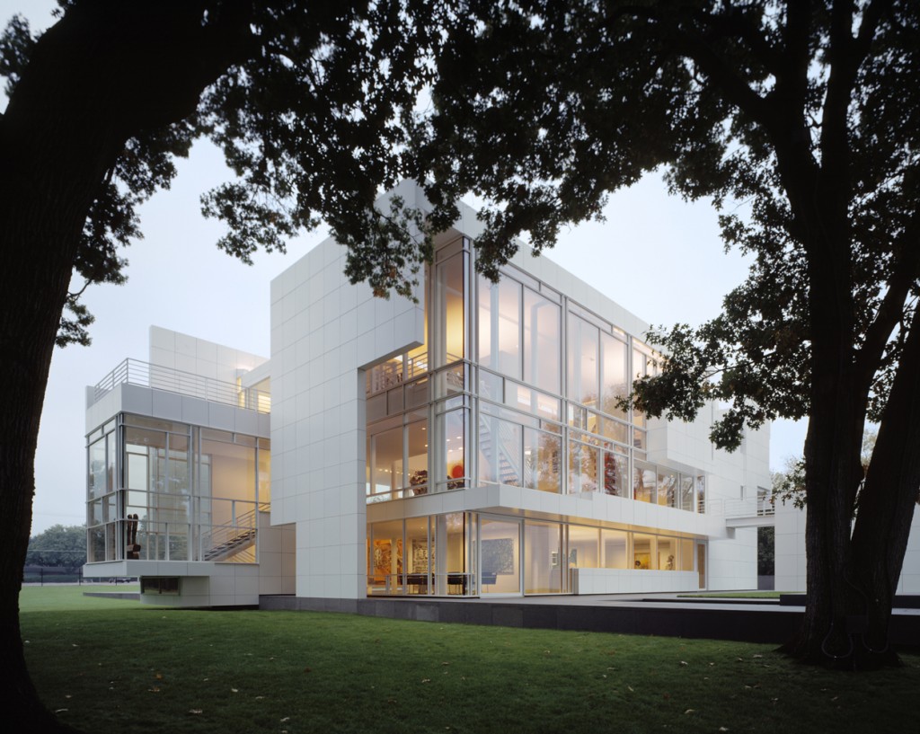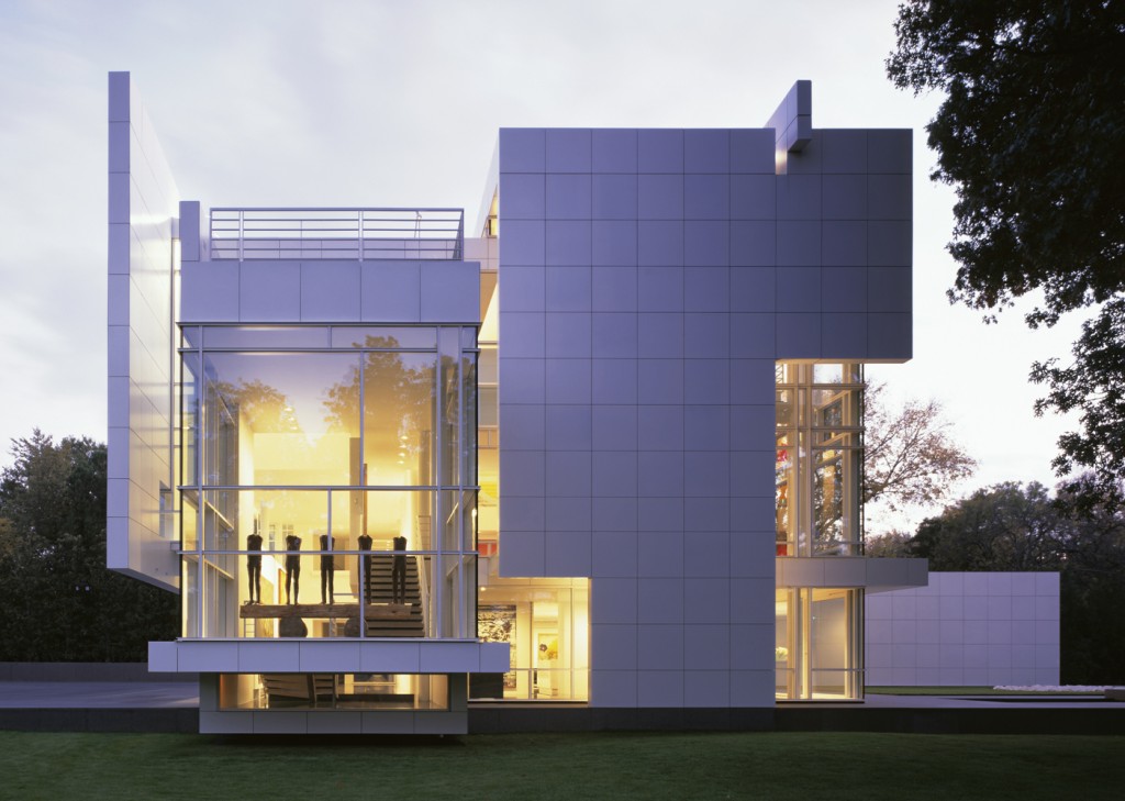 Set in a suburban landscape, this house/private museum is anchored to the ground by a podium faced in black granite that extends both in front of and behind the main body of the building.