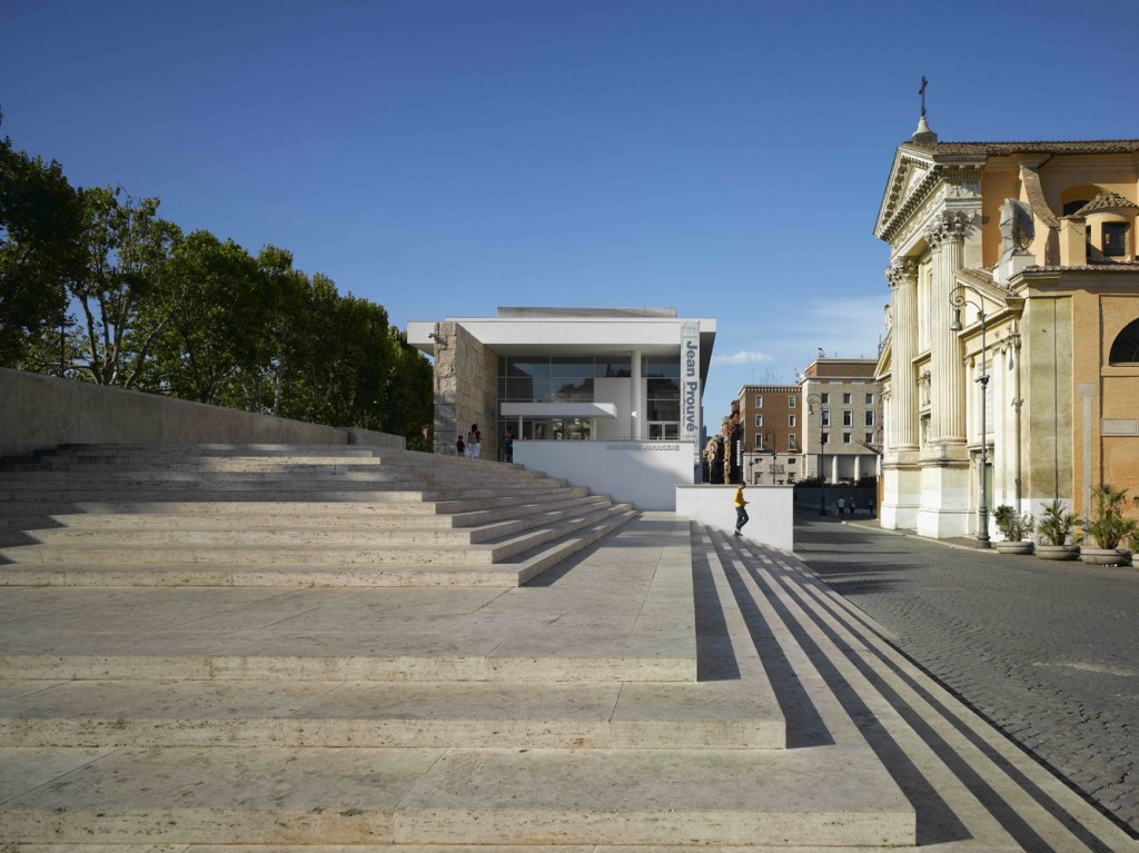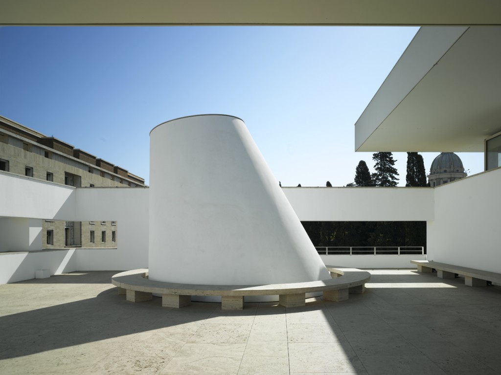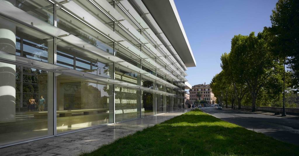The clarity of the volumes and the building’s proportions relate in scale to Rome’s ancient structures. A predominating feature of the new building is a glass curtain wall measuring 150 feet long and 40 feet high.