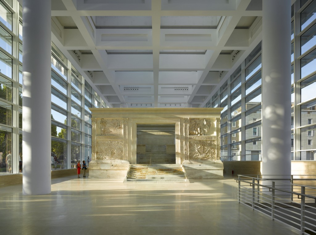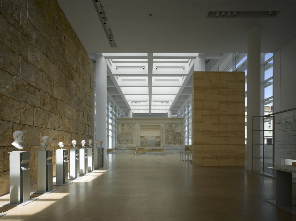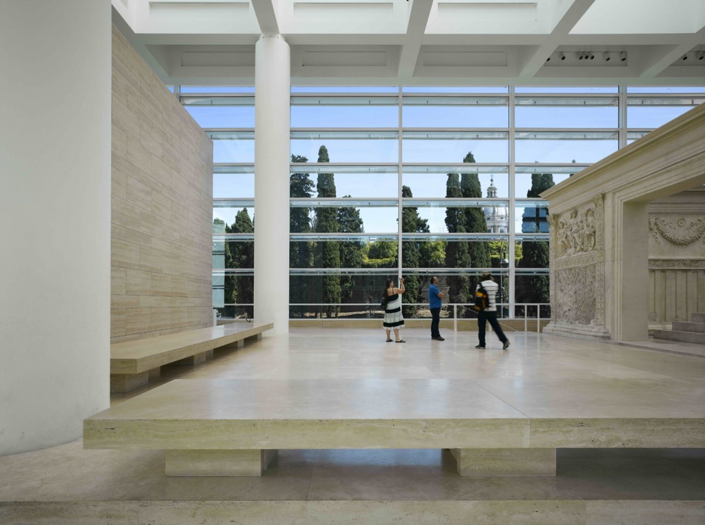 The asymmetrical entry hall, defined by seven slender columns in reinforced concrete finished with white waxed marble plaster, leads to the main hall, which houses the Ara Pacis. The contrast between the subdued lighting of the entrance space and the expansive top-lit and rigorously symmetrical main hall encourages a naturally progressive circulation. The roof over the main hall rests on four columns with skylights to maximize natural lighting and to eliminate “false shadows.” Outside the main structure, a low travertine wall extending from within the main hall traces the ancient shore of the Tiber River. Building materials include glass and concrete and an indigenous fine beige Roman travertine.