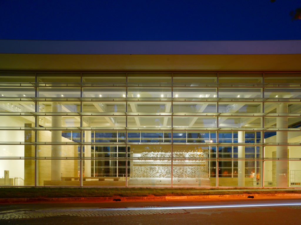 This museum on the bank of the Tiber River has been designed as a renewed setting for the Ara Pacis, a sacrificial altar dating to 9 B.C. and now located on the western edge of the Piazza Augusto Imperatore. Planned as part of an effort to protect Rome’s cultural legacy, the new structure replaces the monument’s previous enclosure, which was in a state of advanced decay. The structure consists of a long, single-story glazed loggia elevated above a shallow podium providing a transparent barrier between the embankment of the Tiber and the existing circular perimeter of the mausoleum of Augustus, built circa 28 B.C.