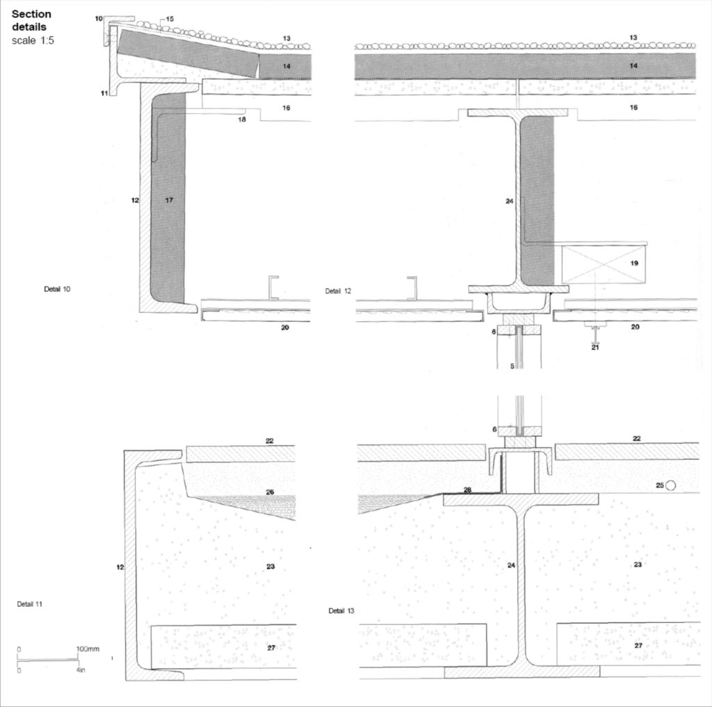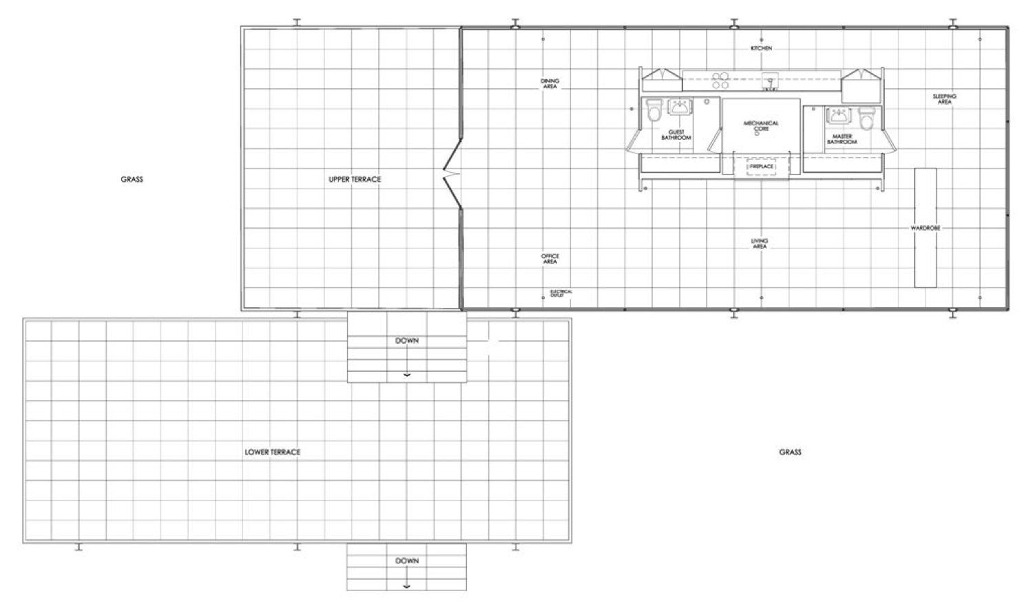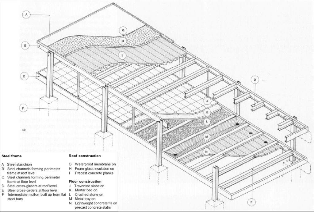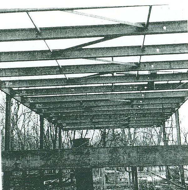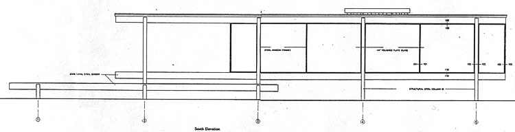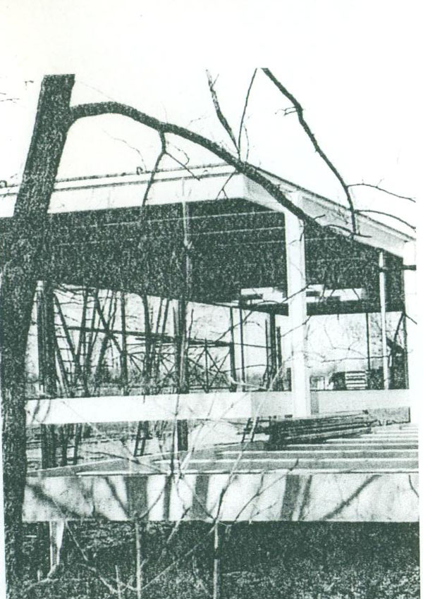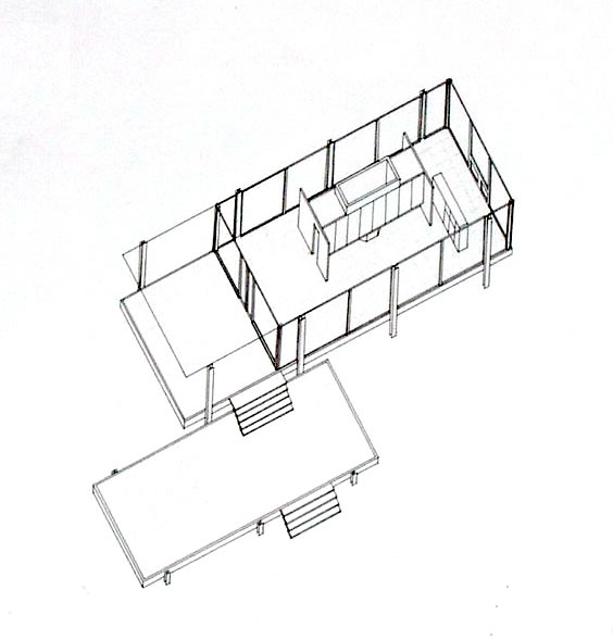 This entirely open glass pavilion is Mies's most radical domestic design. Meant to serve as a weekend getaway house on a secluded wooded site near the fox River, the house deploys eight L-shaped steel columns to support roof and floor frameworks. Engineered for maximum lightness, the mullions that stretch from roof to floor between window planes also help support the floor plate. The steel is highly finished and painted white, in dramatic contrast to the black enamel clothing IIT't steel frames.