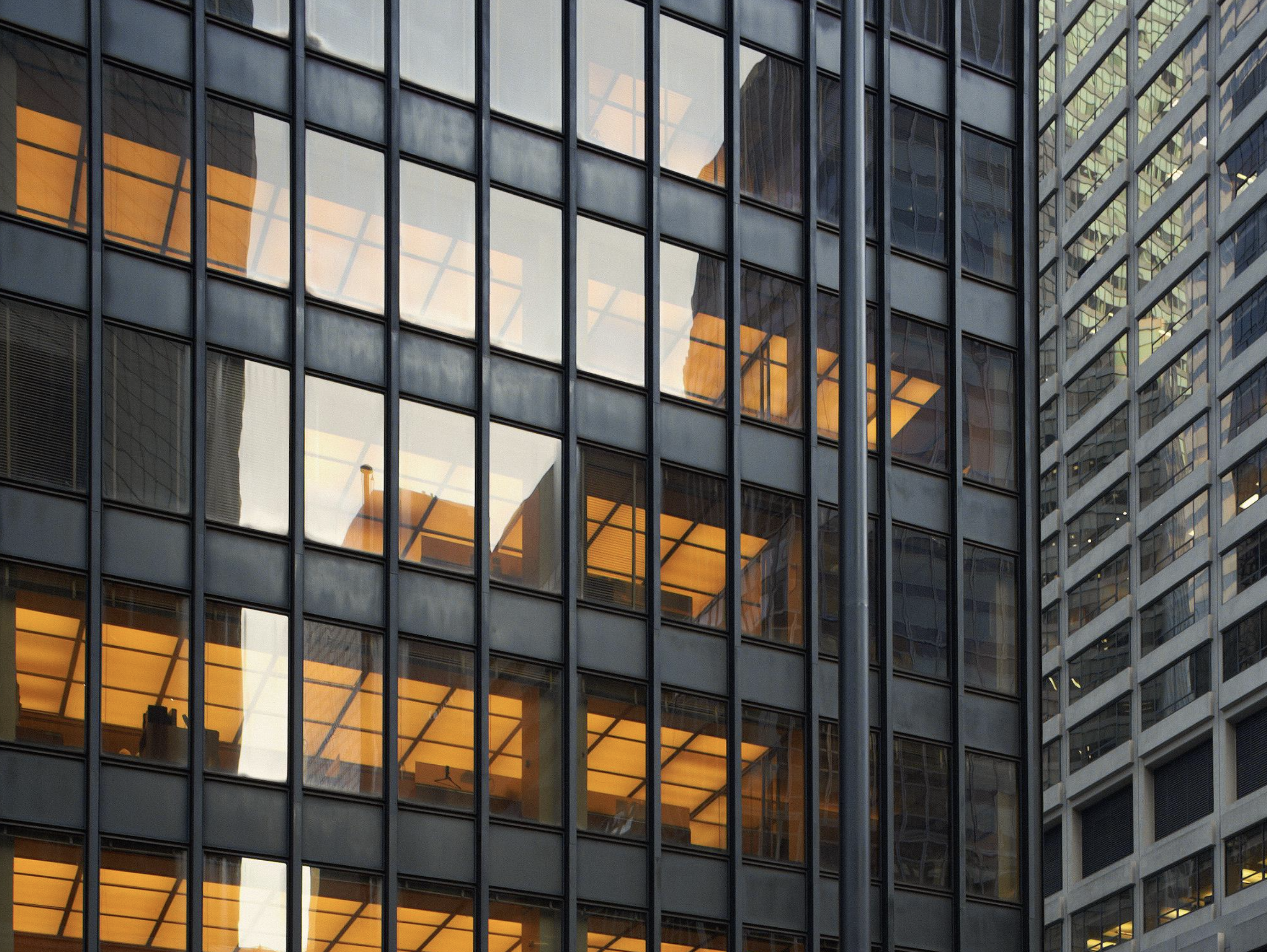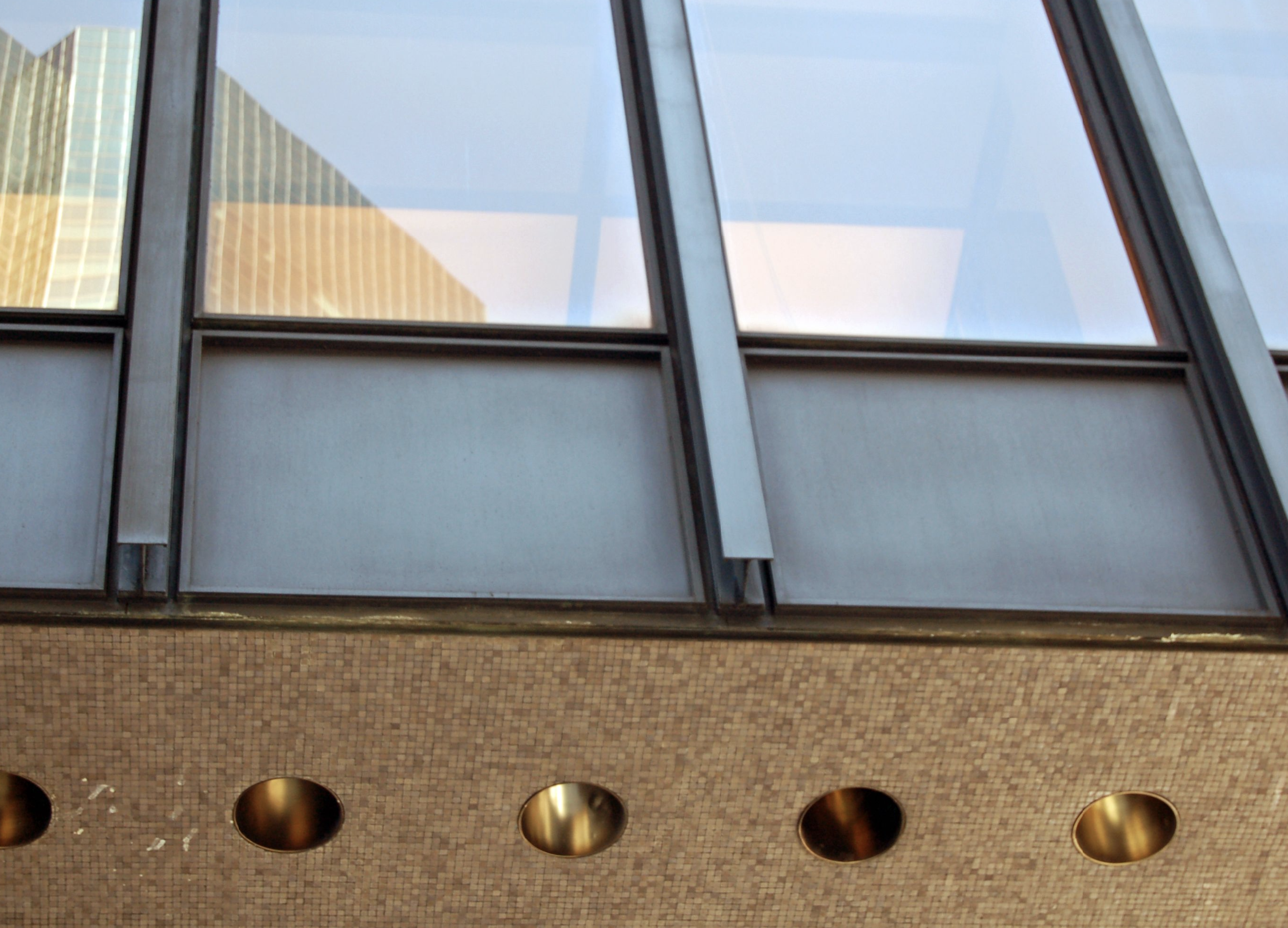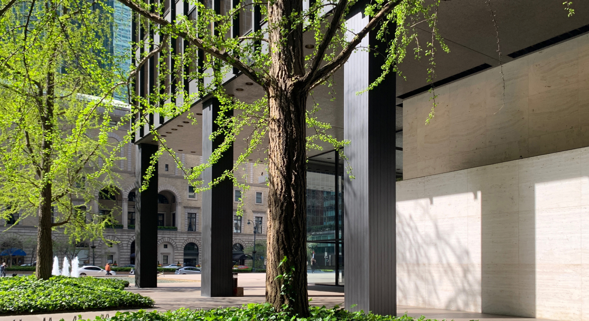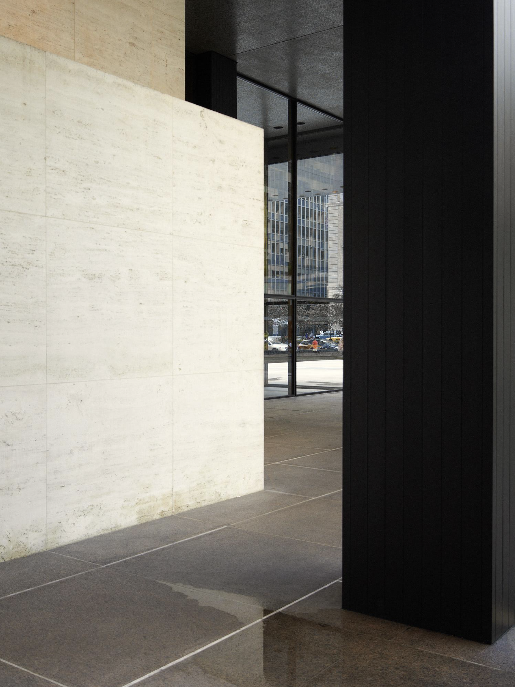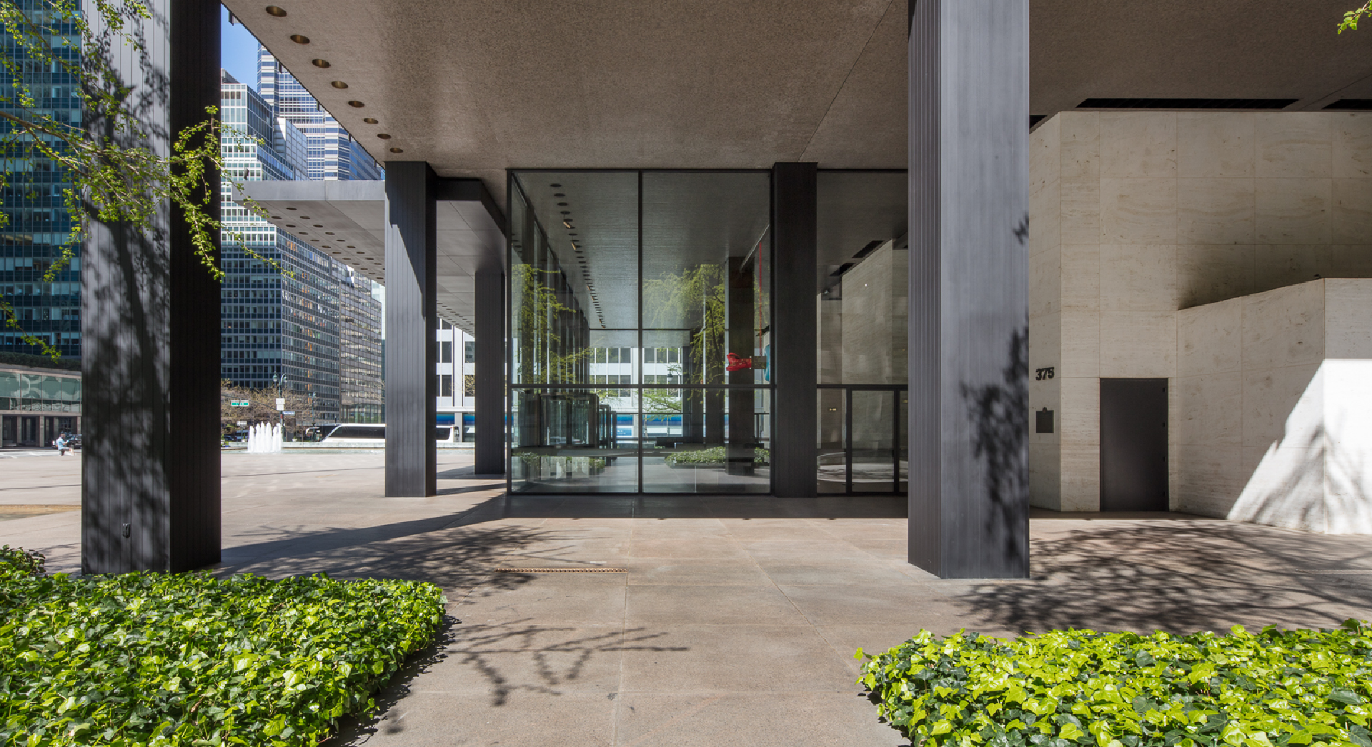 In Chicago Mies experimented with cladding the steel frame within a curtain wall of glass. Having no structural role beyond supporting its own weight means that a curtain wall can have minimal structural components, such as the frames carrying the sheets of glass, leaving maximum area for the glazing. The idea was not entirely new, but at the Seagram the system was refined to produce a shimmering skin of amazing sophistication and sleekness with slender steel mullions of the smallest possible dimension.