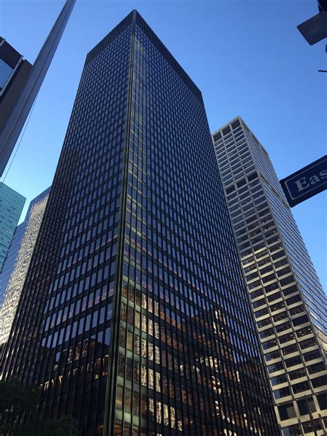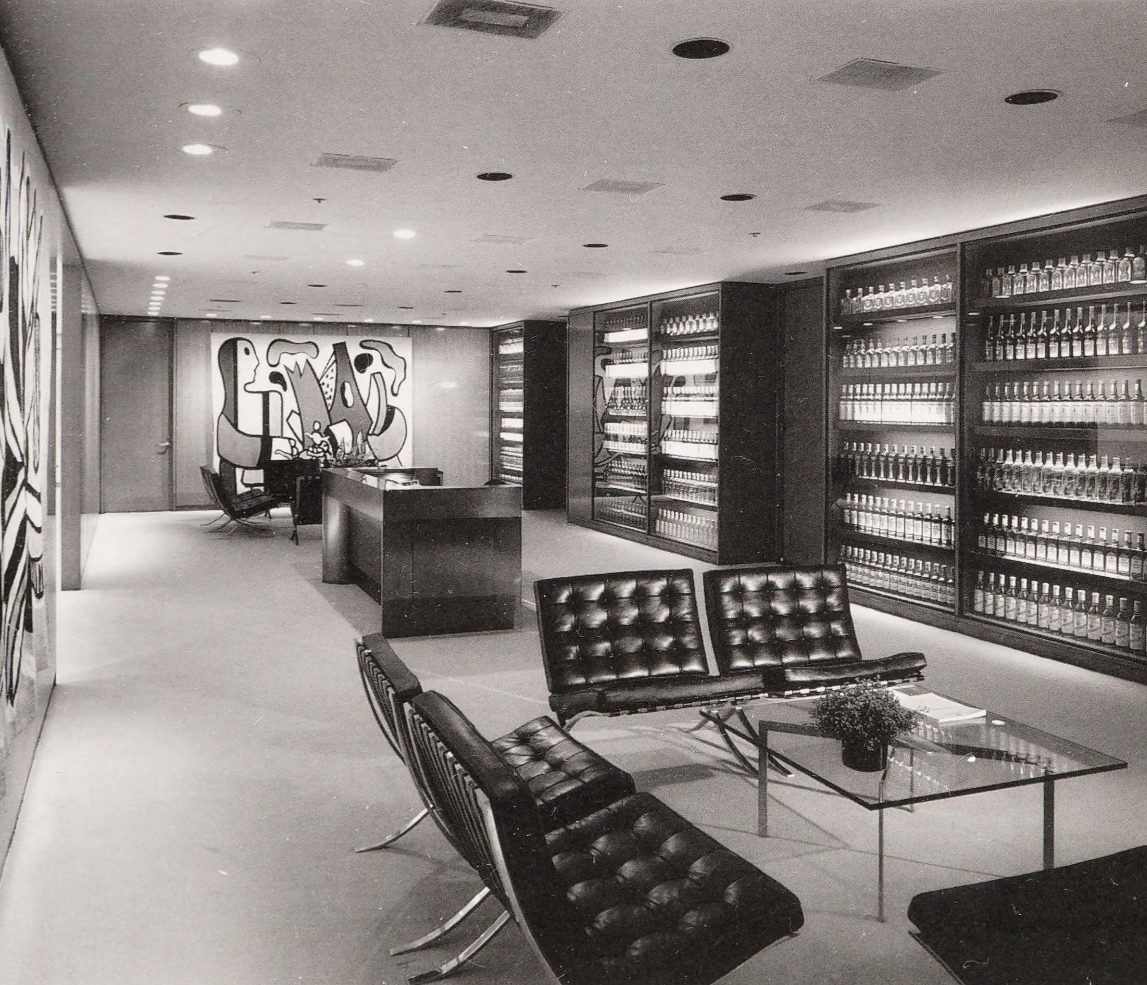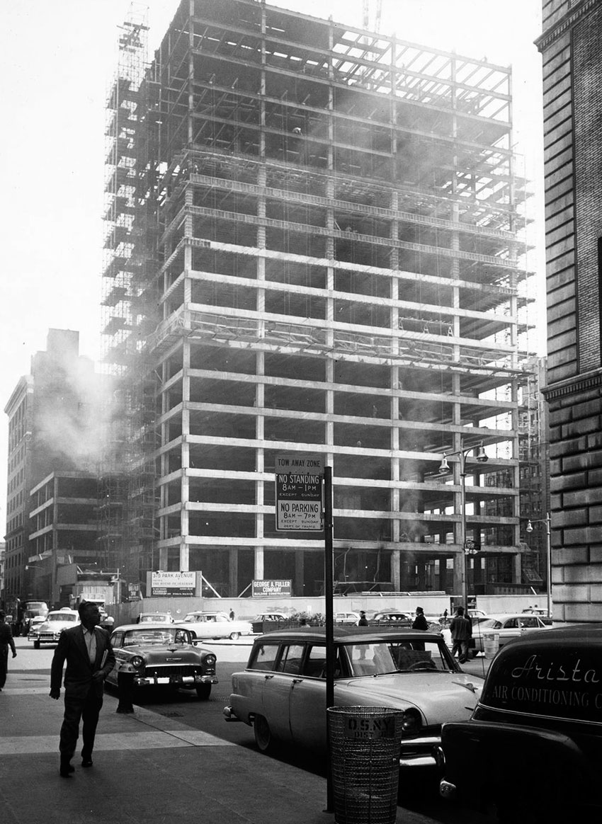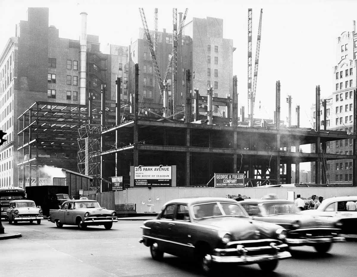 by Mies van der Rohe that fully defines the aesthetic and time of high modernism, the era of postwar corporate and urban consciousness. In glass, steel, and bronze, the Seagram symbolizes the bricks and mortar and martinis that were the 1950s.