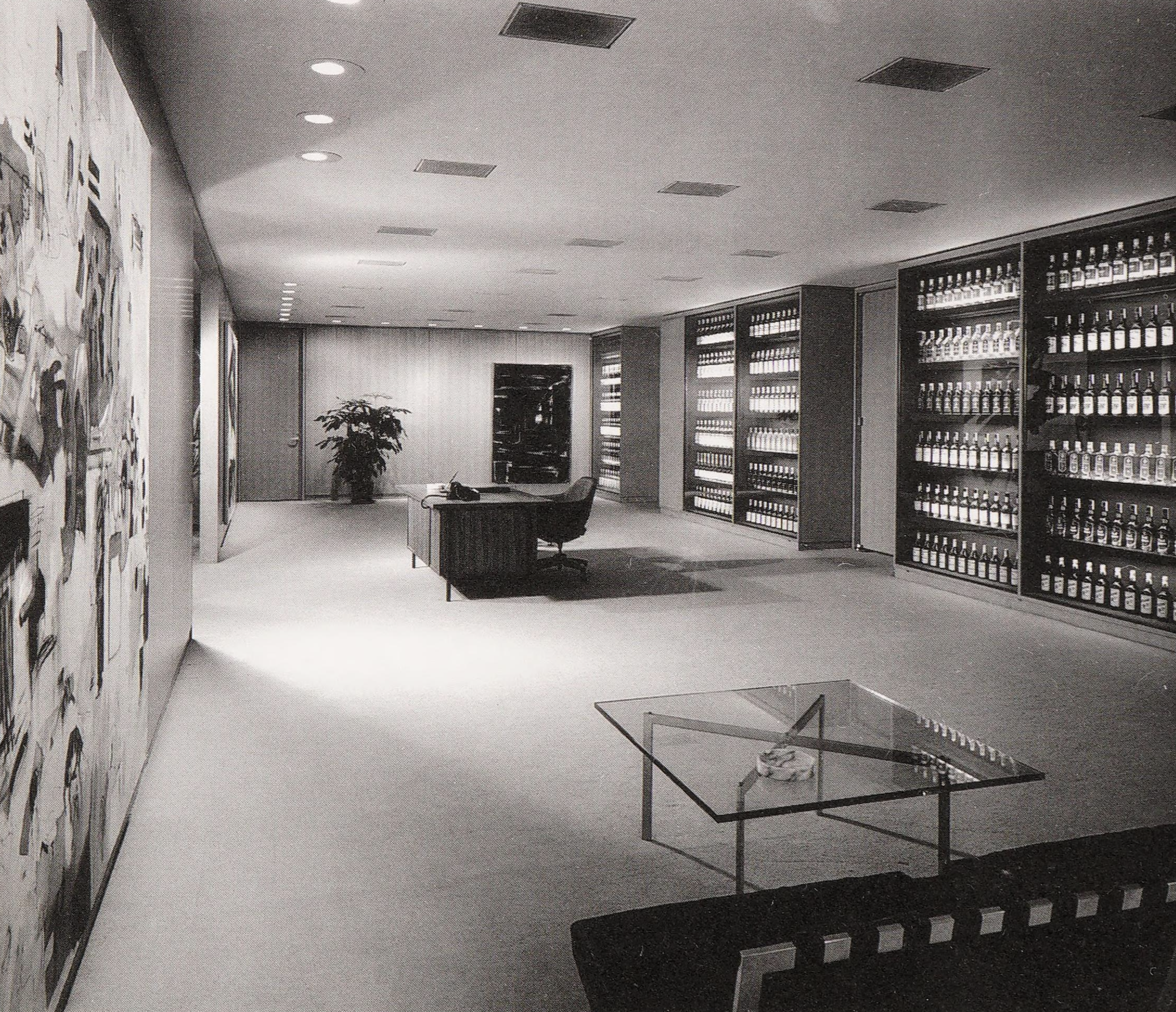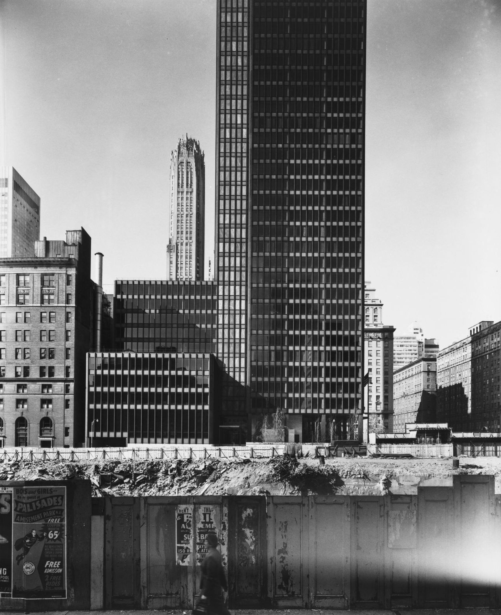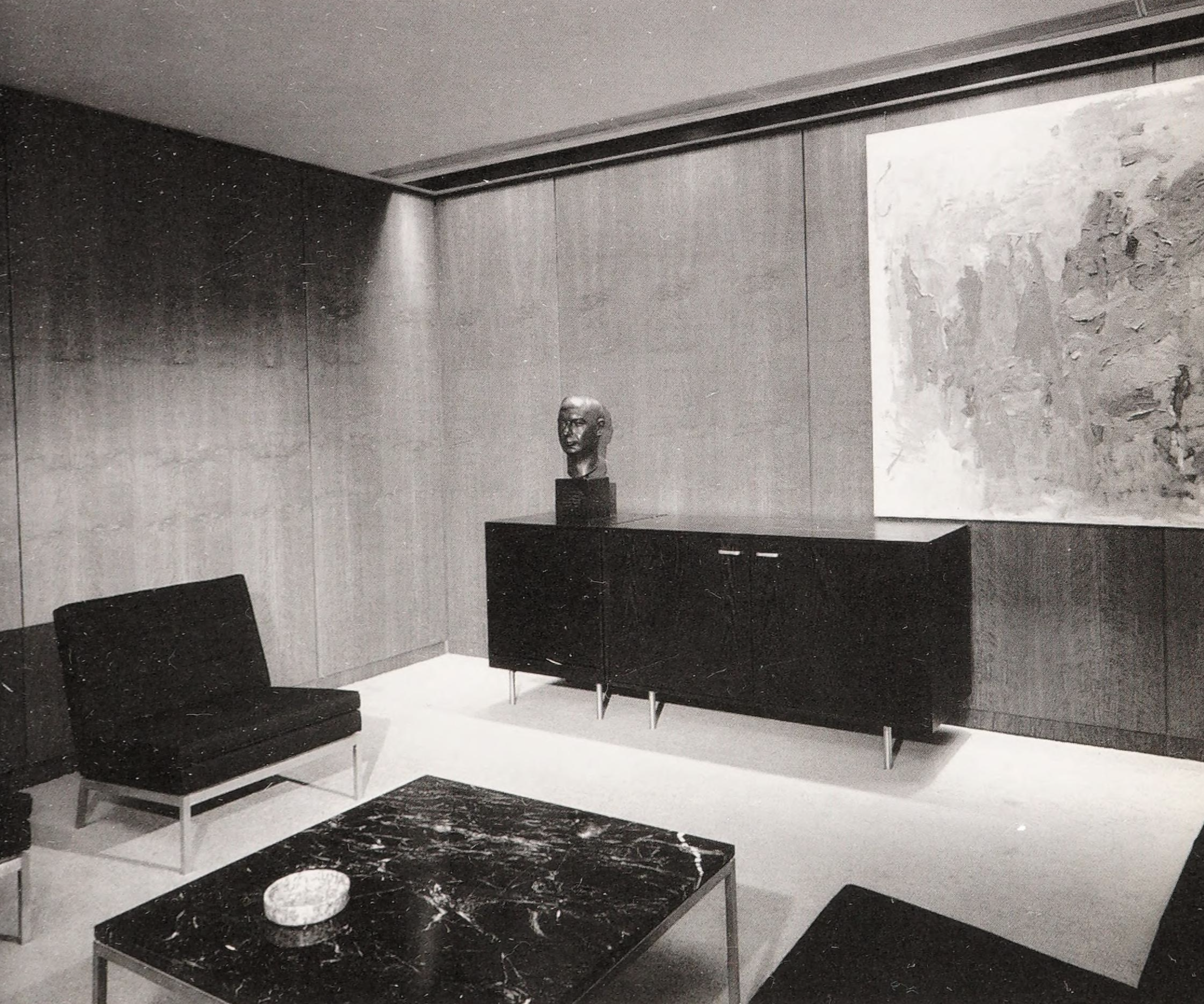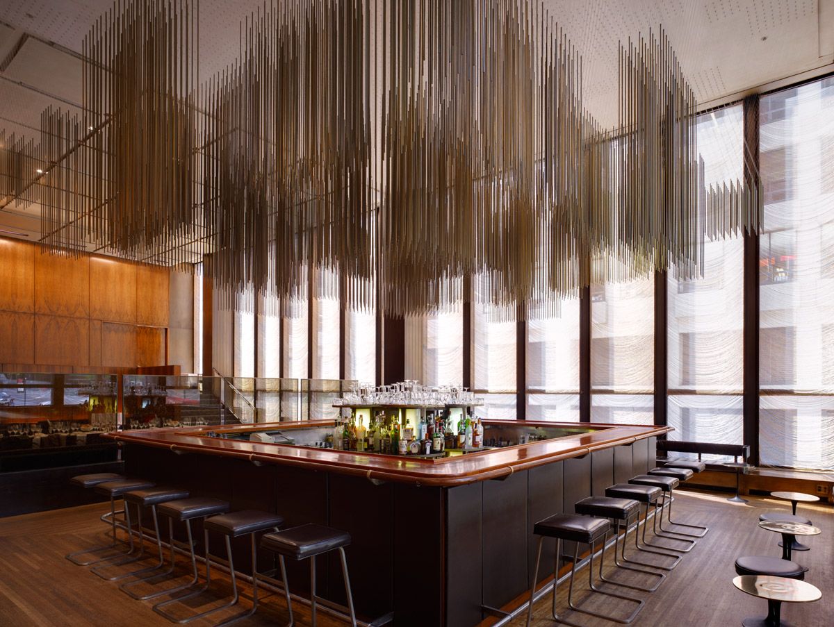 by Mies van der Rohe that fully defines the aesthetic and time of high modernism, the era of postwar corporate and urban consciousness. In glass, steel, and bronze, the Seagram symbolizes the bricks and mortar and martinis that were the 1950s.