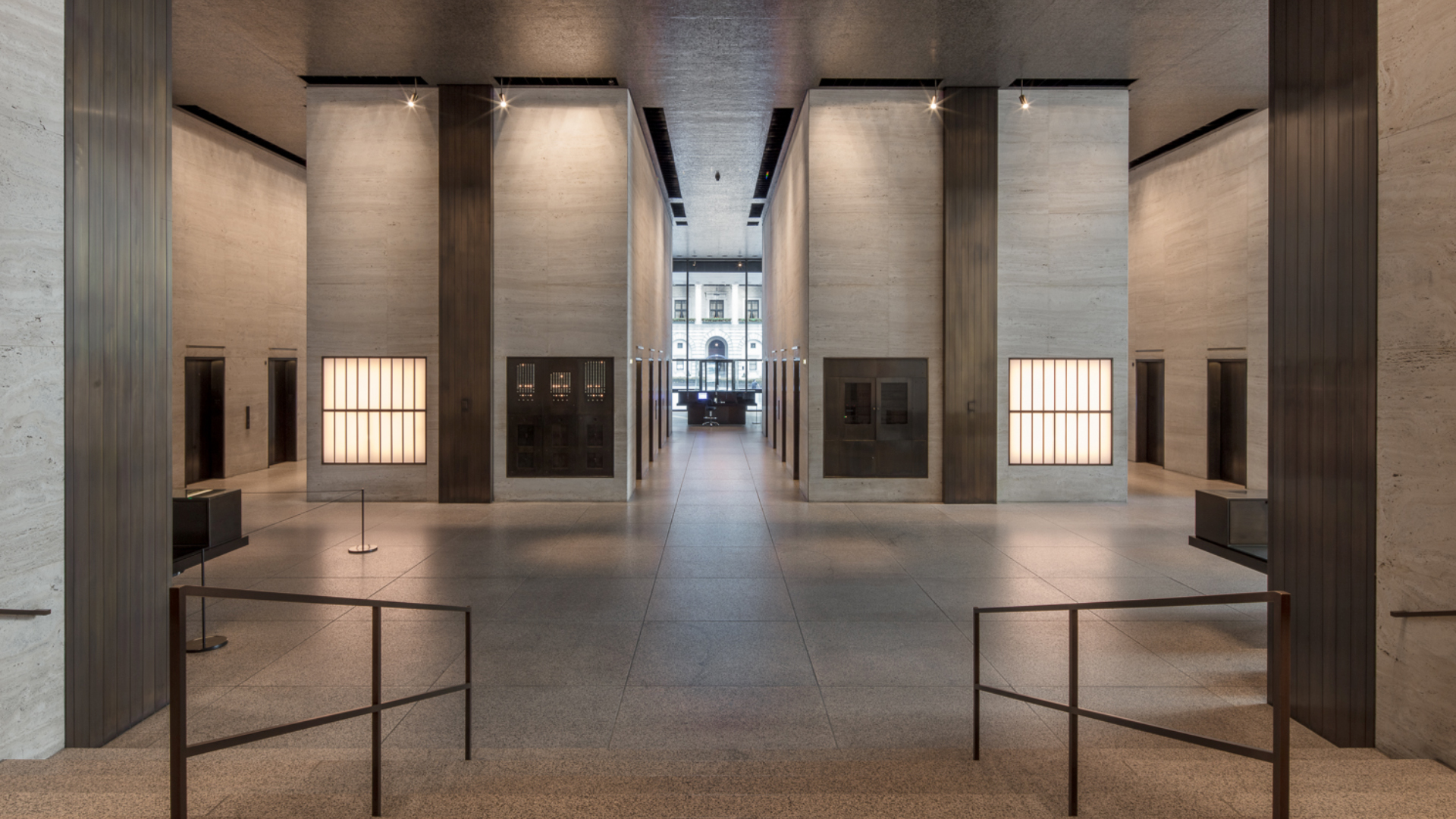 Although minimal in detail, the interior has dignity and beauty – and this is to do with proportion. The effect is particularly obvious in the entrance hall, where Mies achieves elegance in a simple manner: the fully glazed walls offer views out and let maximum light in. As Mies said, in imitation of a line in an 1855 poem by Robert Browning, ‘less is more’.