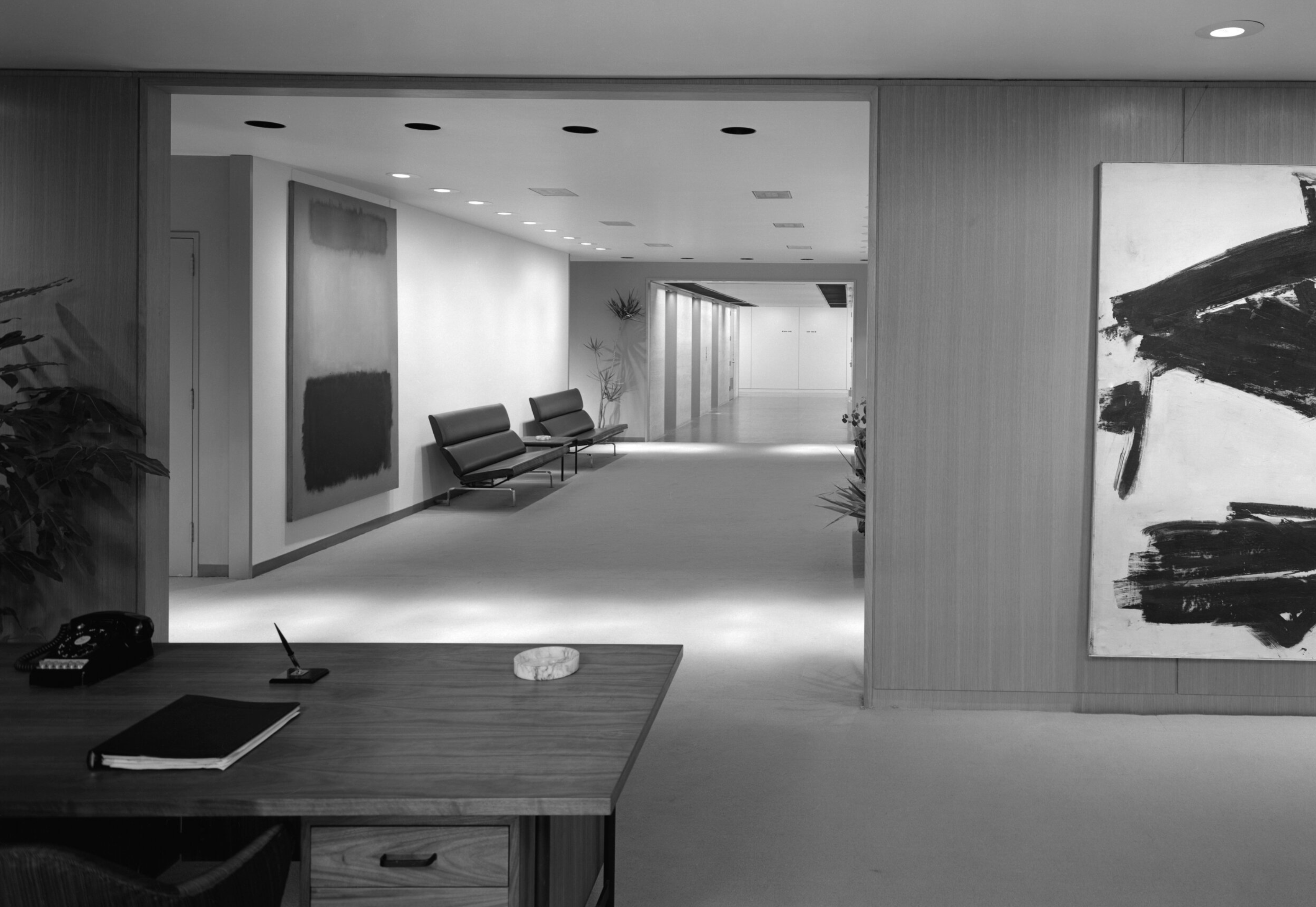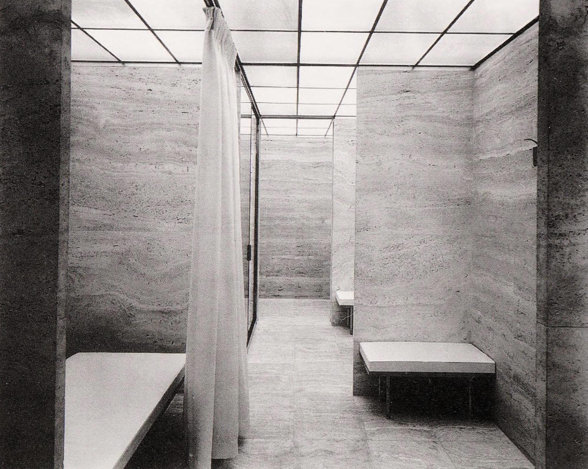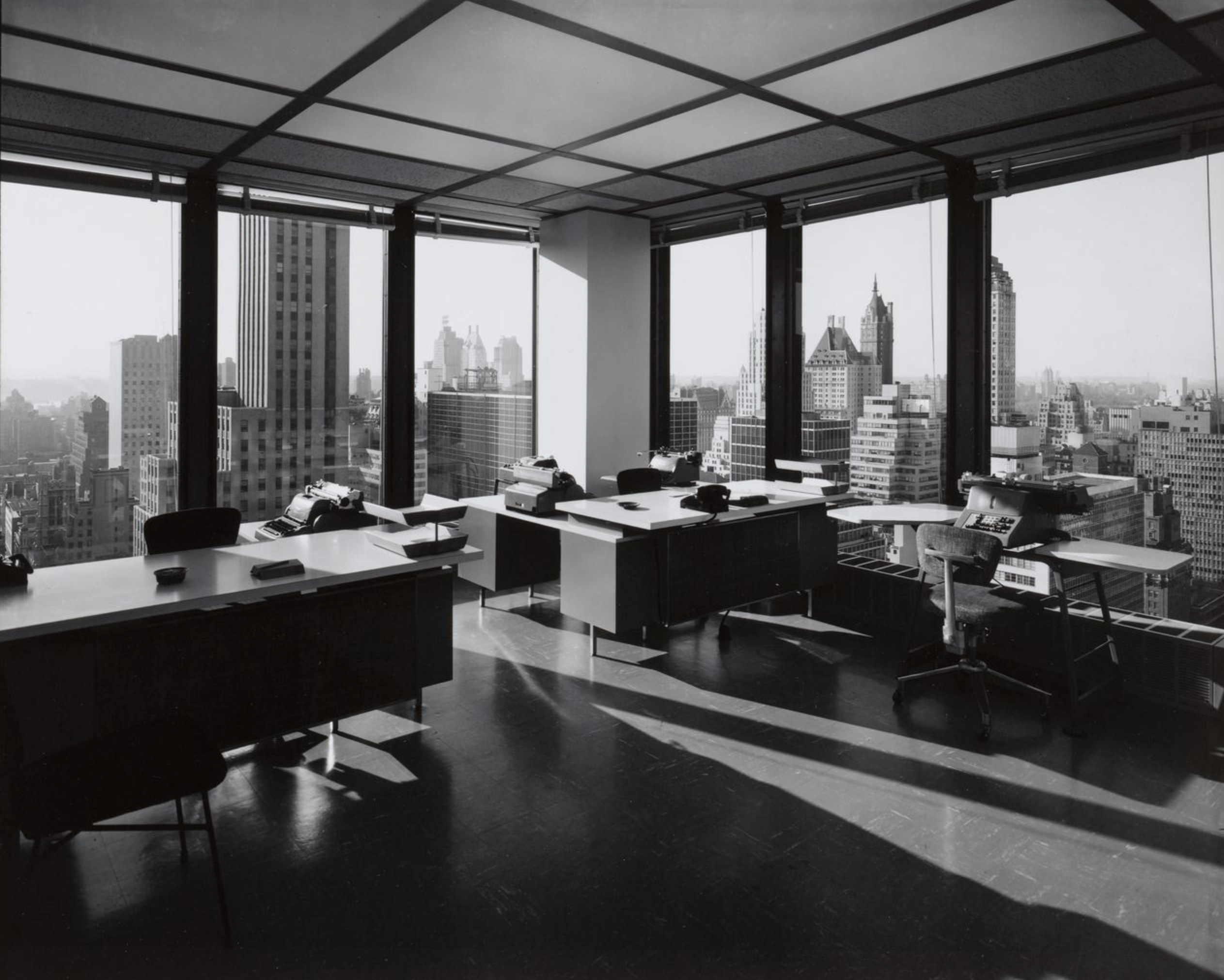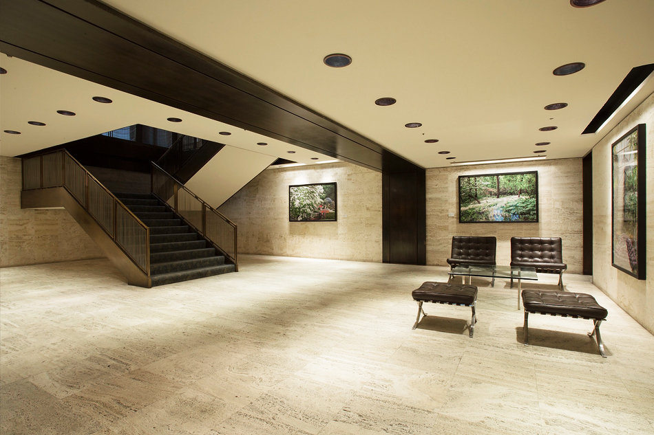 Inside, the functional and artistic advantage of Mies’ structural system is immediately clear. The interior is open, with no structural walls beyond those enclosing the central service core. Light floods in through the floor-to-ceiling glazing of the curtain wall and the space can be used in virtually any way desired.