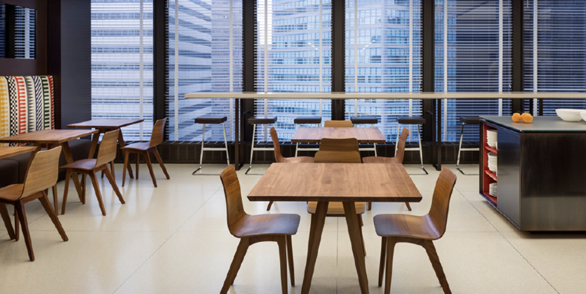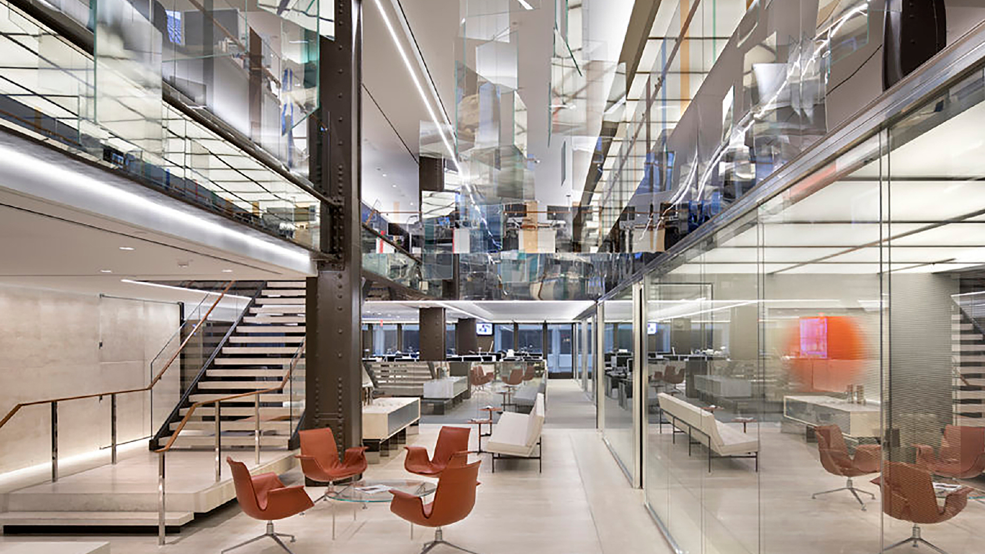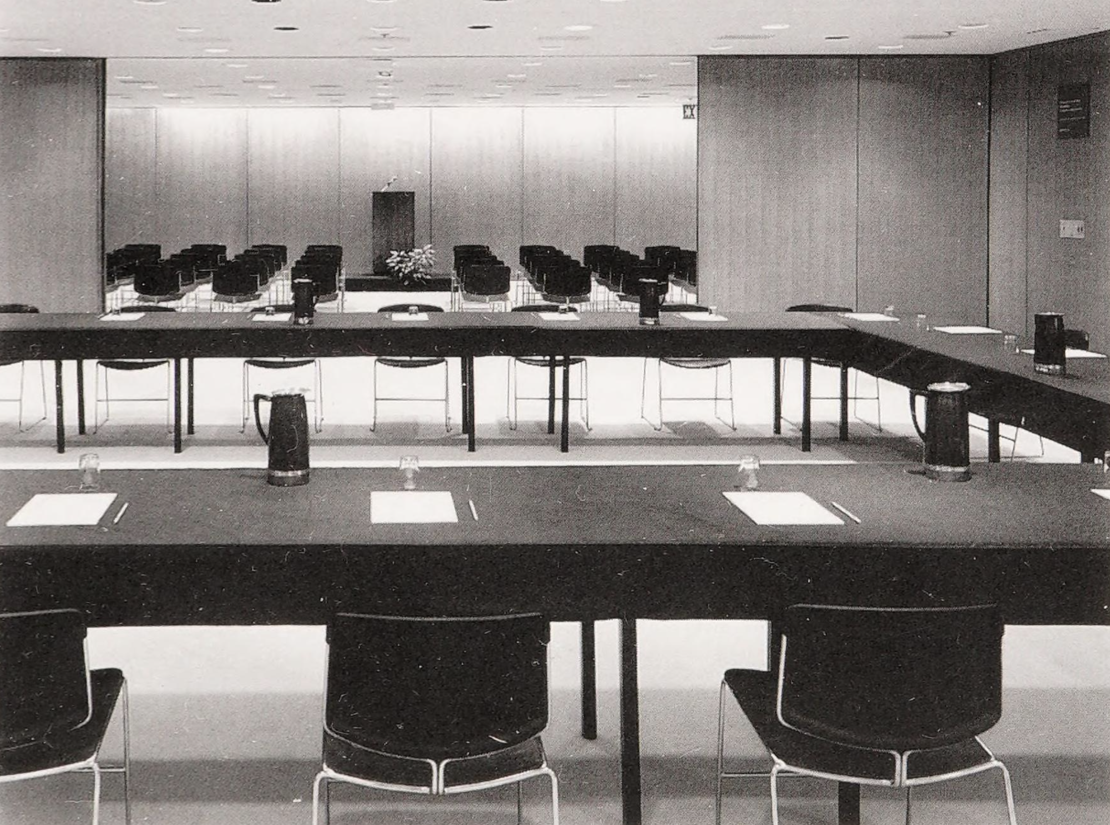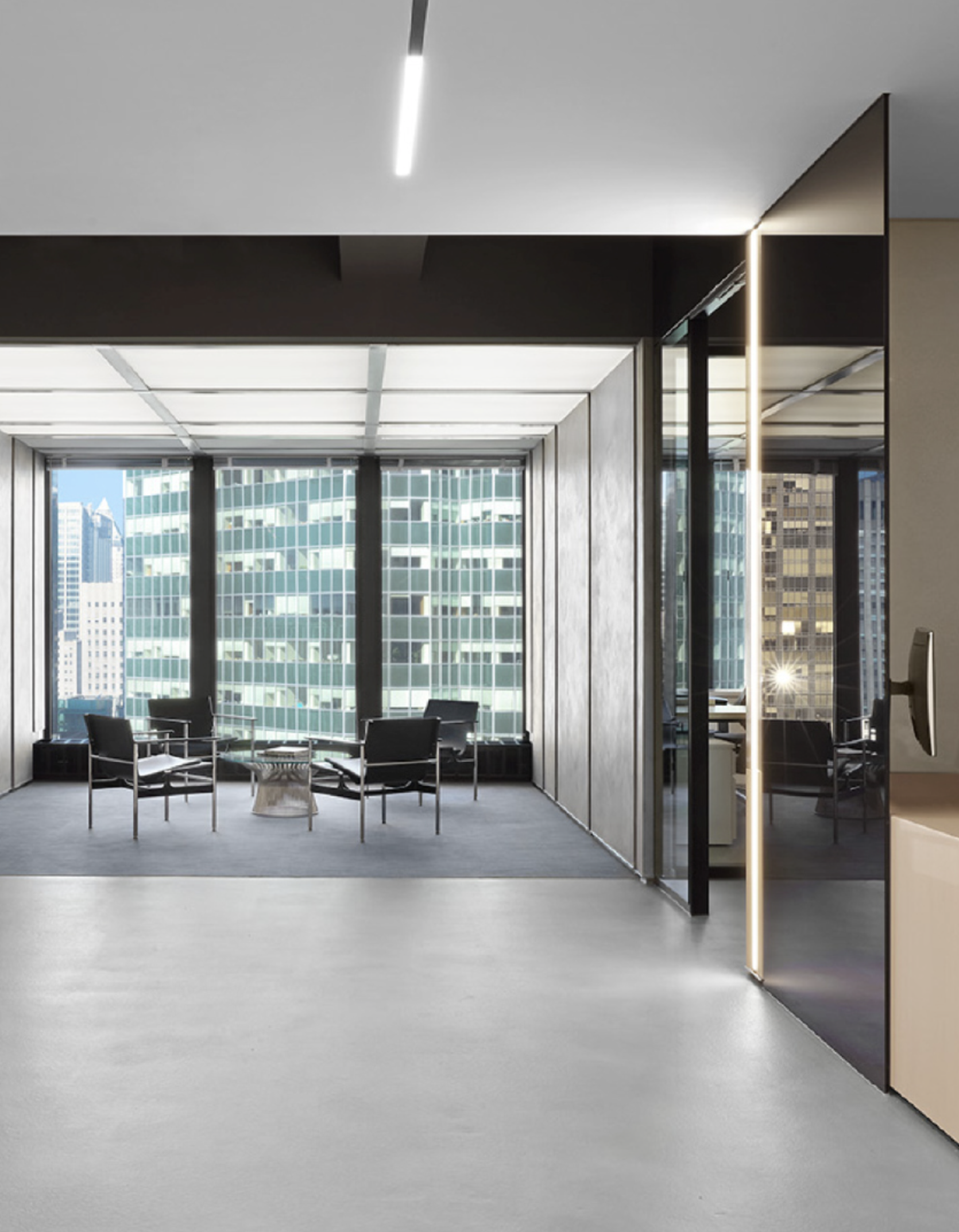 Inside, the functional and artistic advantage of Mies’ structural system is immediately clear. The interior is open, with no structural walls beyond those enclosing the central service core. Light floods in through the floor-to-ceiling glazing of the curtain wall and the space can be used in virtually any way desired.