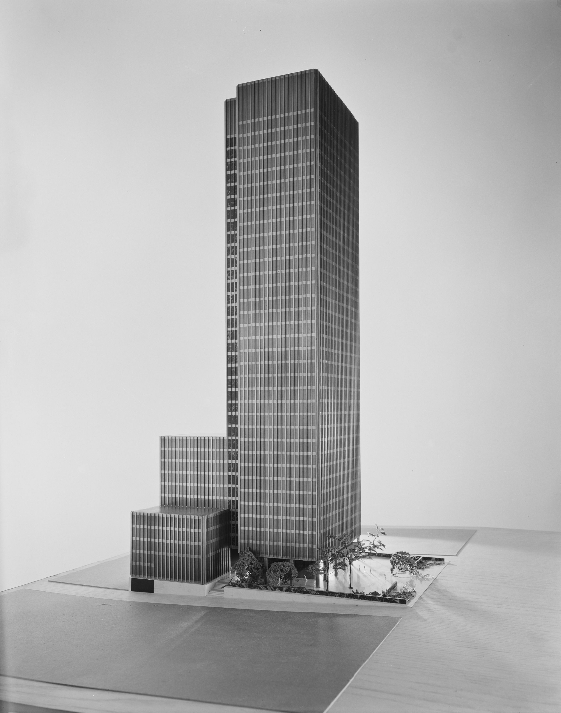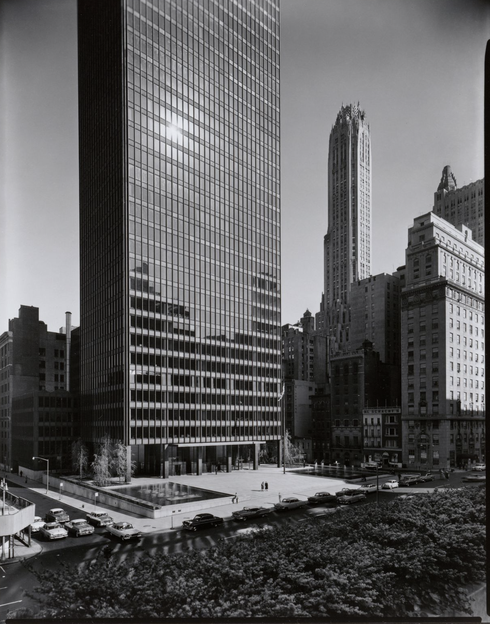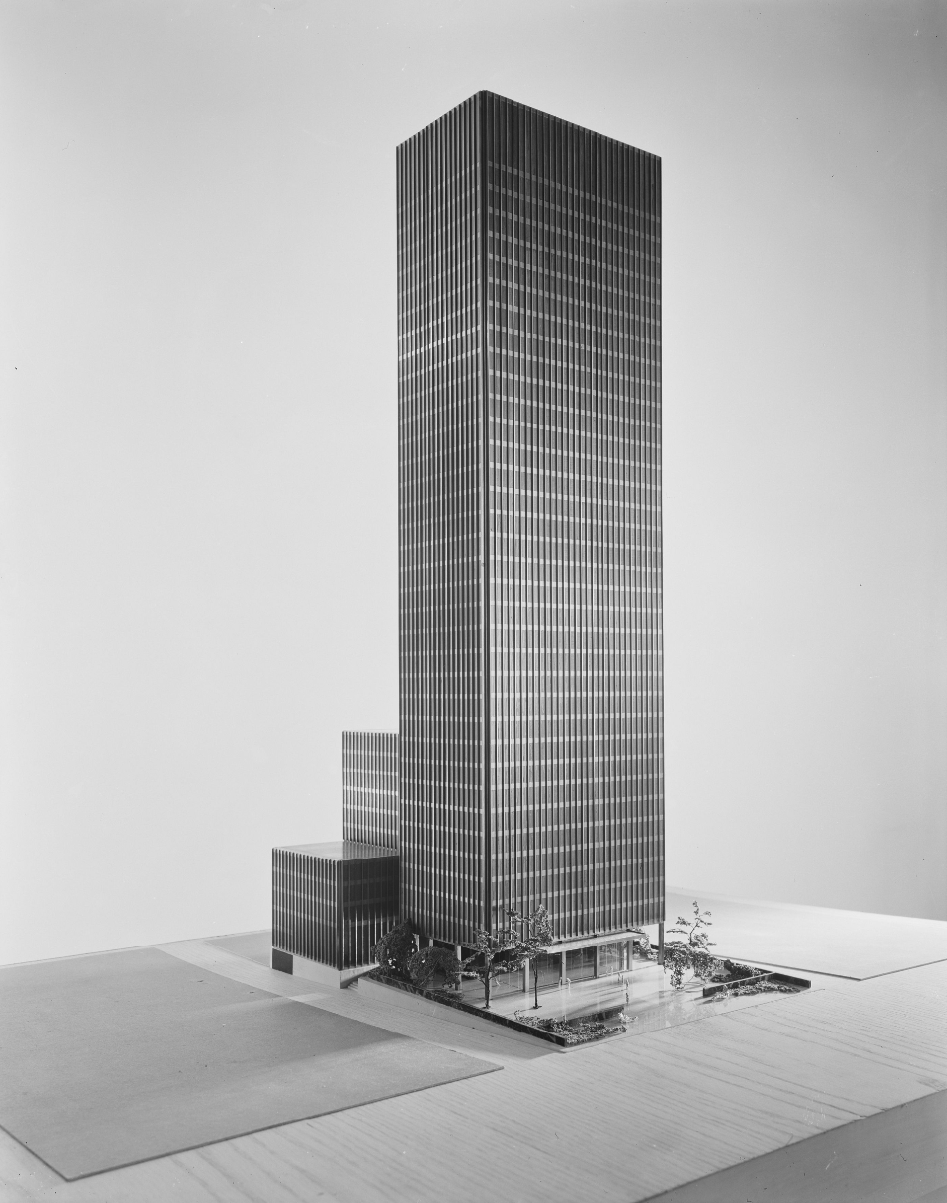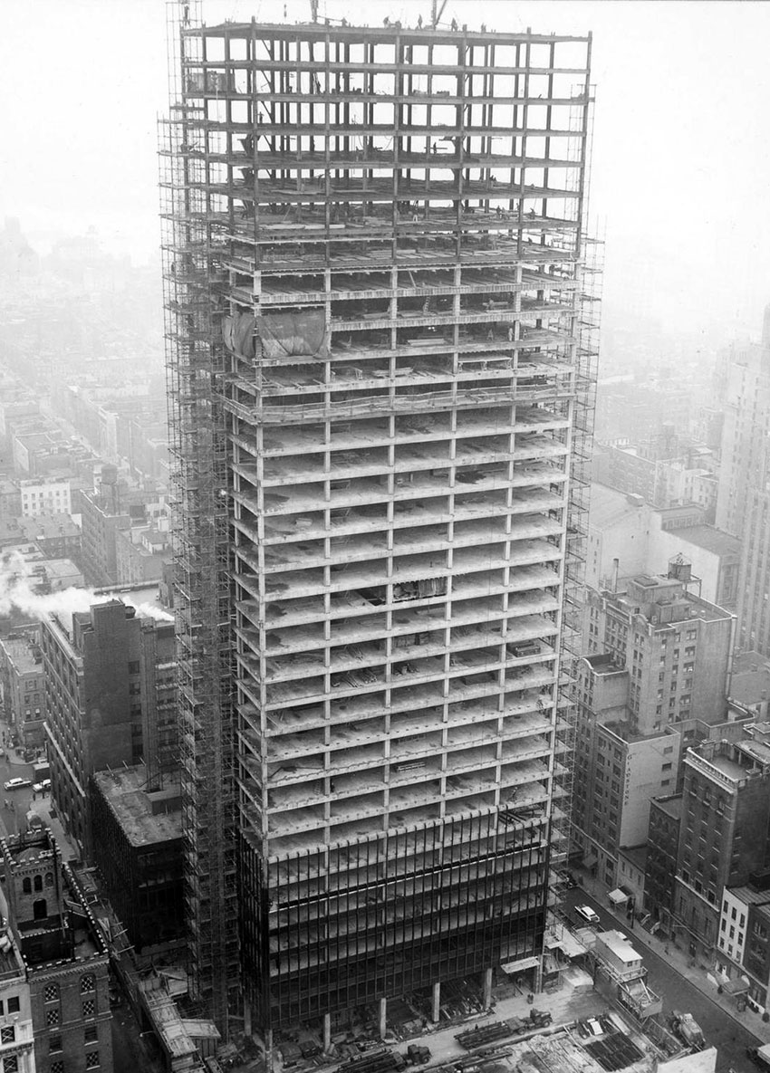 Mies had been at the forefront of high-rise architecture, evolving radical ideas for sheer towers of steel and glass while working in Germany before the Second World War. In the United States he developed these ideas, notably and initially at the Lake Shore Apartments in Chicago, which were completed in 1951.