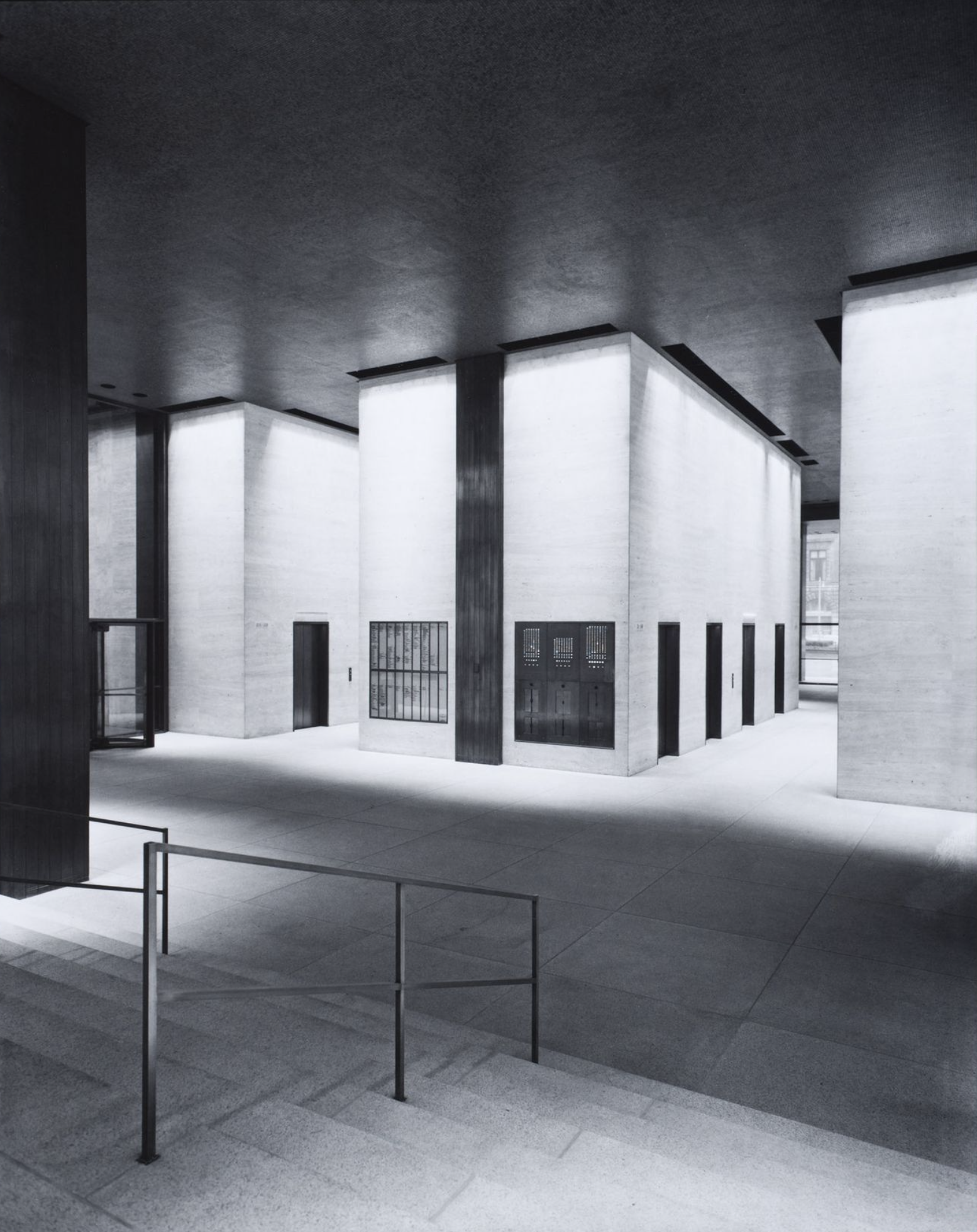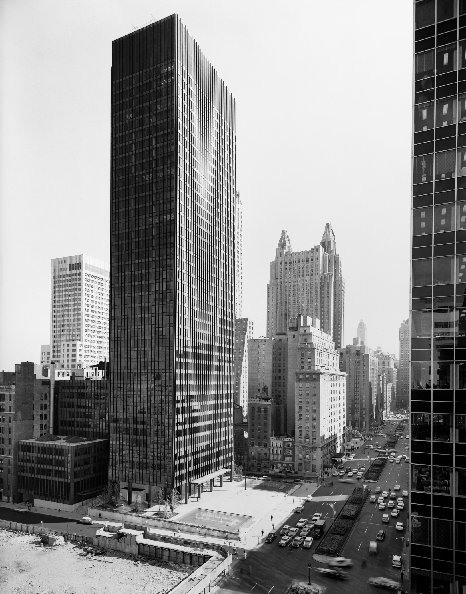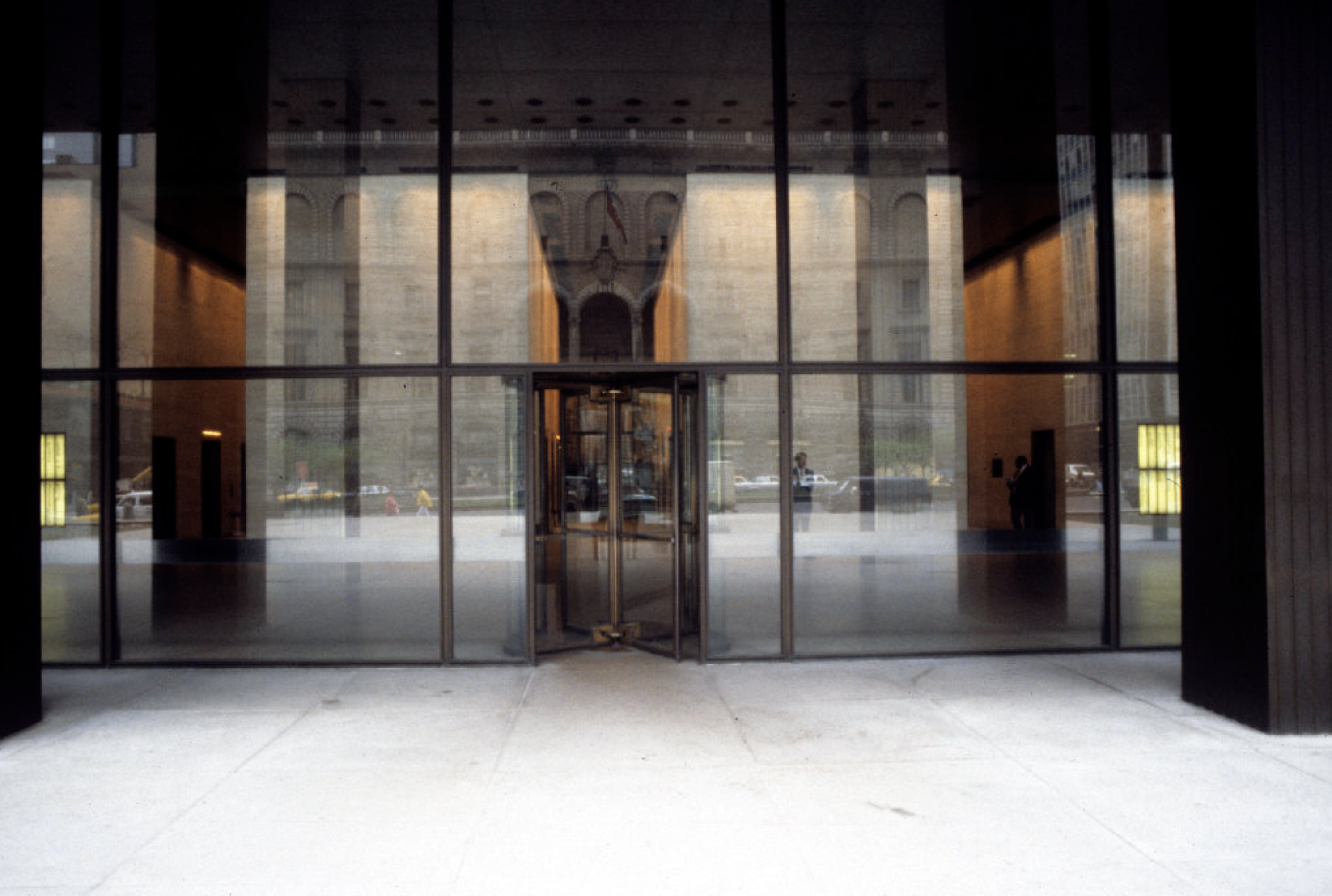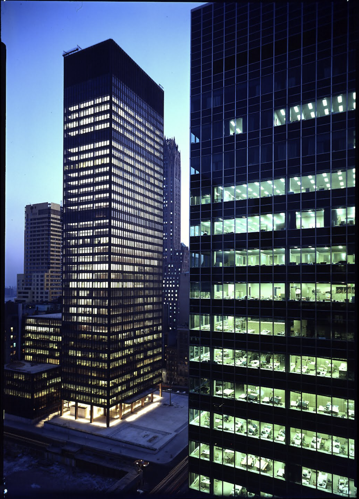 The Seagram, a 40-story slab skyscraper of amber glass within a grid of bronze I beams, rises above a fountained plaza on Manhattan’s Park Avenue. The body of the building, in typical Mies fashion, is supported by a templelike entry that is reminiscent, within a thoroughly modern composition, of the earliest post-and-lintel roots of archaic architecture. The design is of interest not only for the glass slab that rises suavely above mid-town Manhattan but also for the invention of the plaza fronting Park Avenue and the resulting relationship of urban architectural object to its opposition, void space, within the city grid. Architectural historian William H.Jordy, in his definitive analysis of the building, spoke of the Seagram as modern expression of “the potential of structure to create noble order, in the sense in which it created noble order in the past” coupled with “truth of its time.”
