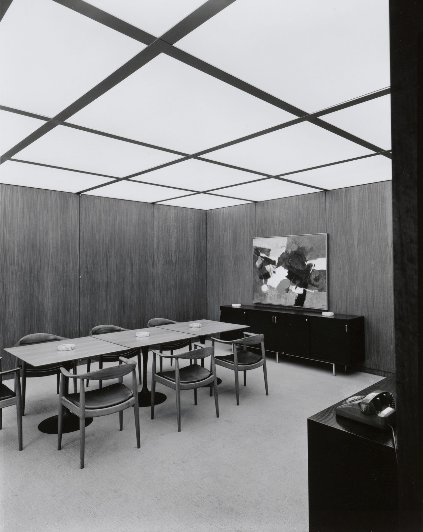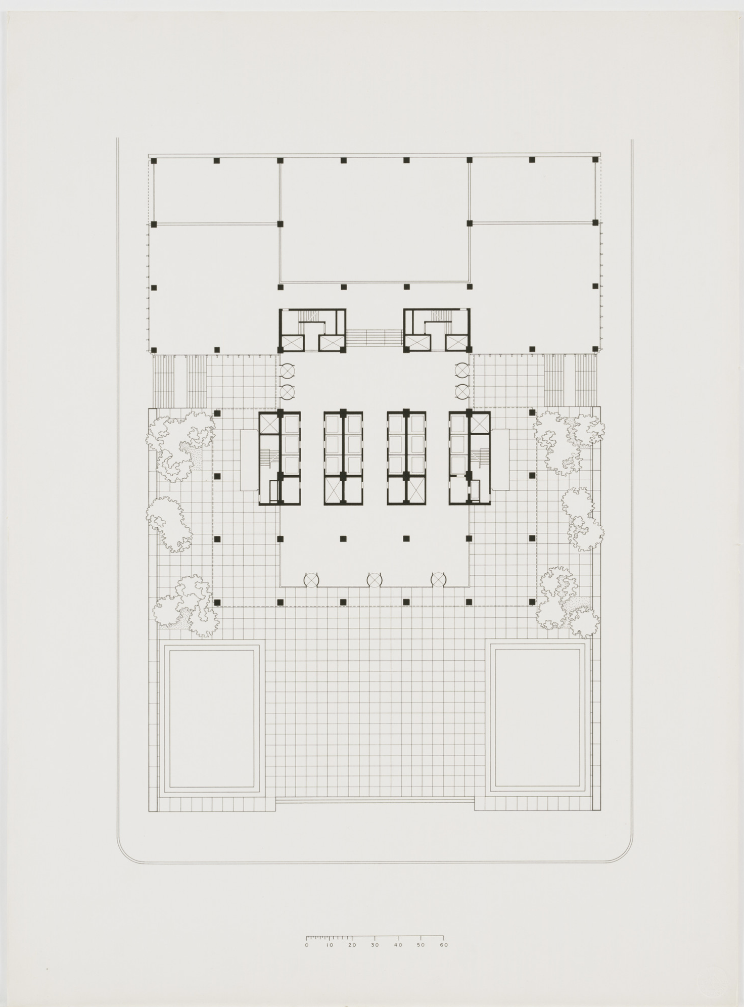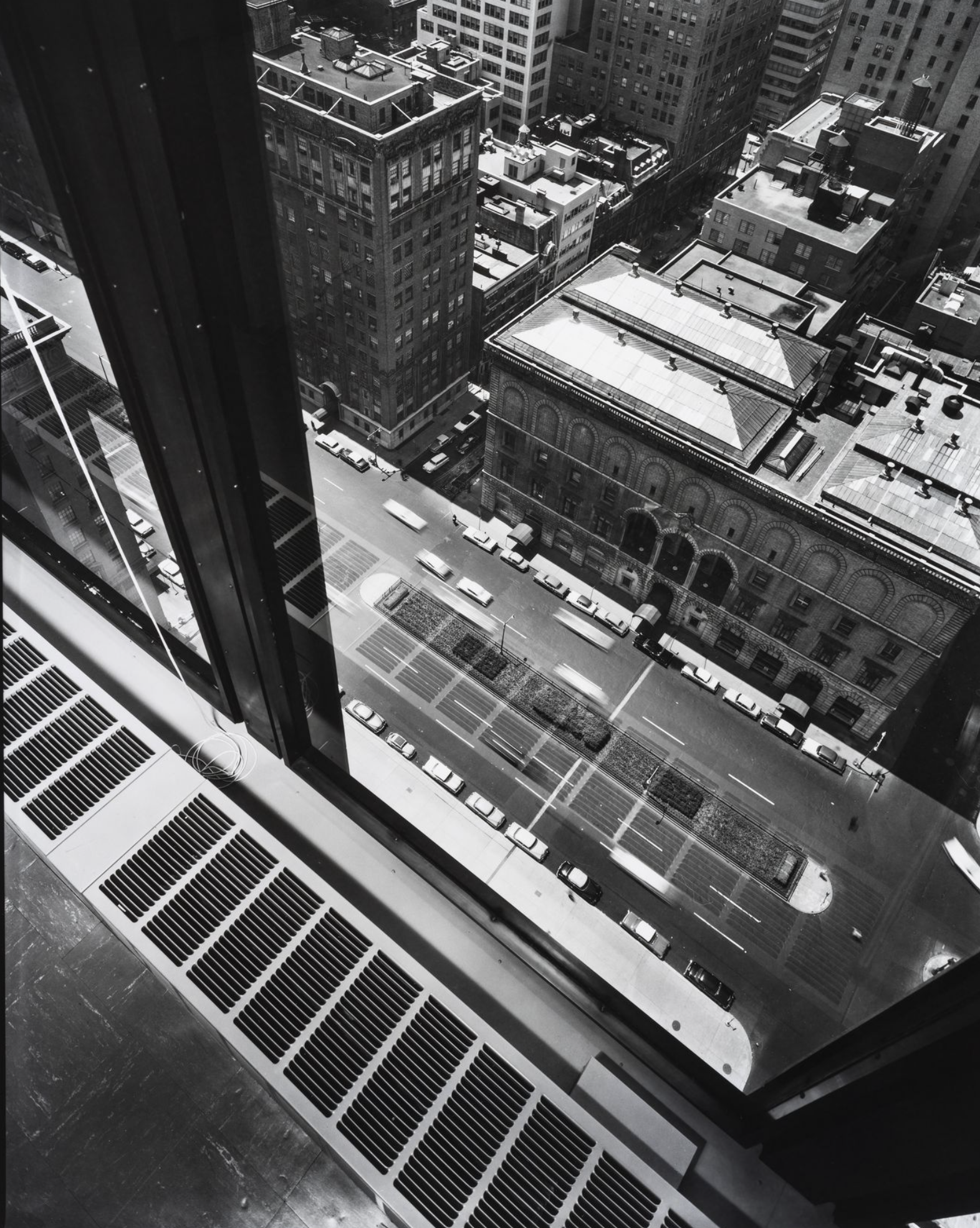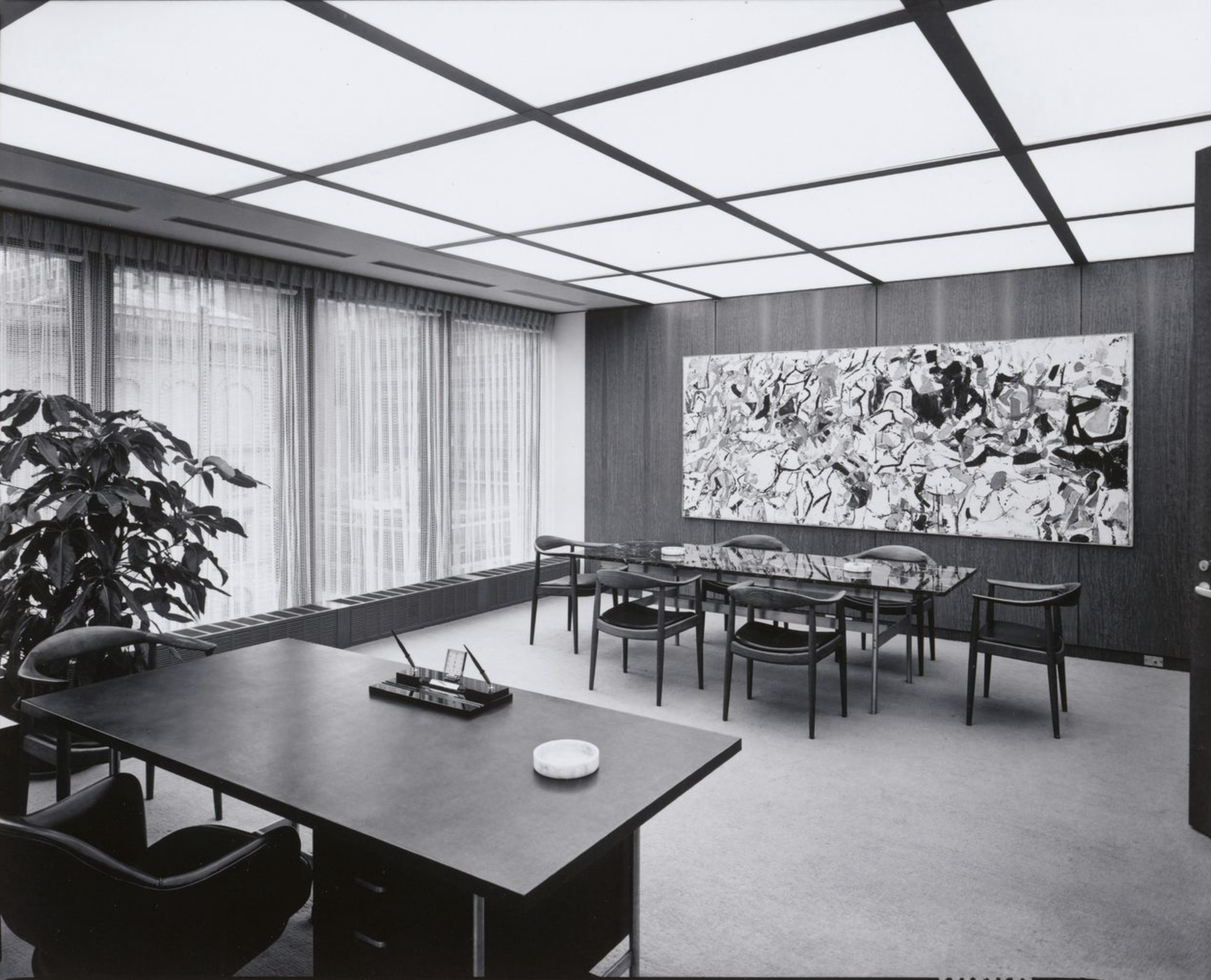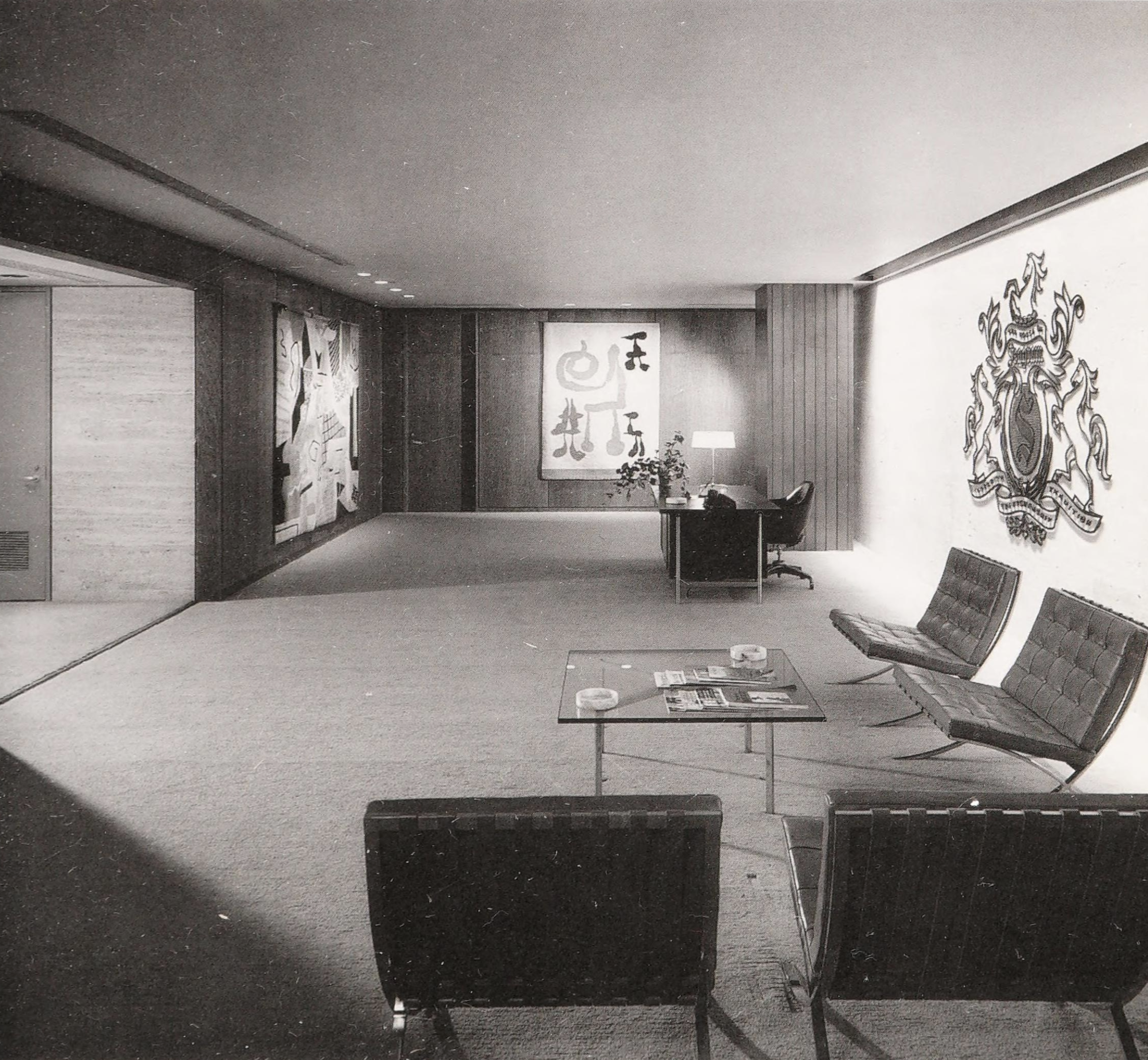 The Seagram, a 40-story slab skyscraper of amber glass within a grid of bronze I beams, rises above a fountained plaza on Manhattan’s Park Avenue. The body of the building, in typical Mies fashion, is supported by a templelike entry that is reminiscent, within a thoroughly modern composition, of the earliest post-and-lintel roots of archaic architecture. The design is of interest not only for the glass slab that rises suavely above mid-town Manhattan but also for the invention of the plaza fronting Park Avenue and the resulting relationship of urban architectural object to its opposition, void space, within the city grid. Architectural historian William H.Jordy, in his definitive analysis of the building, spoke of the Seagram as modern expression of “the potential of structure to create noble order, in the sense in which it created noble order in the past” coupled with “truth of its time.”