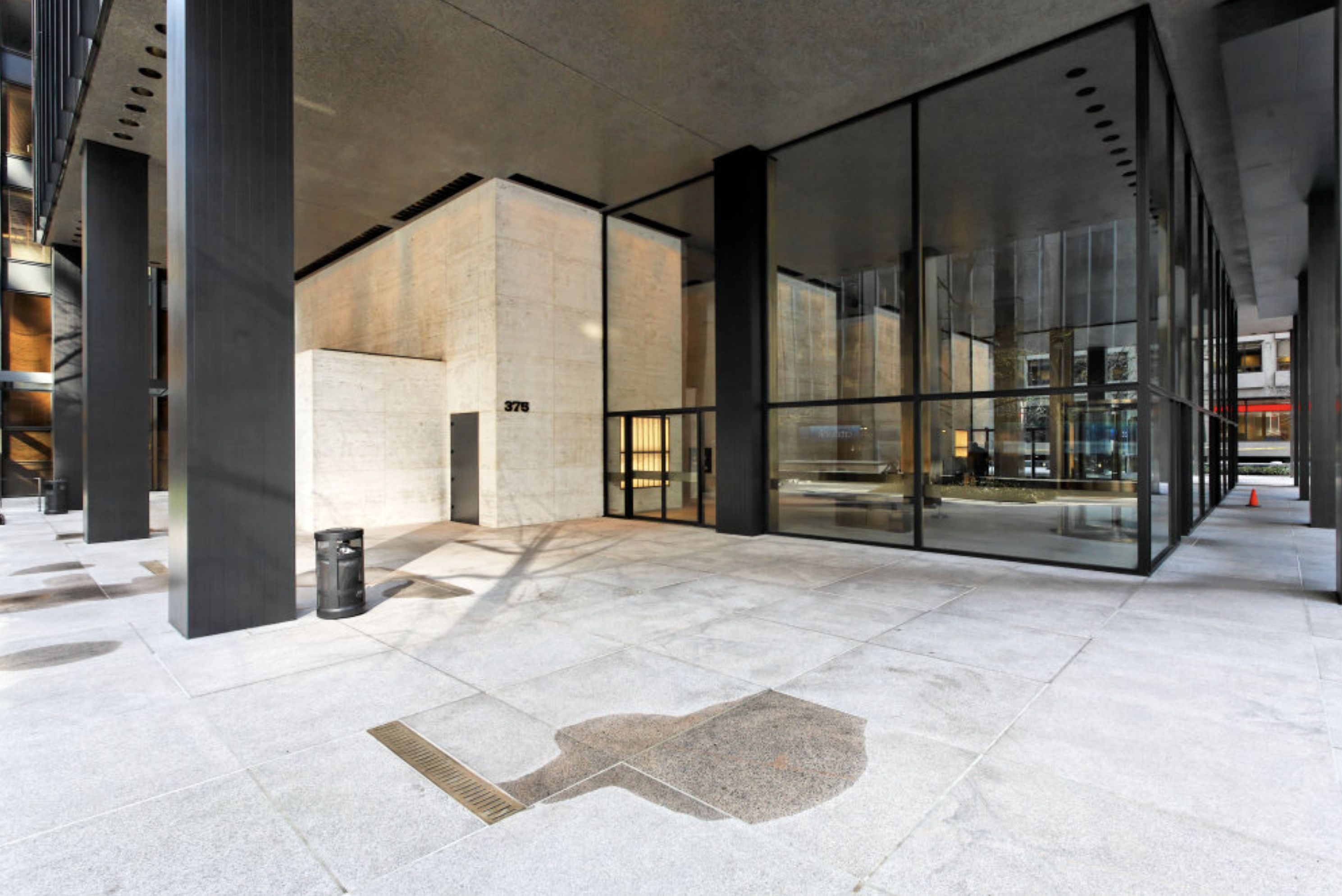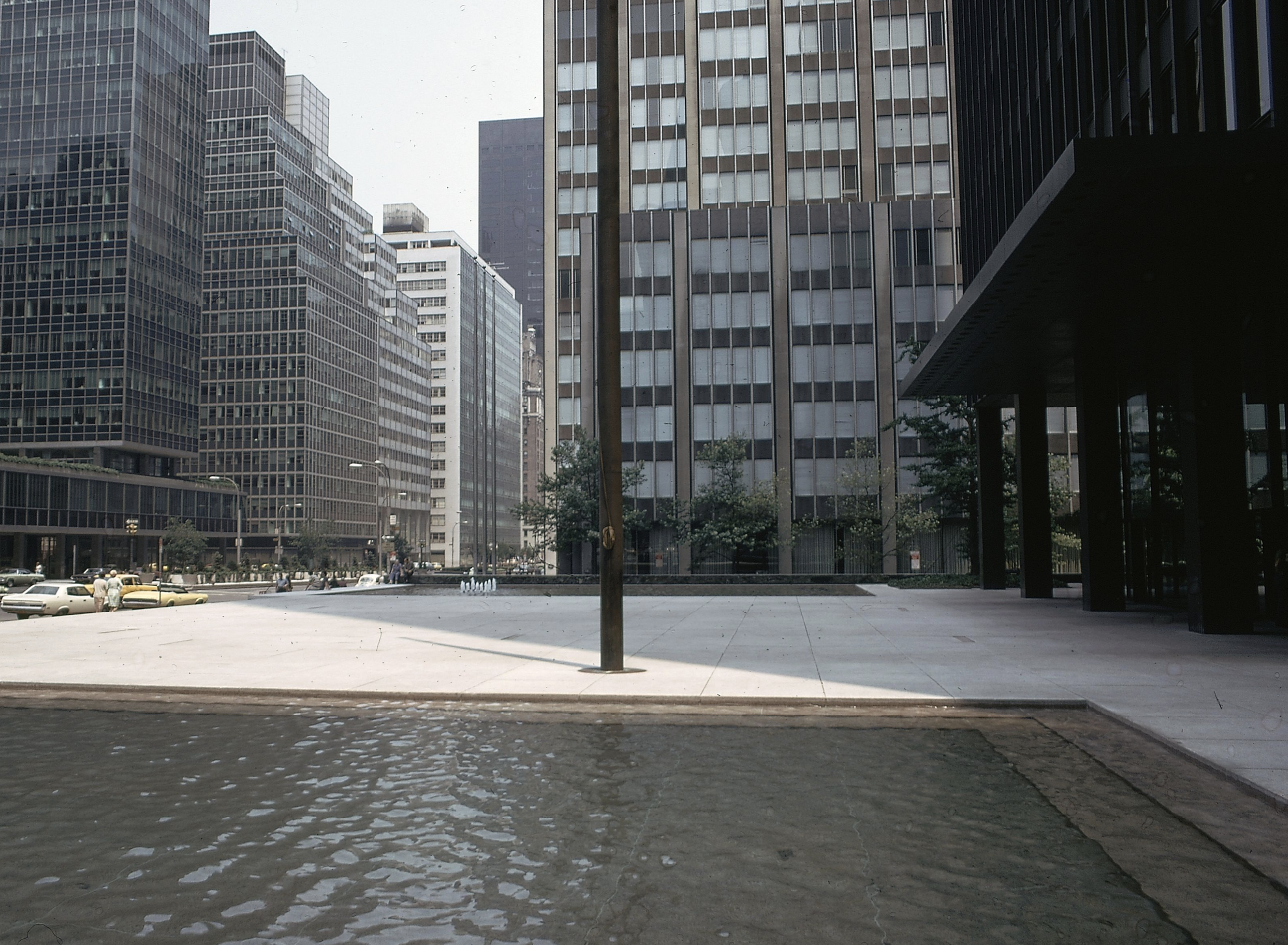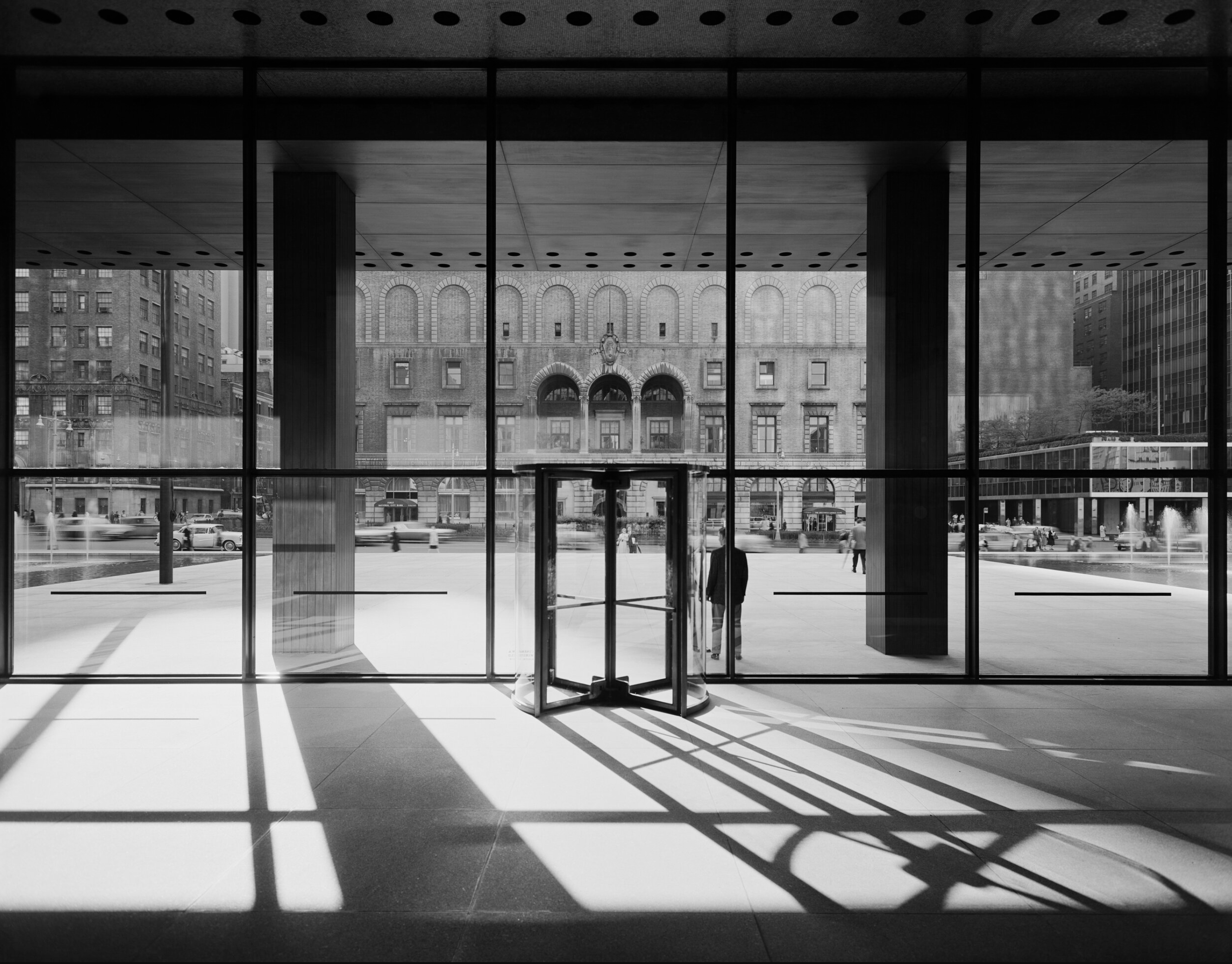But it is at the Seagram that all the aims and ideas of the urban high-rise for commercial use come together in near-perfection. The steel and glass tower possesses tremendous elegance, with its details a direct result of the demands of the material and construction techniques used. There are no overt references to history and no superfluous ornaments. Unlike earlier skyscrapers, the Seagram does not pose as an over-stretched palazzo with a top ‘cornice’ and spire, a central shaft of repetitive floors, and a podium. Instead it is pure reflective wall, with the entrance distinguished in the most subtle manner by a portico-like display of steel columns. This entrance is a clue to Mies’ aesthetic. Direct reference to history is, of course, eschewed, as is any form of ornament, but Mies’ building is nonetheless rich in historical influence – although of a highly subtle, almost abstract sort. This influence is mostly represented through the use of traditional systems of proportions, used to unite elements of the building with the building as a whole. Or, as with the portico-like columns of the porch, details allude to ancient classical prototypes.
