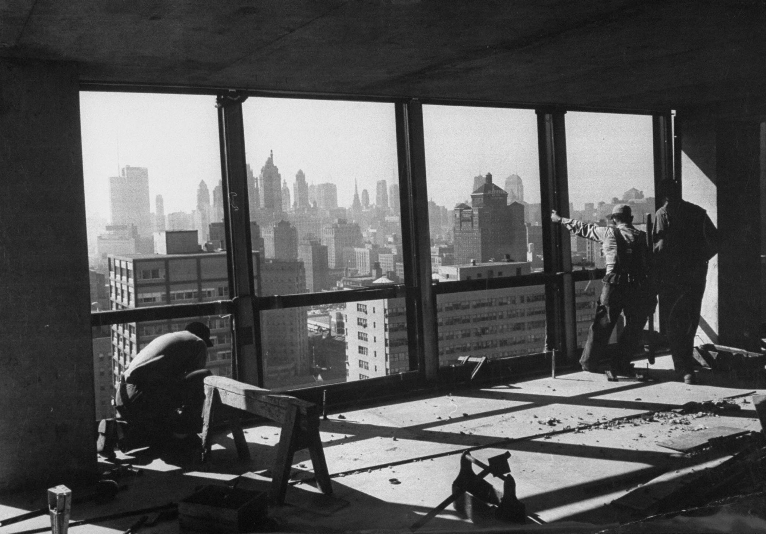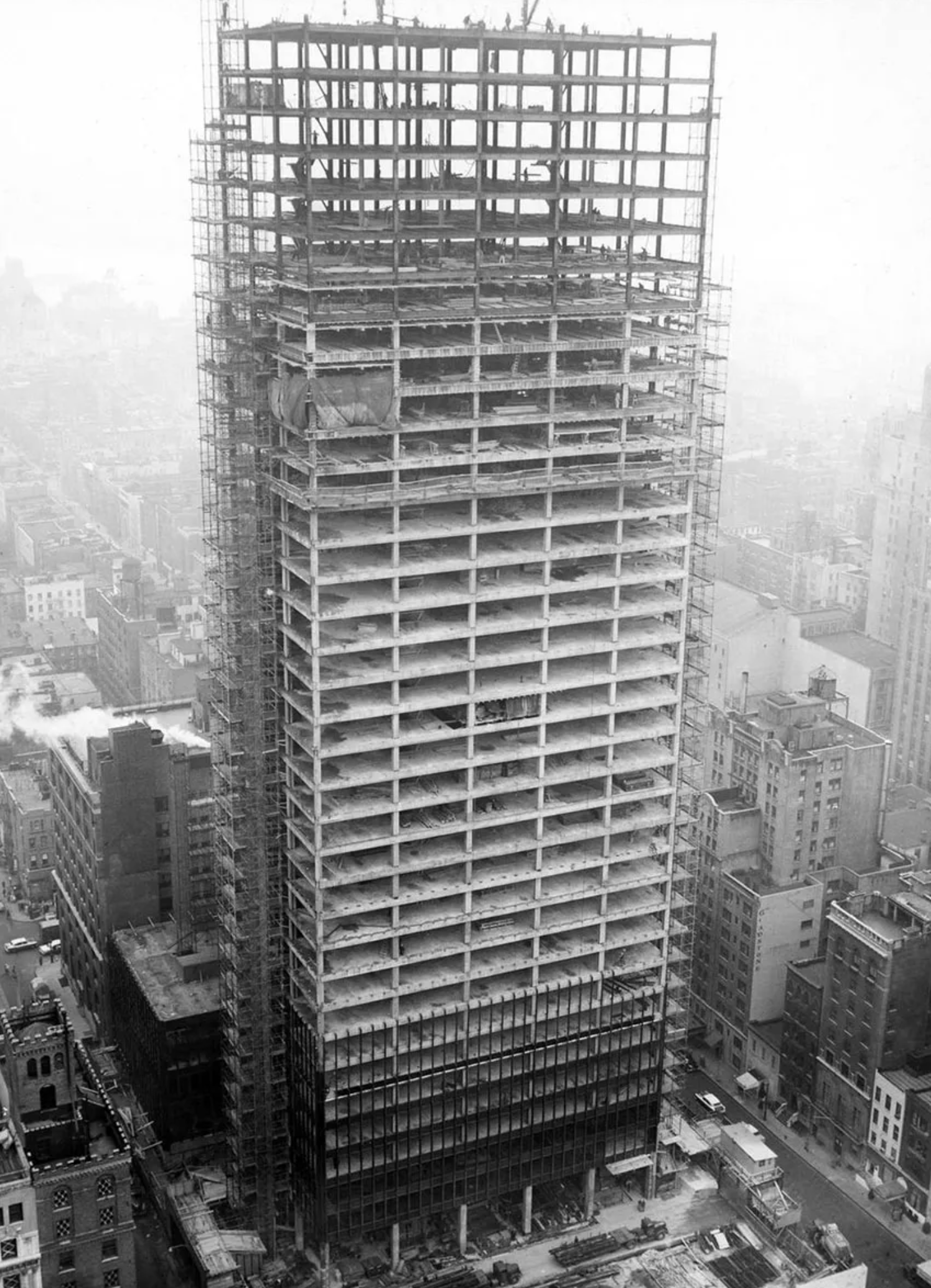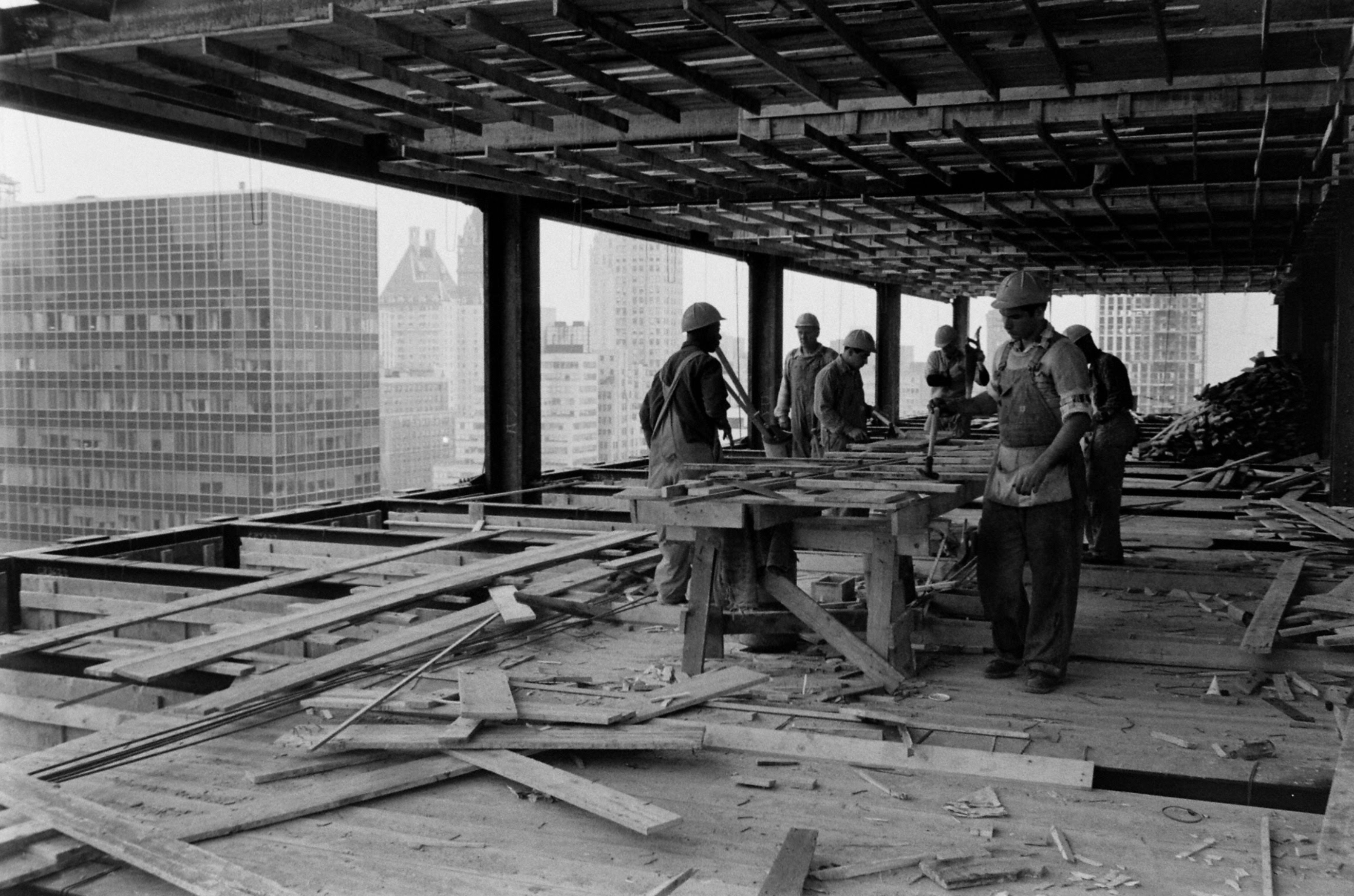 By the end of the nineteenth century it had become possible to construct entire buildings using frames of wrought iron and then steel. This meant that buildings could rise high and fast and possess open-plan interiors that were well-lit and adaptable. Combining the technology of structural frames (with metal later supplemented by reinforced concrete) with the fast and reliable elevator, electric power, and strong plate glass meant that the modern high-rise tower had arrived, in the process introducing a new way of living and working in cities.The new high-rise building type – rooted in metal-frame construction pioneered during the Industrial Revolution in late eighteenth-century Britain and first developed in the United States in Chicago in the late 1880s – developed erratically during the first half of the twentieth century, typically with metal frames clad in masonry skins of various styles, usually ornamented, as with the Chrysler Building. Arguably the skyscraper reached artistic maturity only in 1958 with the completion of the Seagram Building on Park Avenue, New York, designed by Mies van der Rohe. It was, and in certain ways remains, virtually the last word in skyscraper design.