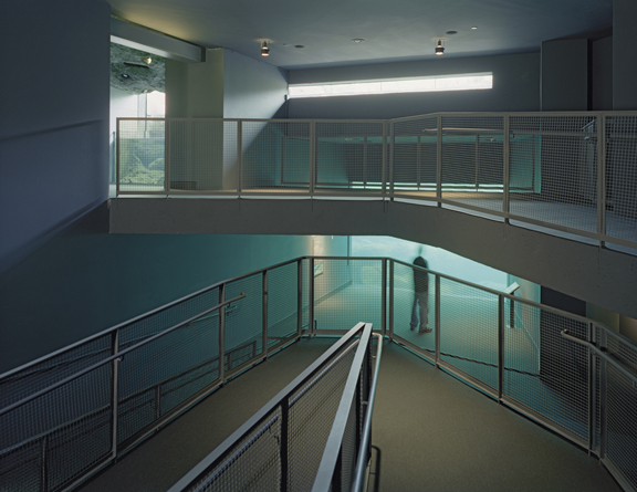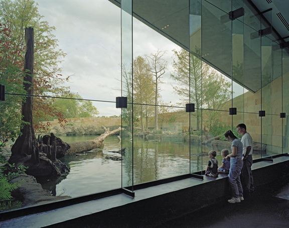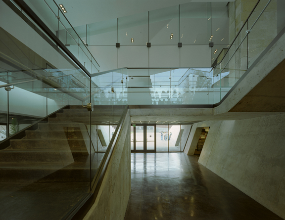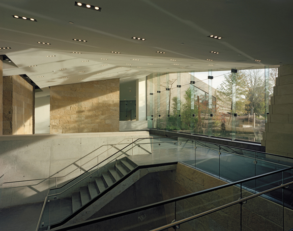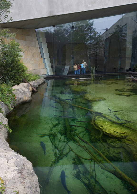 Additionally, the rough limestone masses integrate the interpretive nature of the building itself with the exhibits. The south arm of the RiverQuarium burrows under ground,