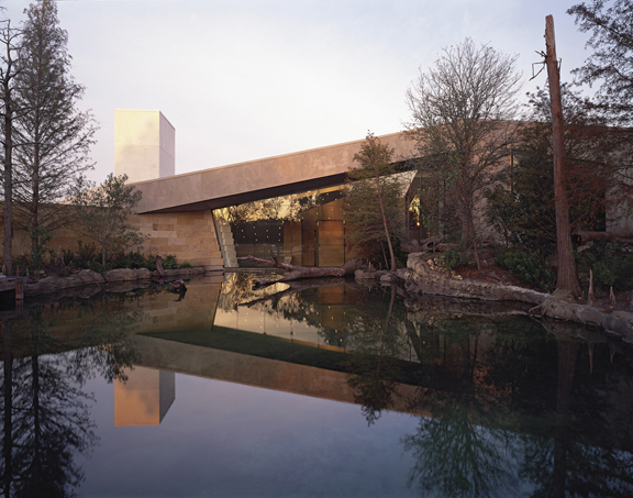 The design for the Flint RiverQuarium reveals a topologically evolving transition between nature and architecture. Focusing on an axial view to the Flint River, the building wraps and embraces the primary outdoor exhibit, a 15,000 square foot naturally landscaped Blue Hole and Cypress Creek. As it reveals the subsurface karst geology of the ACF (Apalachicola, Chattahoochee, and Flint) River Basin, the building is a labyrinth of monolithic limestone blocks alluding to the complex Ocala limestone terrain of sinks, aquifers, caves and streams that exist below the surface.