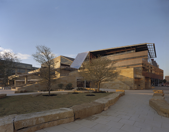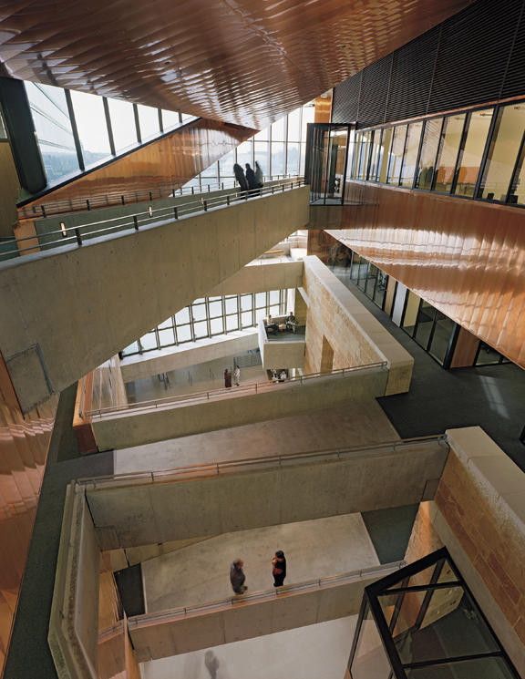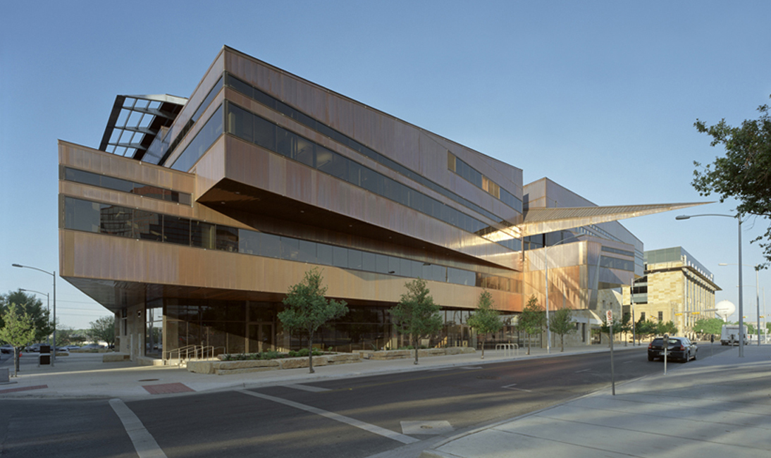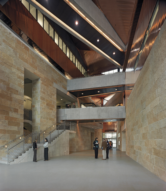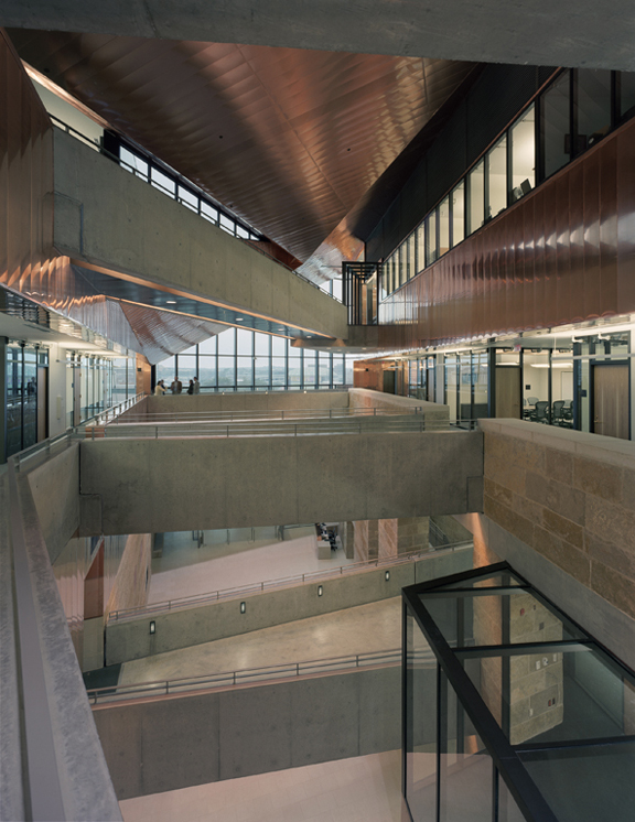 Landscape dominates the project. A massive arc of Lueders limestone, emerging from bedrock at the lowest level of the parking garage, anchors the project to the site. Metamorphosing out of this wall is a limestone base that encloses the first two stories. A scrim-like copper skin, resting on the limestone base and capped with a folded copper roof, encloses the upper levels. As the arcing wall cuts through the building it creates an open four-story lobby transected by catwalk-like bridges at each level. A reflective copper ceiling over the lobby reflects light from a skylight into the space below.