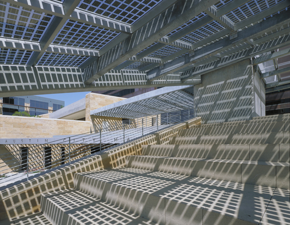 The plaza winds its way around the limestone peninsulas of the terraced building. Water originating from the canyon-like space inside the building runs through a group of monumental limestone boulders in the plaza to symbolically return to Lady Bird Lake. The plaza contains a limestone stage for performances, with amphitheater seating that descends from the main public terrace. The amphitheater is protected from the sun by a trellised structure made up of photovoltaic cells.