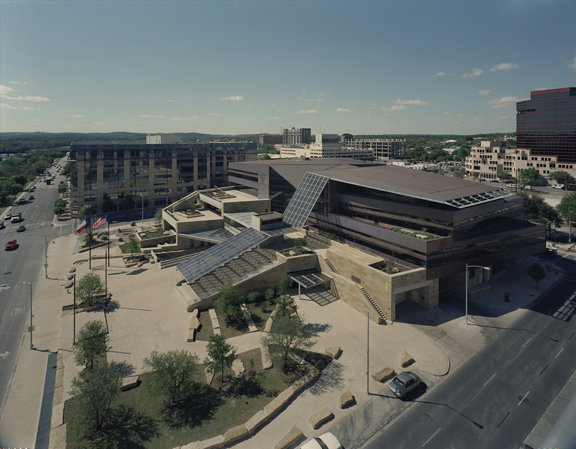 On the exterior, limestone, copper, glass, water and shade come together to create the city's "living room." Terraces spill out of the building into the plaza in the same way the geologic forces in Austin's hill country produce the limestone overhangs known as balcones. These terraces, shaded with trees are prime locations for viewing the activities on the plaza below and Lady Bird Lake beyond.