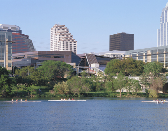 The new Austin City Hall and public plaza graces the shores of Lady Bird Lake at the edge of the dynamic Warehouse district, an area that is rapidly being transformed into a tight grid of restaurants, nightspots, housing, and mid-rise office spaces. The new city hall, completed in the fall of 2004, terraces down to the lake from Second Street, mediating between this busy city grid and the natural realm.