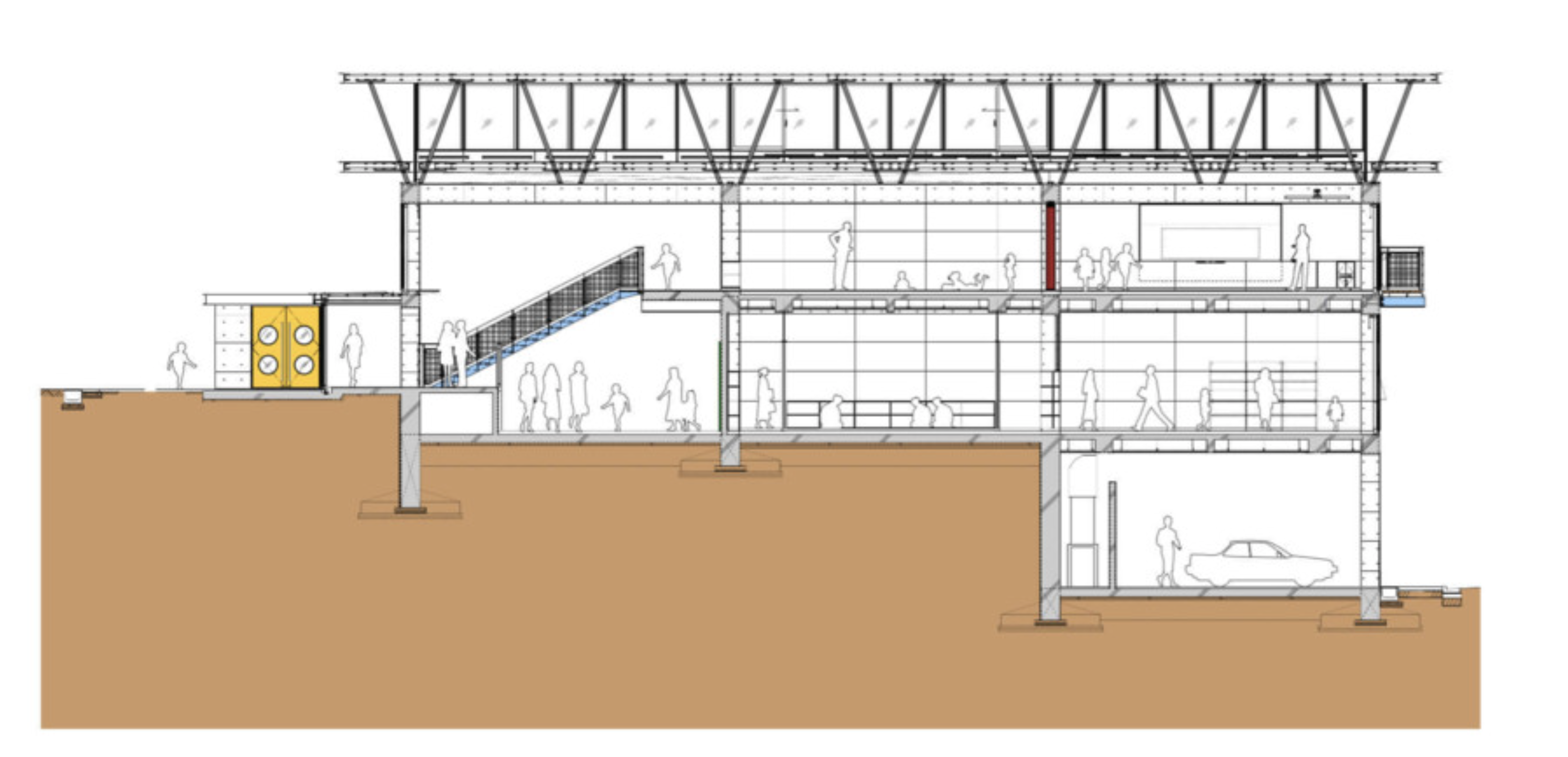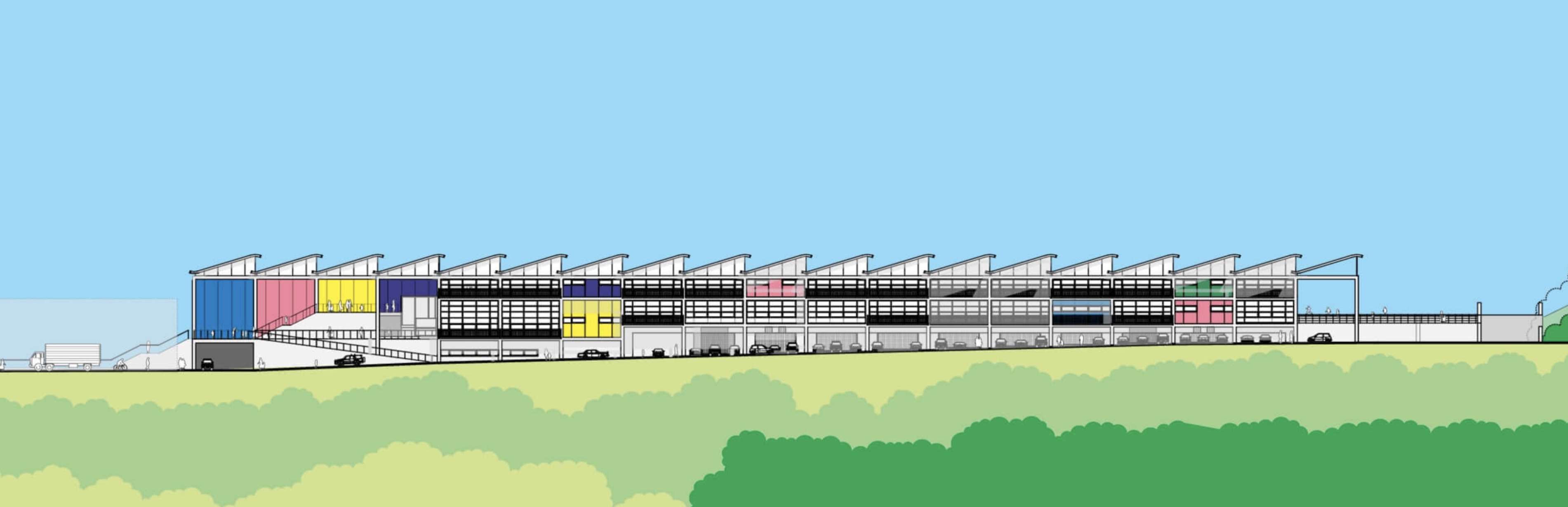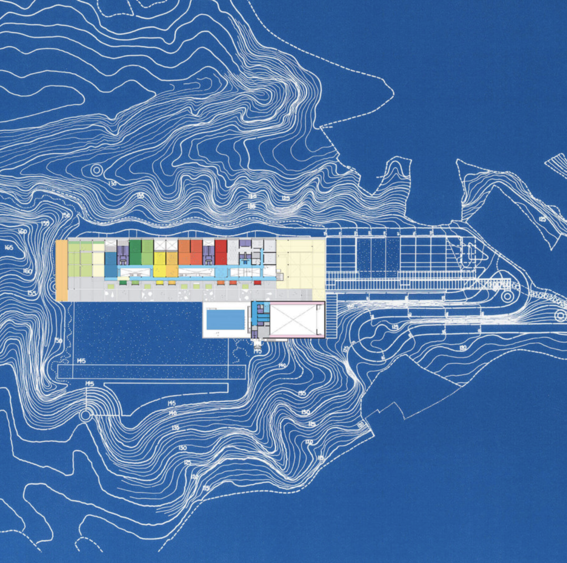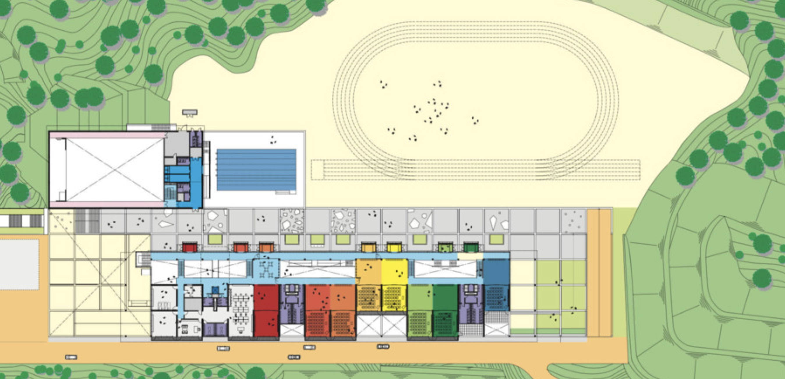 Set into a steep hillside, the project is arranged as two buildings, one stepping down from the other and characterised by an elegant undulating roof. This form allows for a series of roof lights that bring daylight deep into the heart of the building. Inside a large common hall acts as the focus of activities with two levels of flexible classroom spaces arranged around it. Bright wall colours within the grid frame are coded for children and adults, defining different areas and functions.