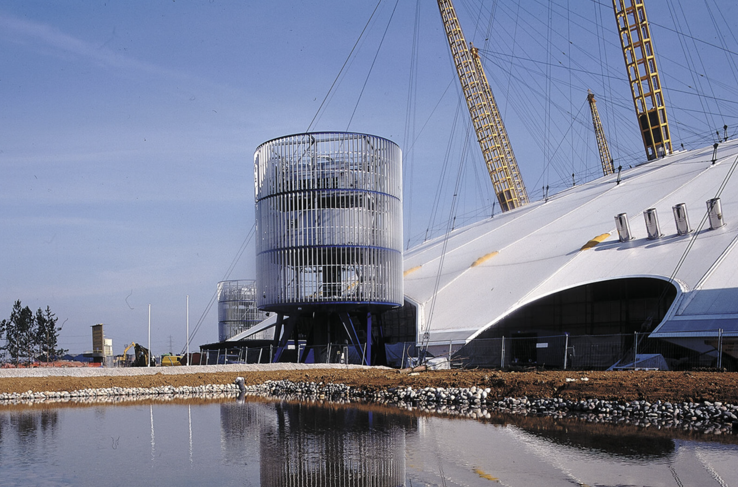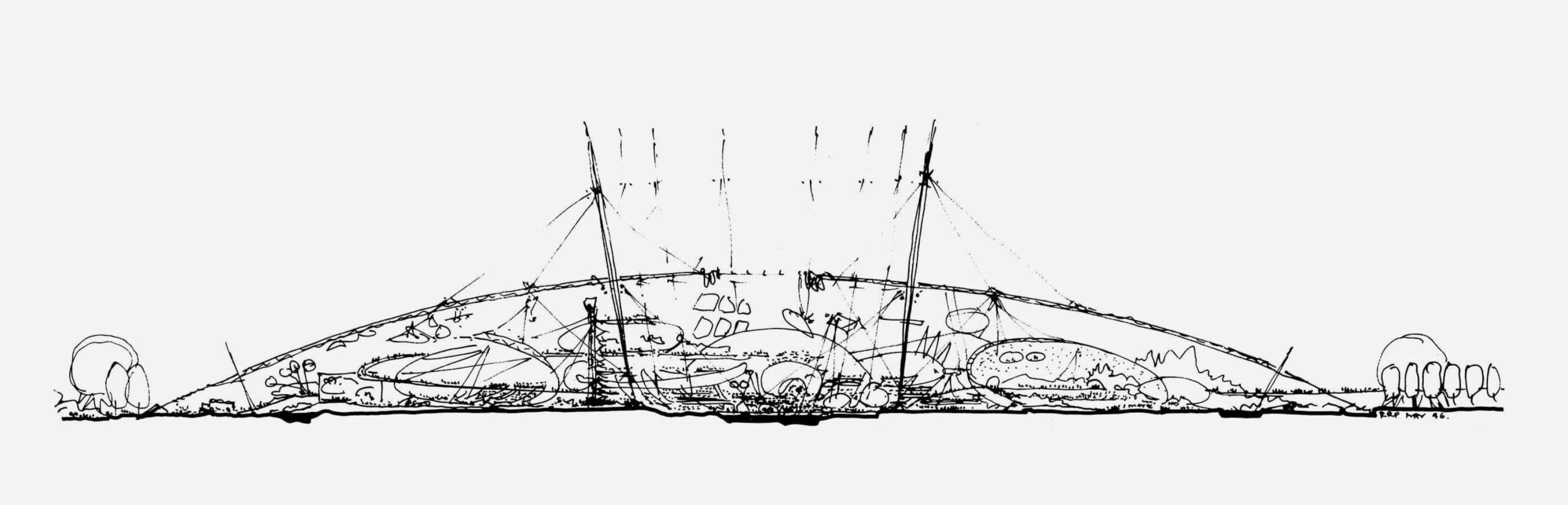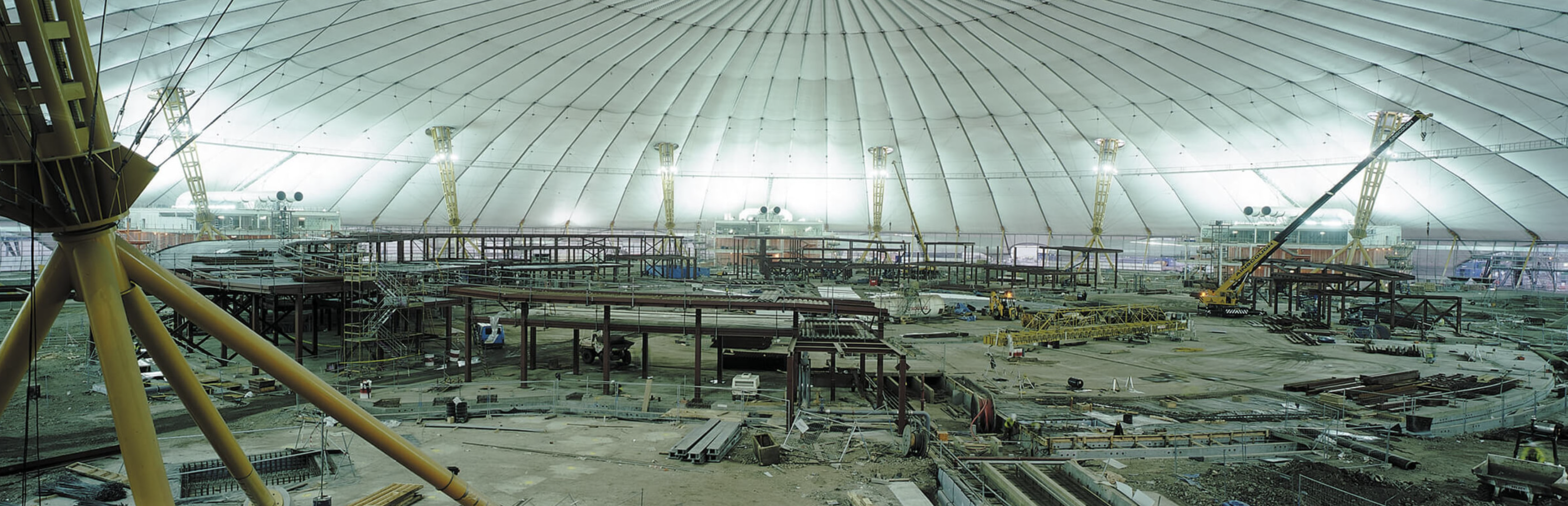 Designed in association with engineers Buro Happold, the key objectives for the structure were lightness, economy and speed of construction. The Dome is firmly rooted in the early work of the Practice, in particular the Fleetguard Factory (Brittany, 1979), the INMOS Microprocessor Factory (Newport, 1987), the Dome in the Royal Docks masterplan (London, 1986) and the Massy Autosalon (Massy, 1987) – all of which are assisted span structures.