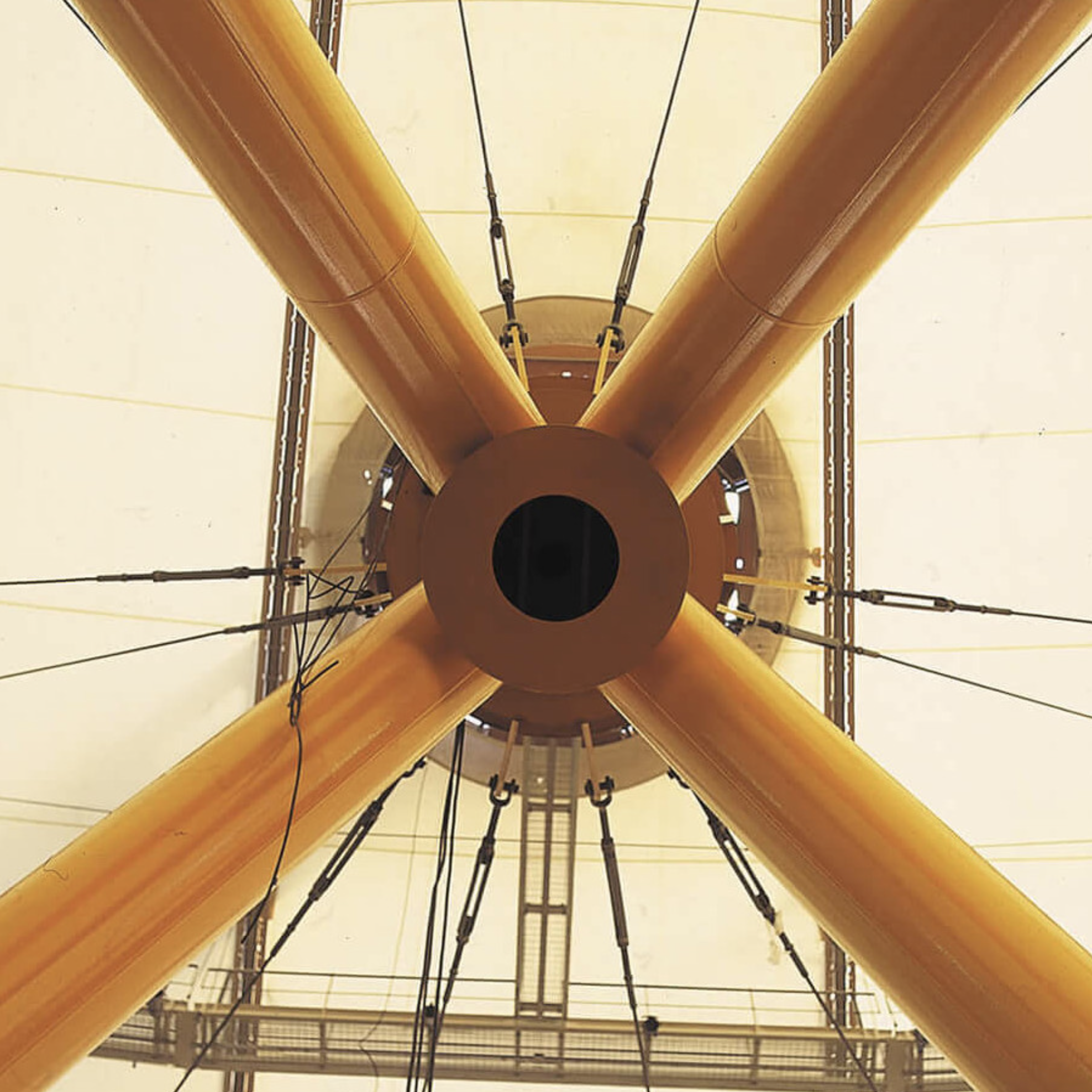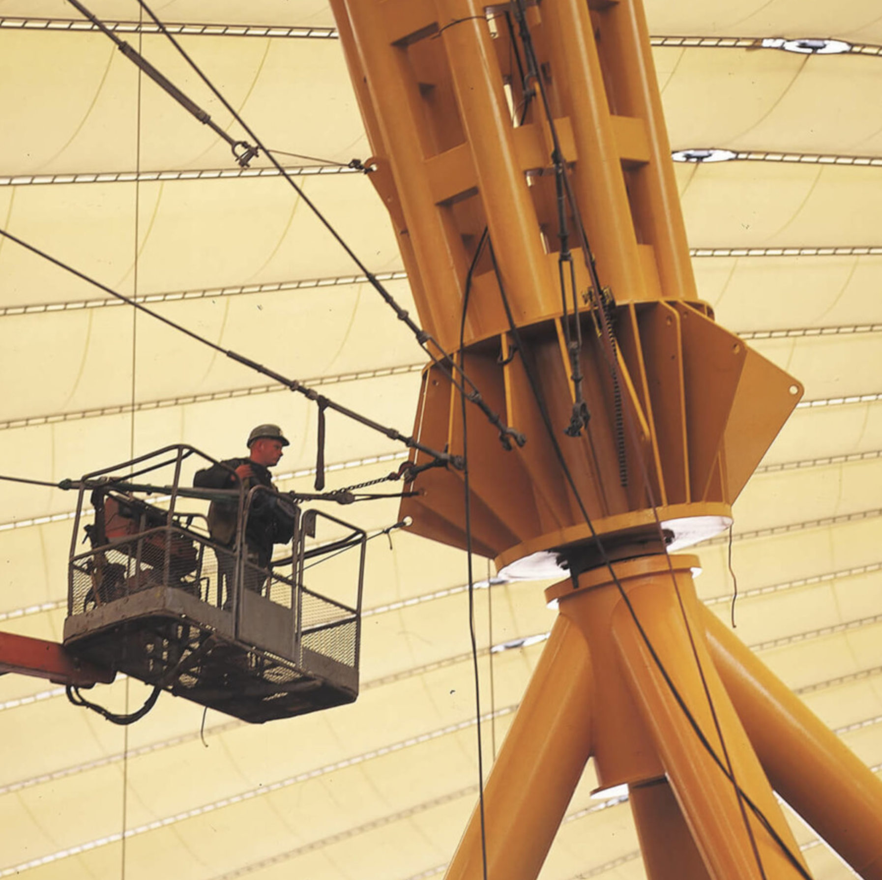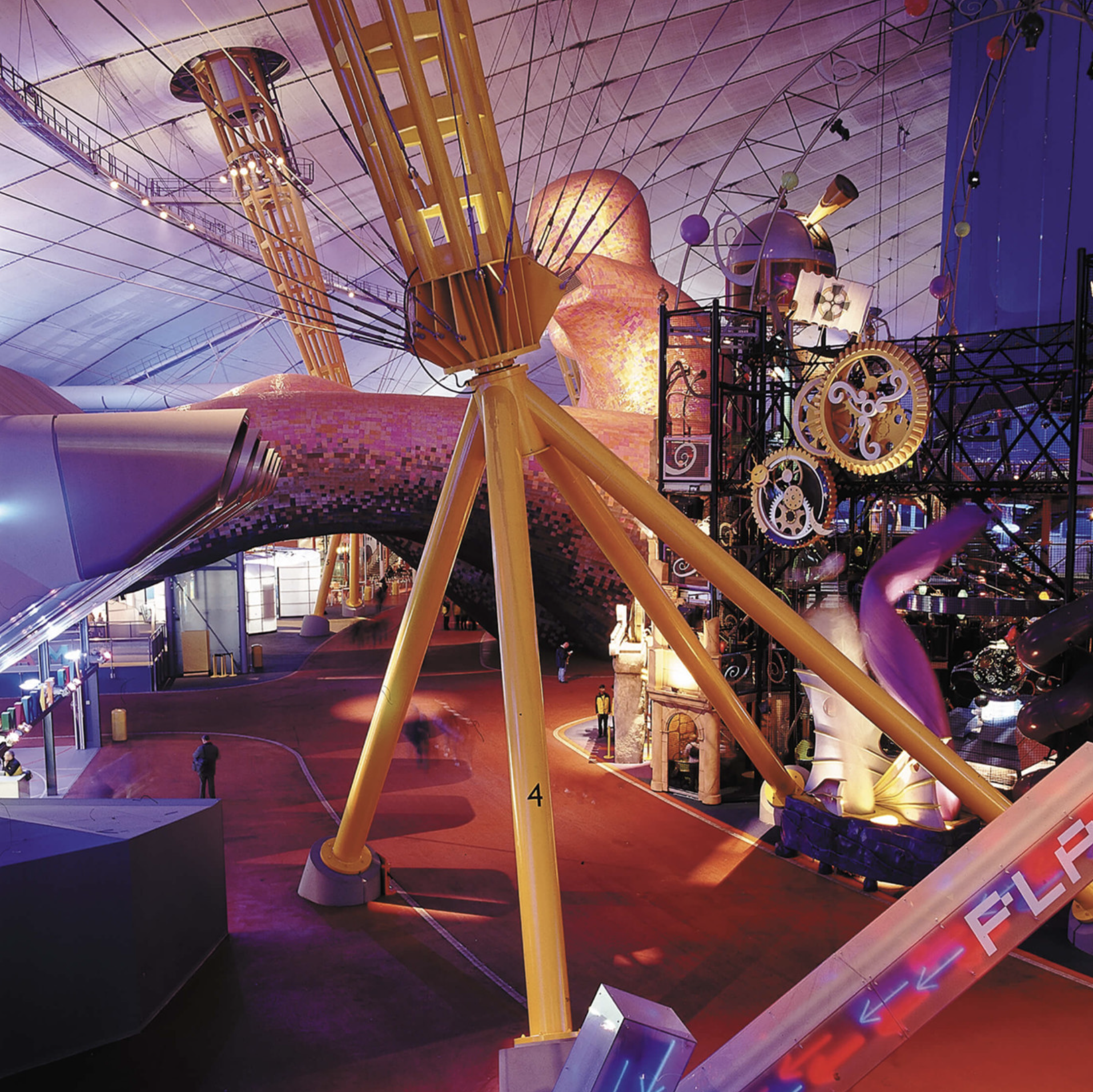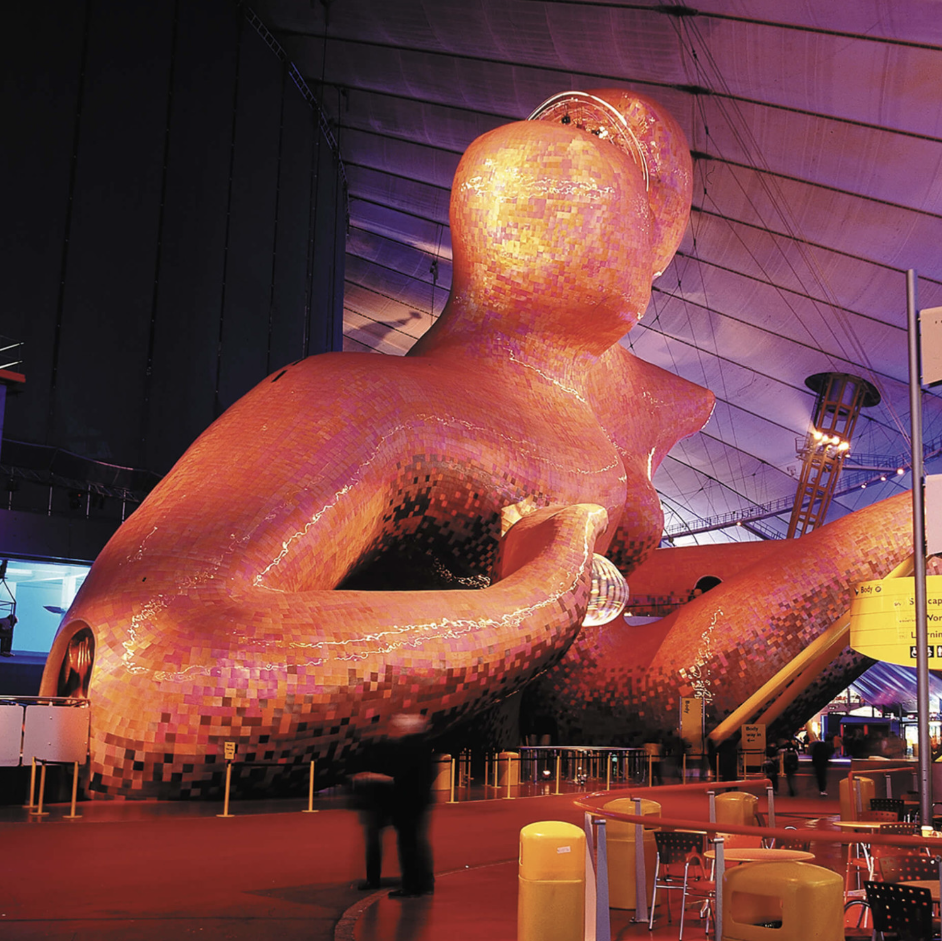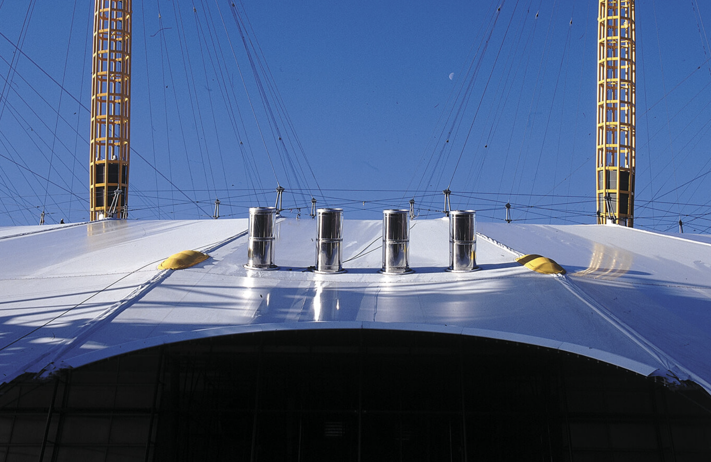Mike Davies, RRP project director, and Gary Withers, of communications and design agency Imagination, together plotted the projection of the comets and stars, dawns and dusks onto the Dome’s surface prior to its detailed structural rationalisation. For Davies, an enthusiastic astronomer, the idea of time was critical during the building’s conception. The measurements of time – 12 hours, 12 months, and 12 constellations of the sky – are all integral to the original concept. The yellow support towers, of which there are 12, are intended to be perceived as great arms, out-stretched in celebration.