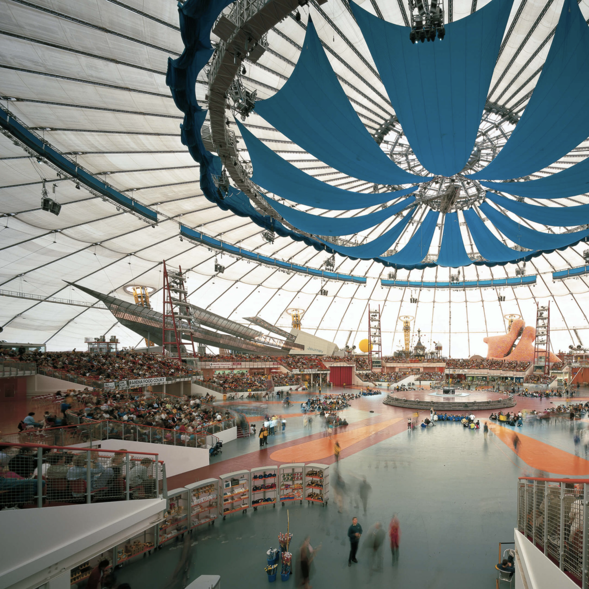 The structure solved with great elegance the problem of how to enclose and protect the separate exhibition ‘zones’ from the vagaries of the British climate. Providing 100,000 square metres (1.08 million square feet) of enclosed space within a 2.2 million-cubic-metre (77.7 million-cubic-foot) volume, the structure is 365 metres (1,200 feet) in diameter, with a circumference of 1,000 metres (3,280 feet). The Dome, with a maximum height of 50 metres (164 feet), is suspended from a series of twelve 100-metre (328-foot) steel masts, held in place by more than 70 kilometres (43.5 miles) of high-strength steel cable that, in turn, support the Teflon-coated glass-fibre roof.