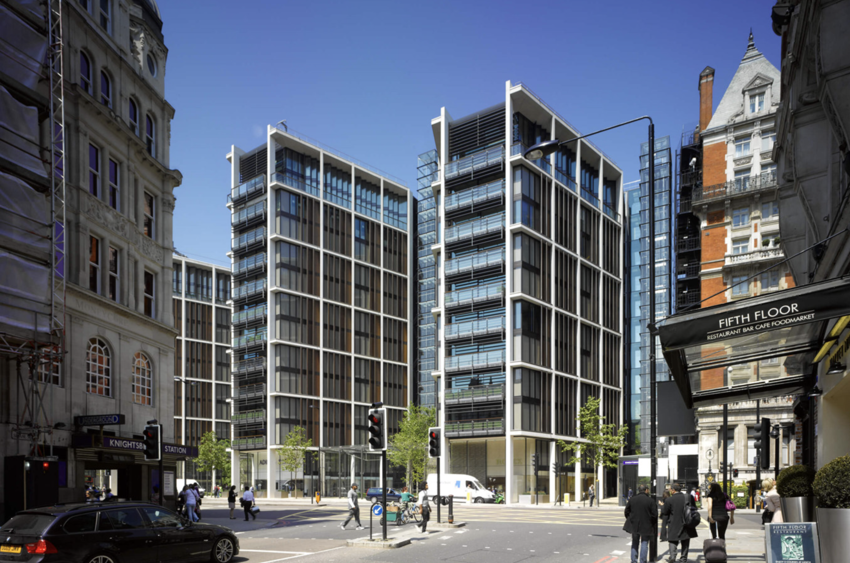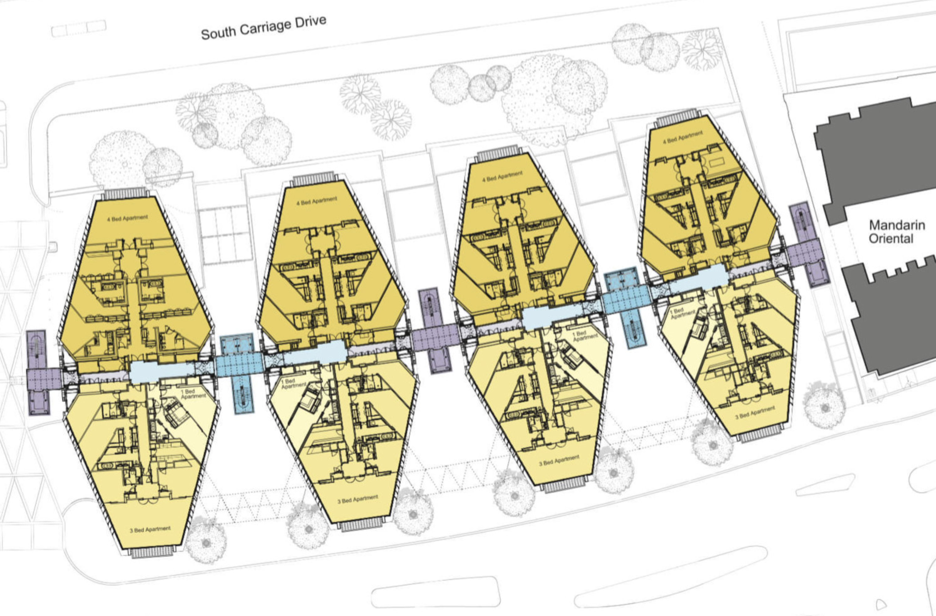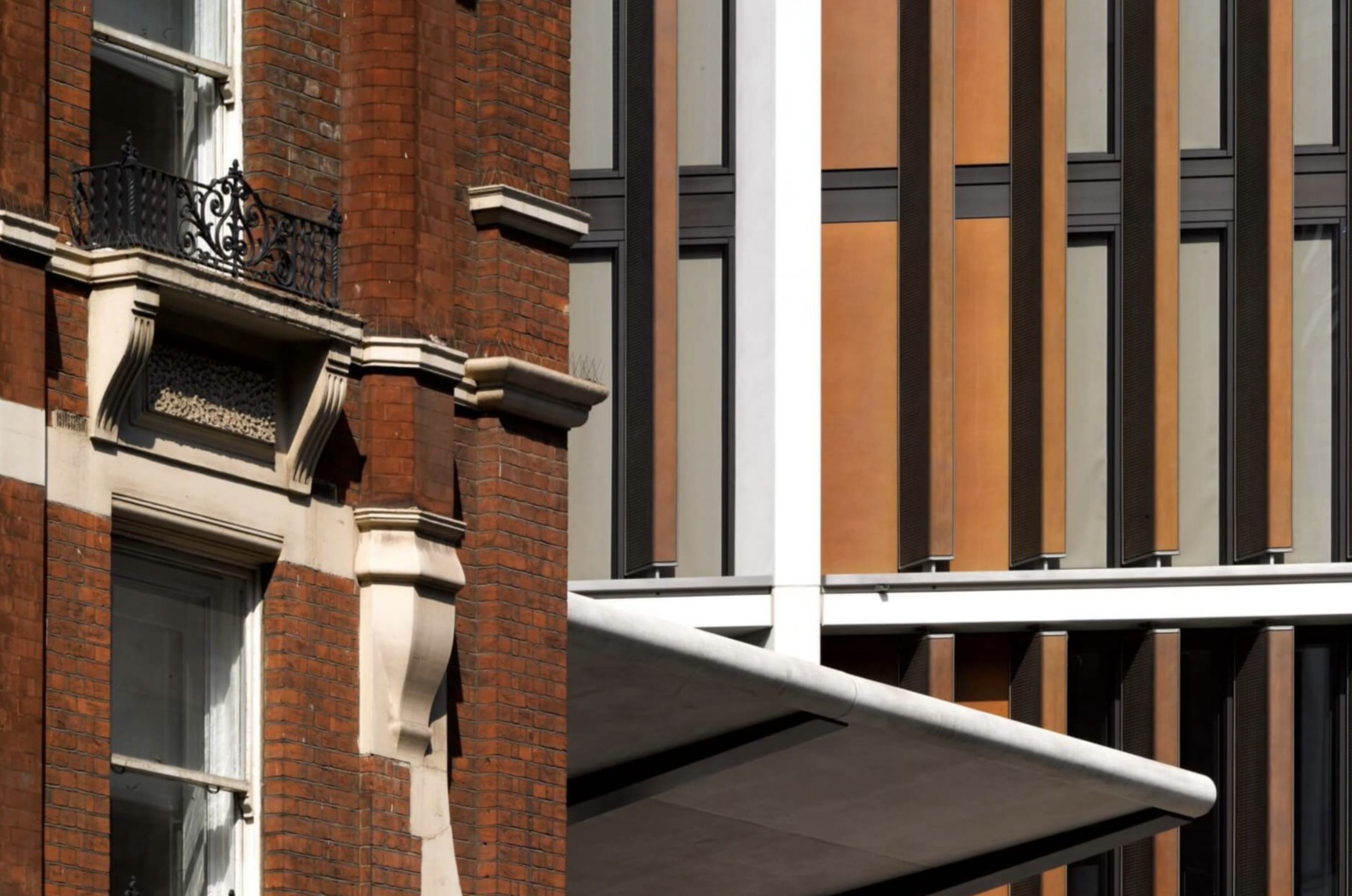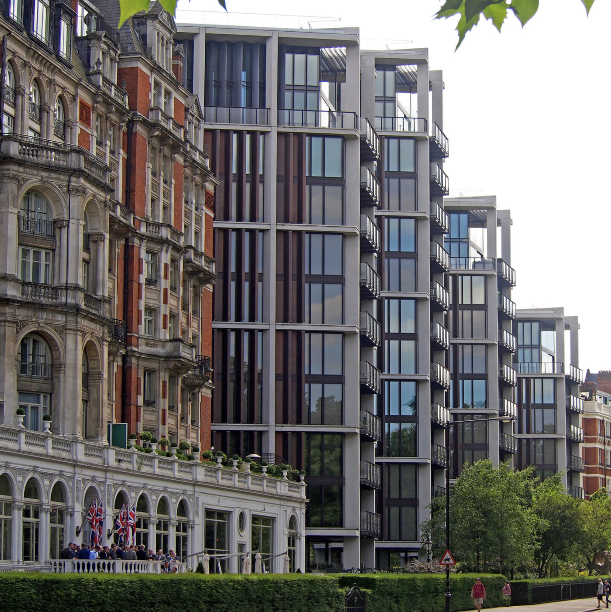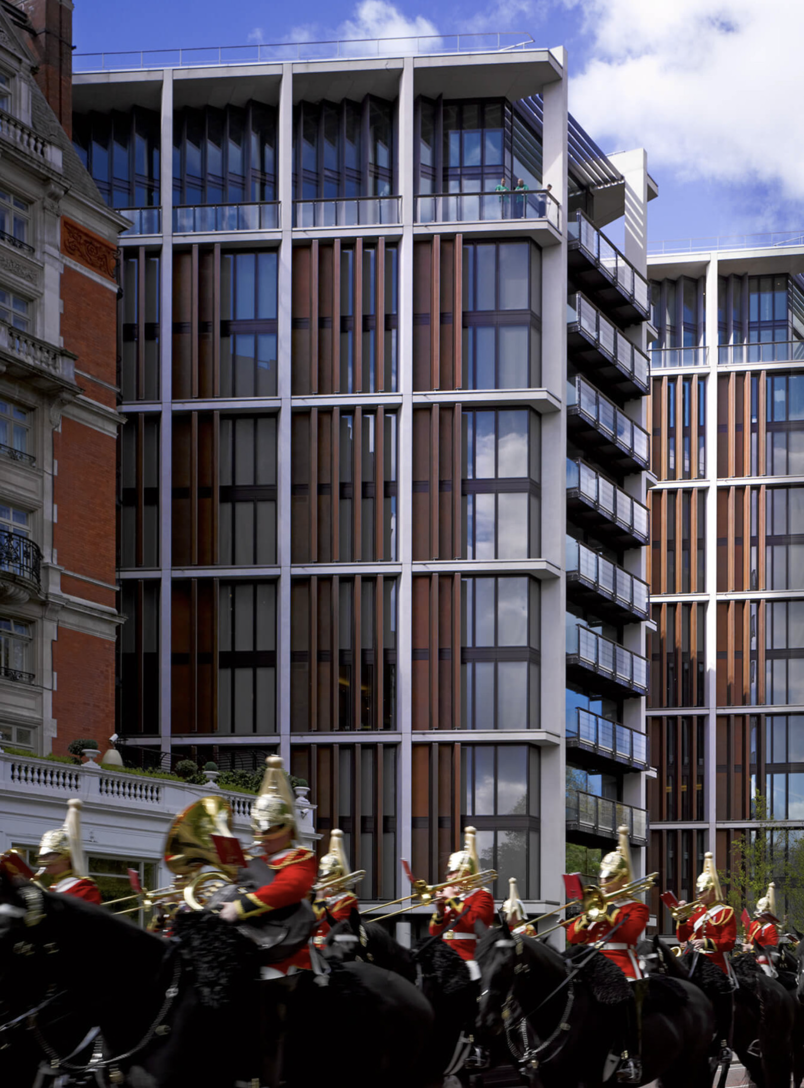 The design seeks to complement the existing streetscape of Knightsbridge and create a scheme that offers daylight and generous views whilst achieving the necessary degree of privacy for its occupants. As befits luxury apartments, elegant detailing and quality of construction were of great importance. Materials were chosen to reflect the colouring and texture of the surrounding buildings: red-brown copper alloy façades complement the surrounding red brick buildings; and pale structural concrete mimics stone details on the neighbouring Mandarin Oriental Hotel.