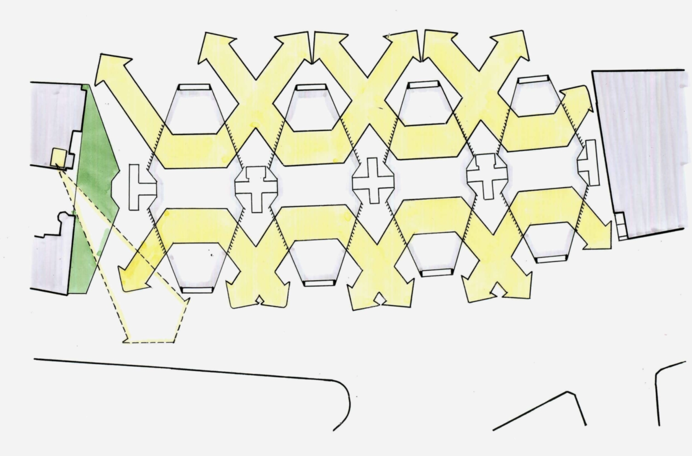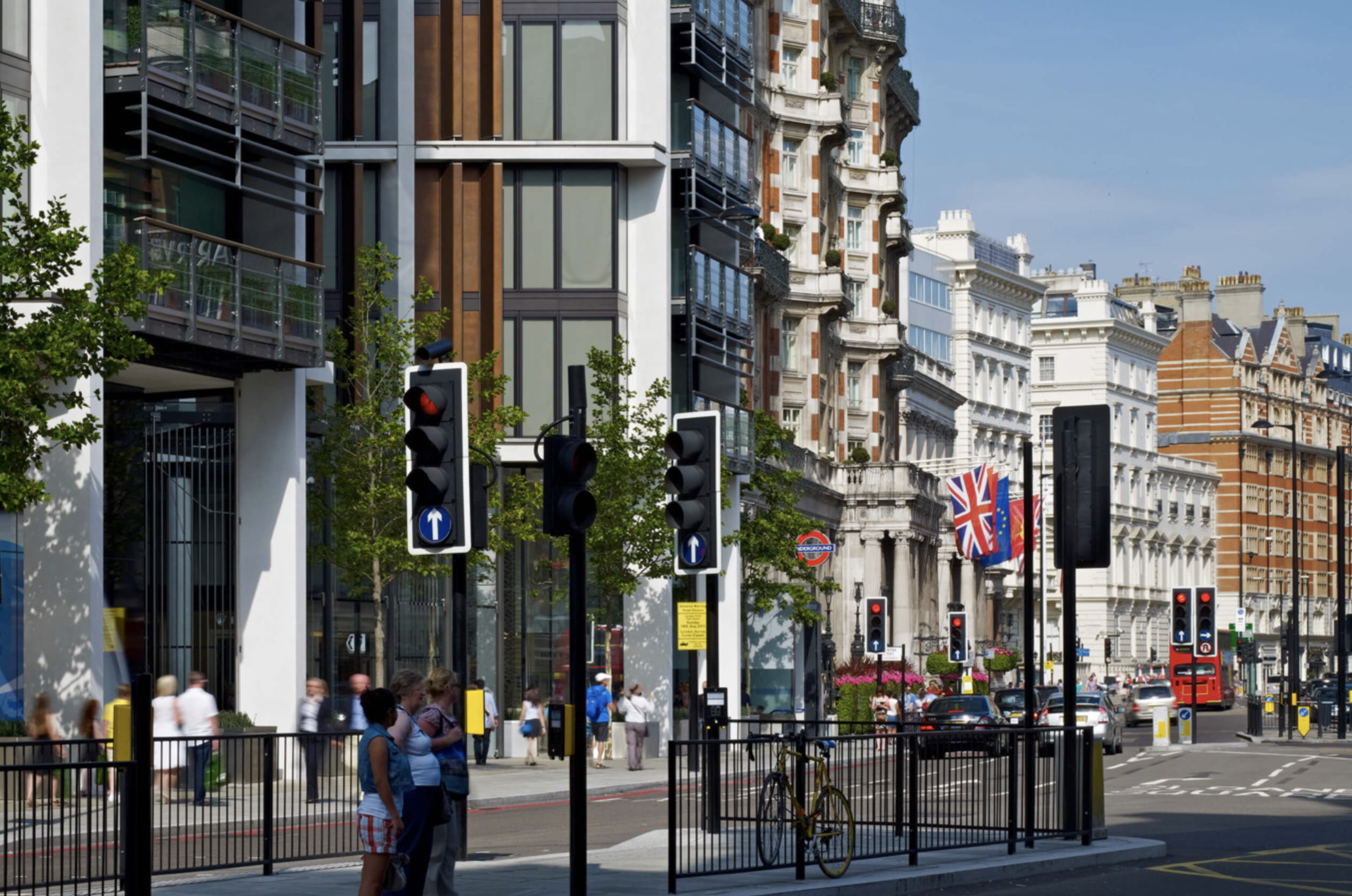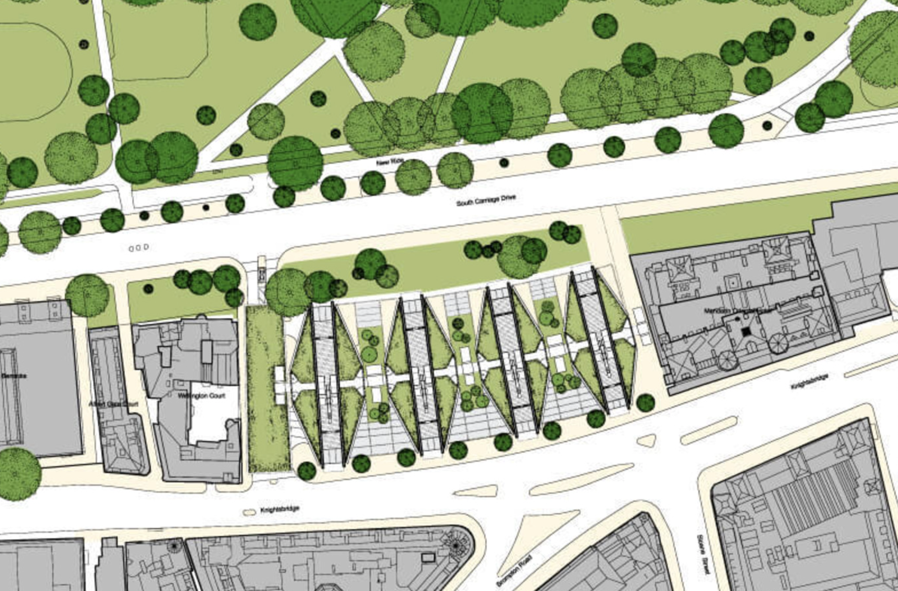 Along the eastern edge of the site, linking the Park to Knightsbridge, a new pedestrian route through the site, Serpentine Walk, has been created. The original Knightsbridge underground station entrance has been relocated adjacent to Mandarin Oriental Hotel. The entrance was designed using a similar palette of materials to those used in One Hyde Park creating a structure with a glazed roof and walls that appears to be both open and solid.