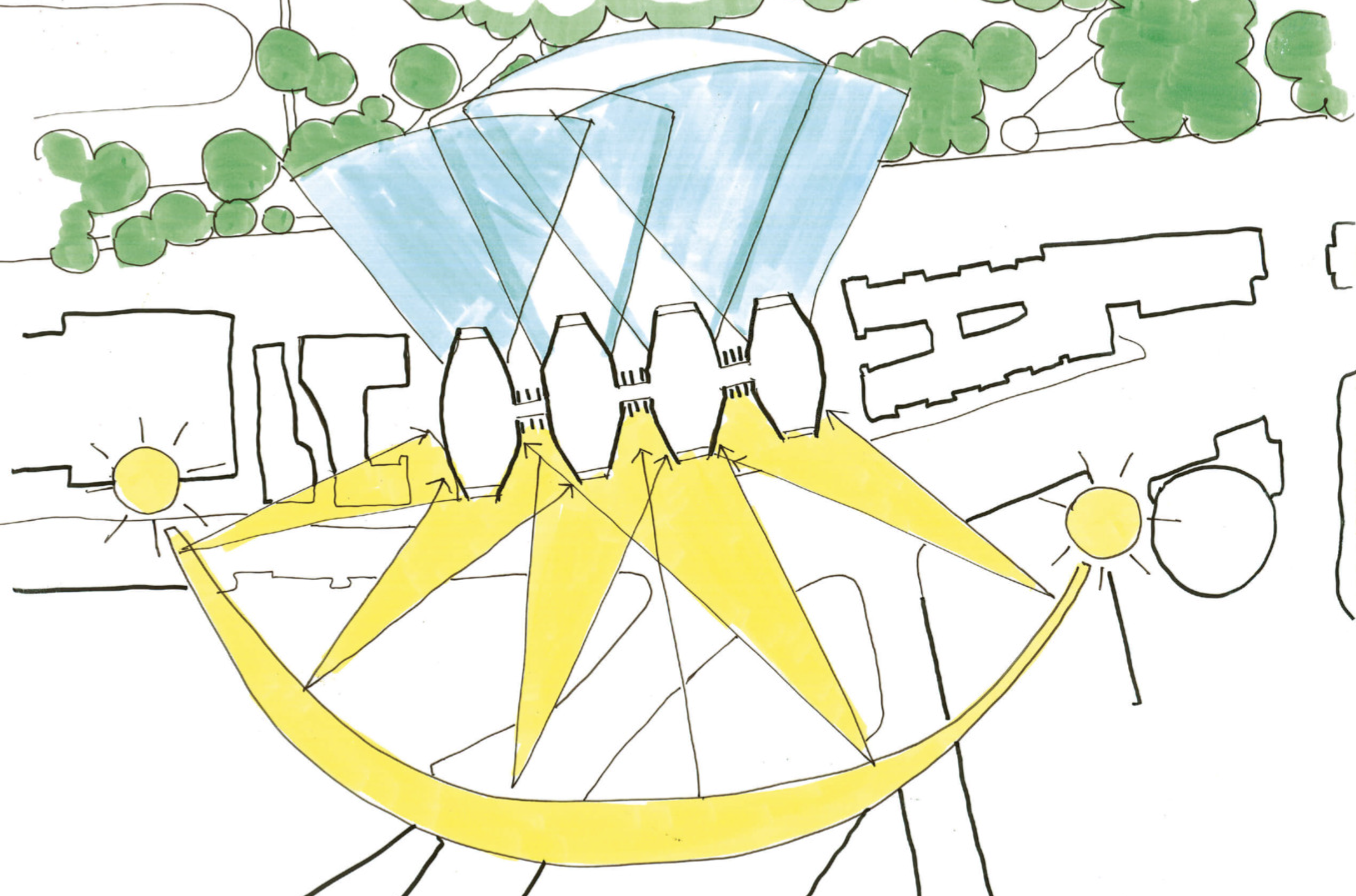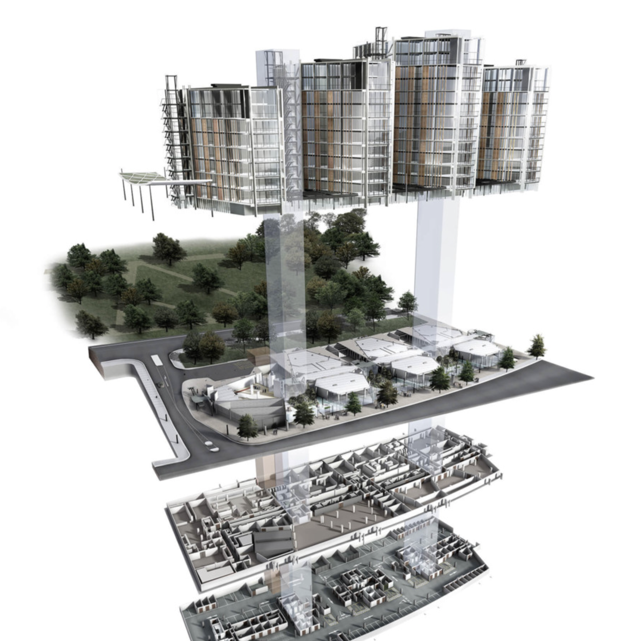Renowned lighting artist, James Turrell has created a unified lighting concept that interacts with the development’s architecture. It includes perimeter lighting for the five glass stair and lift structures and a colourful light display. |