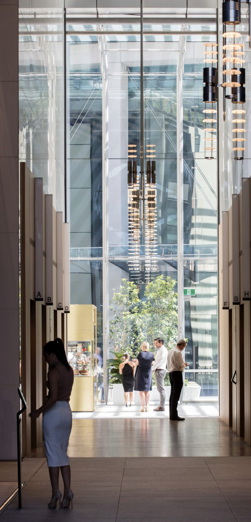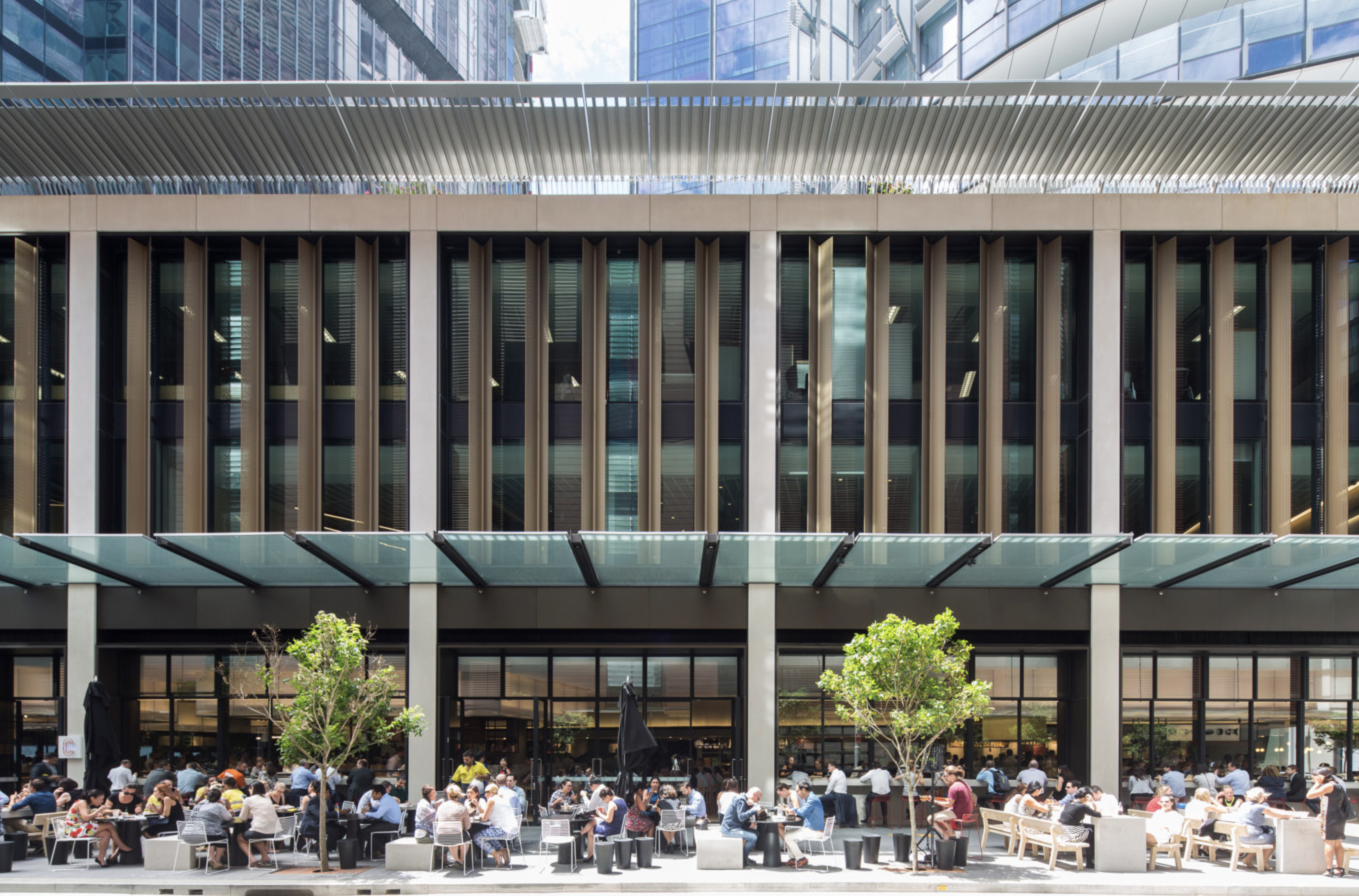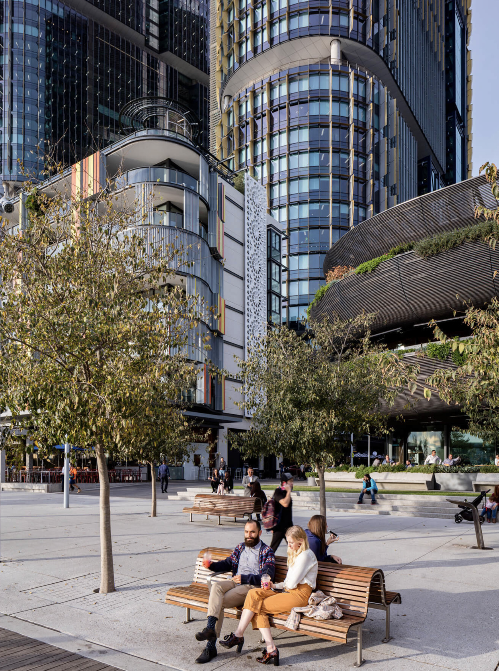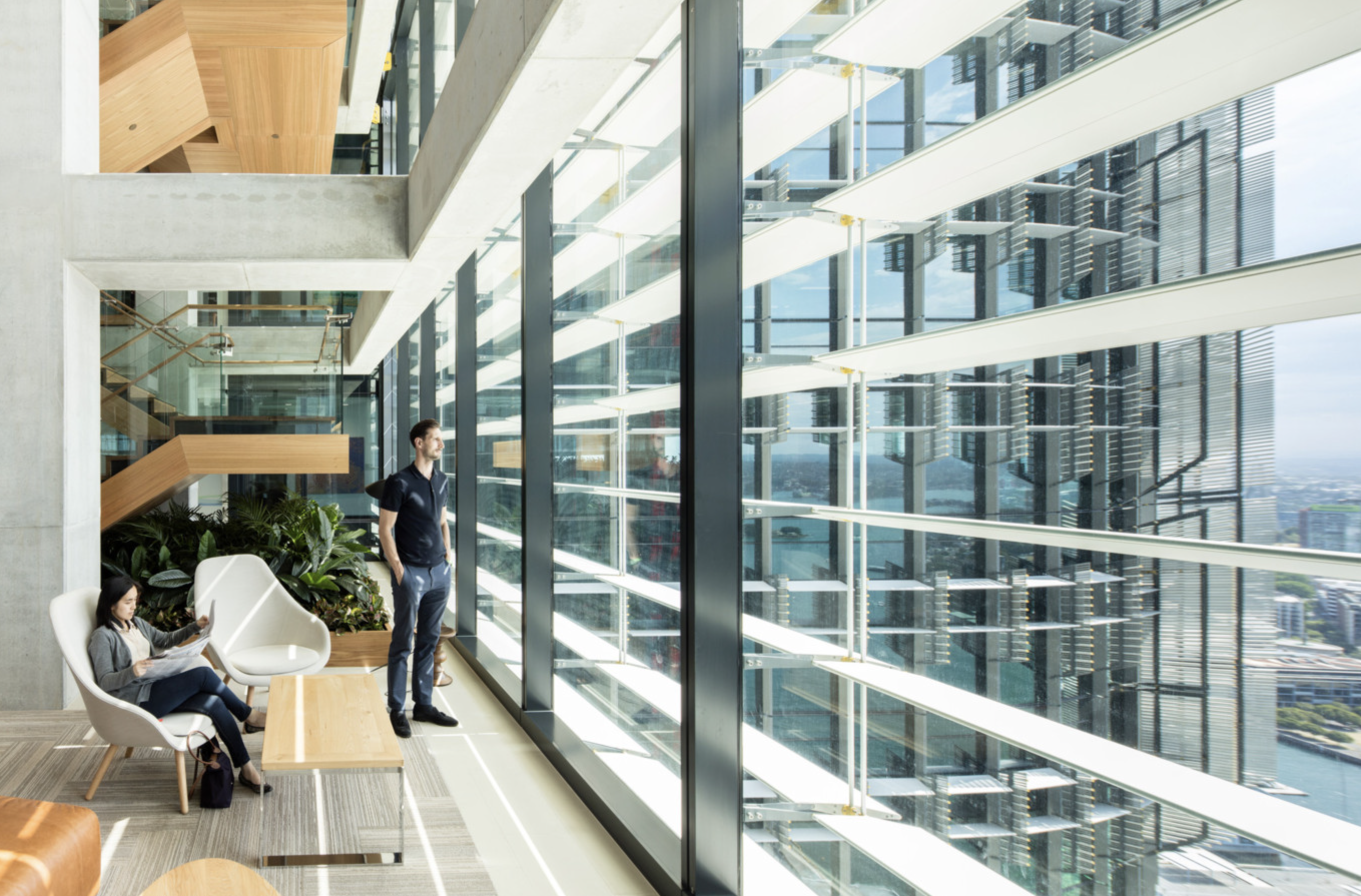One of the aspirations for the project was to set new environmental benchmarks in Australia. This is achieved through the combination of solar shading, glass technology and thermal performance directly responding to context, orientation and solar path. Energy consumption is reduced by arranging the lift cores and ‘vertical village’ community spaces on the northern elevation of the building, which provides shading for the internal workspace. These vertical villages – which include communal breakout spaces and meeting areas – enable visual and physical connections to be made between floors and encourage social interaction between users and visitors throughout the building. The precinct-wide centralised plant spaces allow the whole rooftop to be used as an open terrace and the podium roofs, vertical villages and building insets all provide the opportunity for planting, adding biodiversity to this urban site.