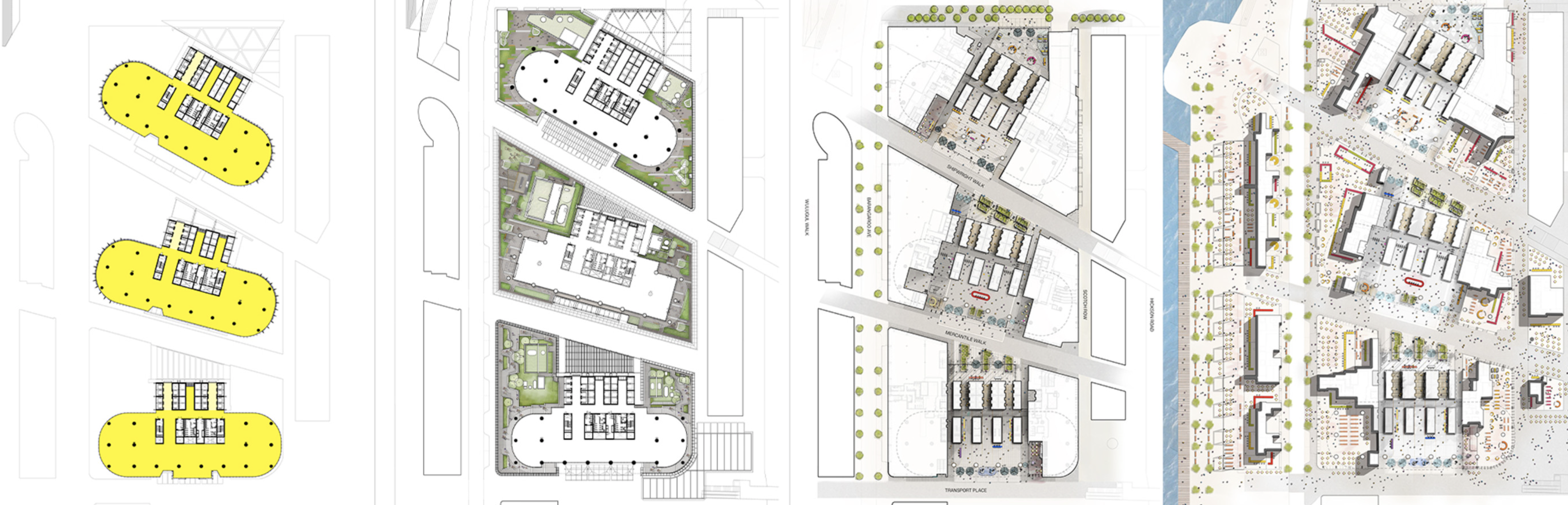 The towers sit on a three-storey plinth conceived as a carved piece of ground that mediates between the waters’ edge and the cliff edge presented by the city behind. The plinth creates a tight human scale streetscape with lobbies alongside other street activities such as retail and leisure. To minimise the number of service vehicles entering the development, the buildings share a common basement accessed from a single point of entrance, leaving the surrounding streets fully pedestrianised or pedestrian prioritised. All these factors help to generate a public realm that is vibrant and animated an