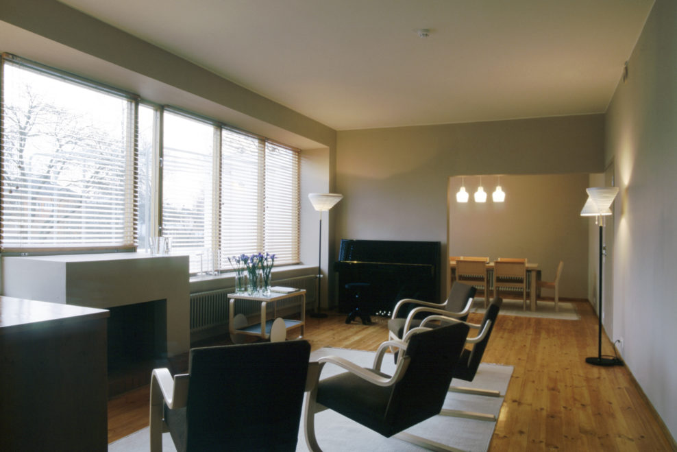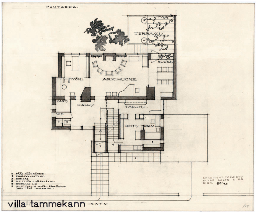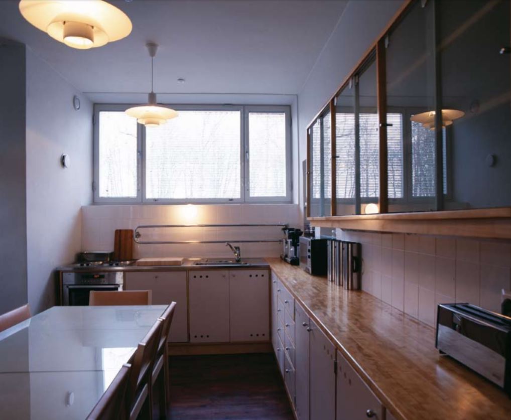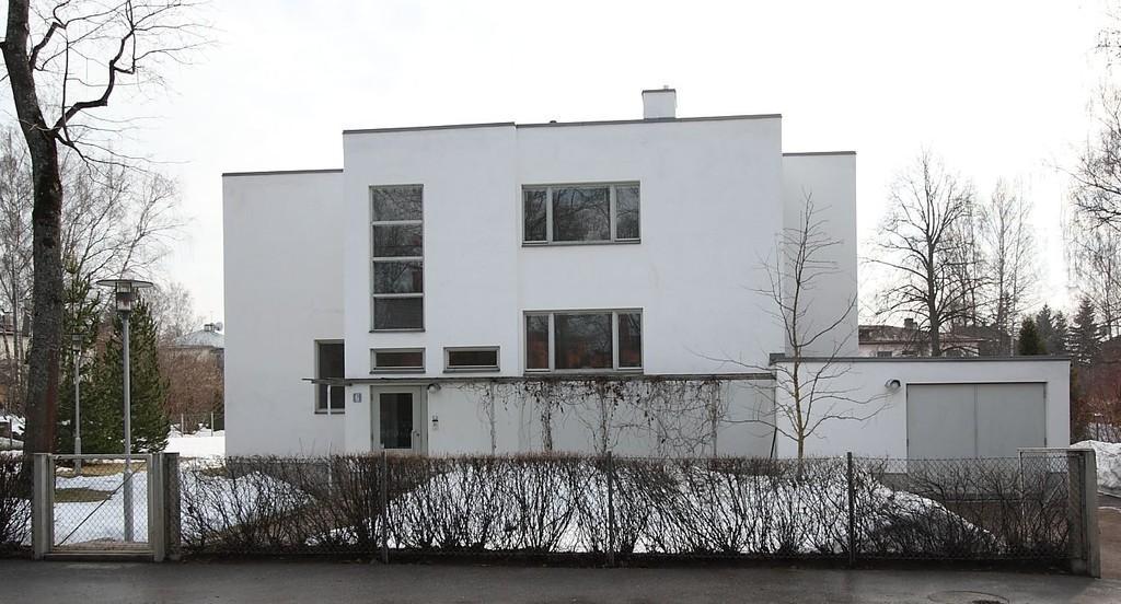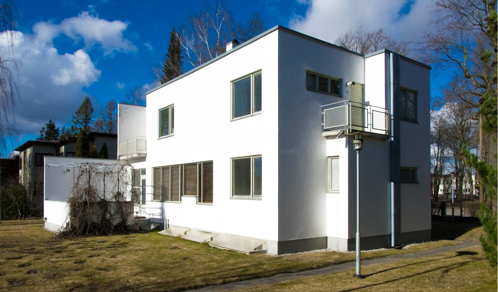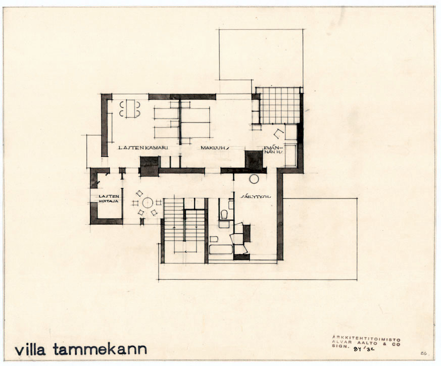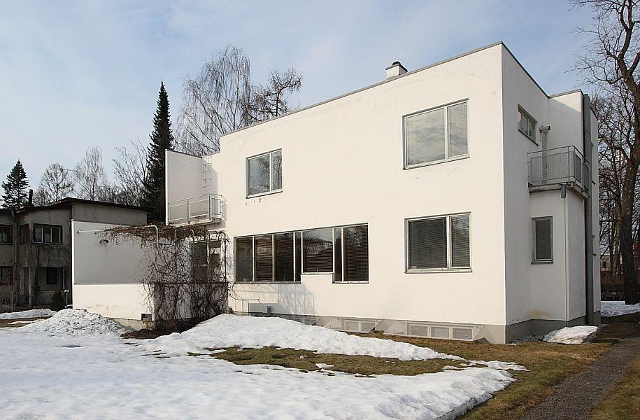 Villa Tammekann’s functionalistic appearance incorporates typical features of early international modernism: with its flat roof, simple cubic volume, white stucco walls, horizontal windows, terraces, and balconies, it is reminiscent of Aalto’s design for the chief physician’s house at the Paimio Sanatorium. Despite the problems during construction the room arrangement basically followed the architect’s original design. A spacious living room with large windows opening onto the garden was at the centre of the house. A fireplace underneath the strip windows was to be the central element of the room, so that people sitting around it could see both the fire and the trees in the garden at the same time, strengthening the unity of the interior and exterior spaces. However, the fireplace remained unbuilt until the present owner renovated the building in the 1990s. The living room and its adjacent spaces— a study-library and a dining room—form an interconnected group running the length of the house. Like many other Aalto houses, the villa has a separate office for Professor Tammekann with an adjacent small storage room for maps. The house’s modern interior elements include a kitchen designed according to the Frankfurt kitchen principles, intended to improve efficiency for the housewife. This part of the house experienced the most changes due to the thickening of the walls. On the second floor were the bedrooms and children’s room.