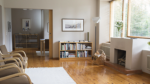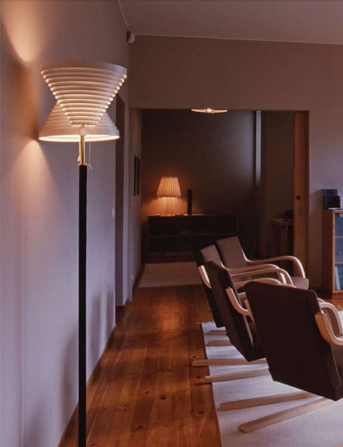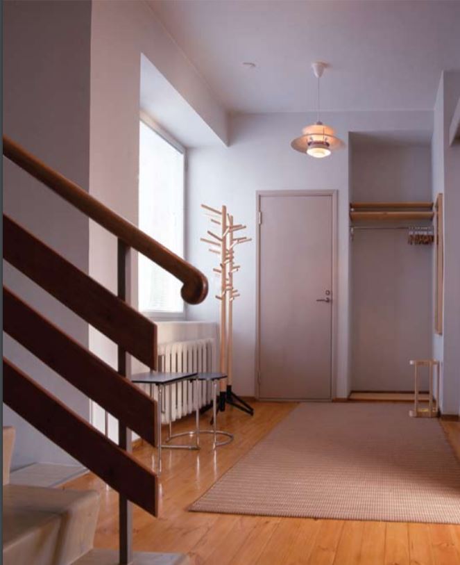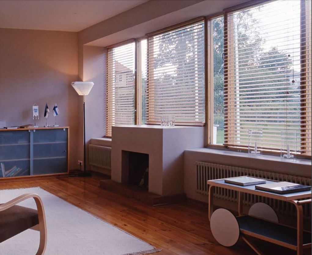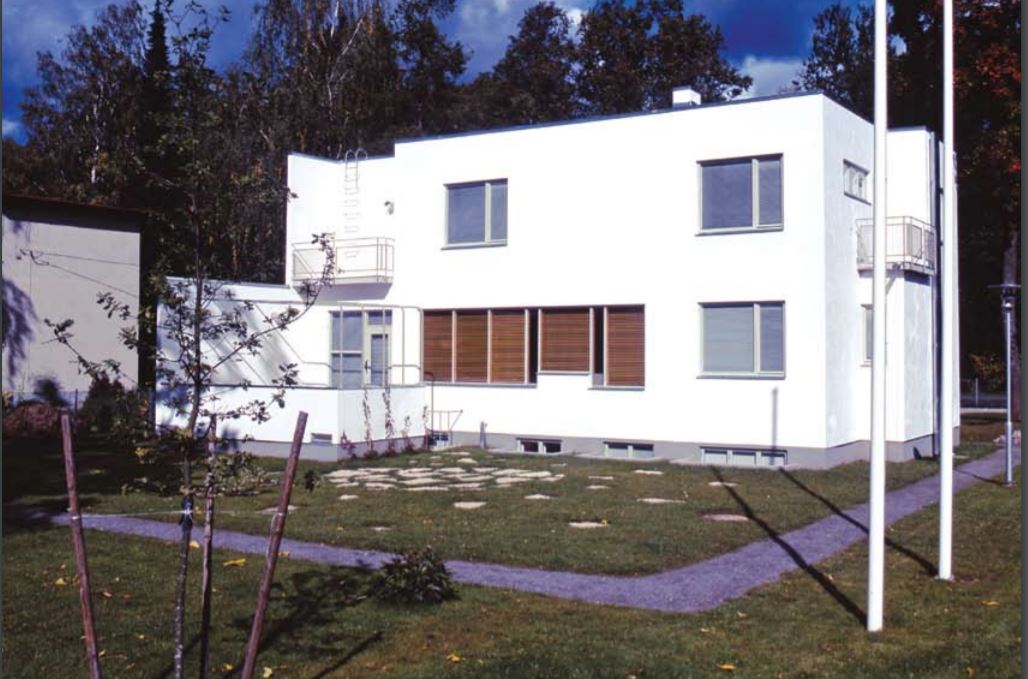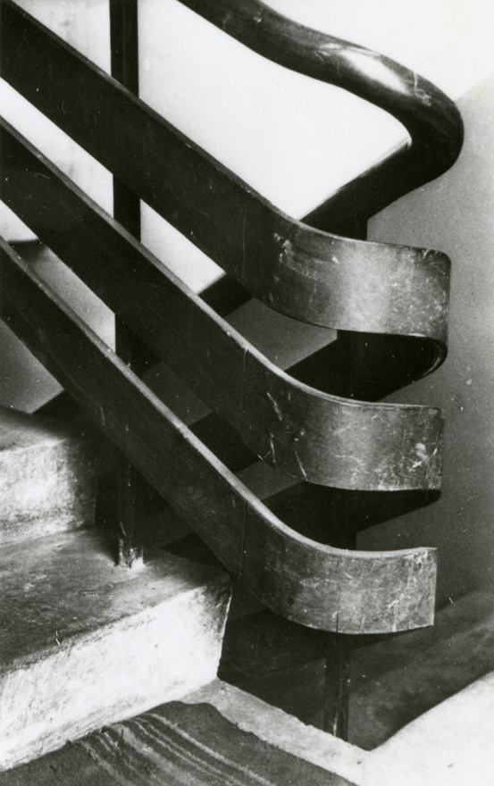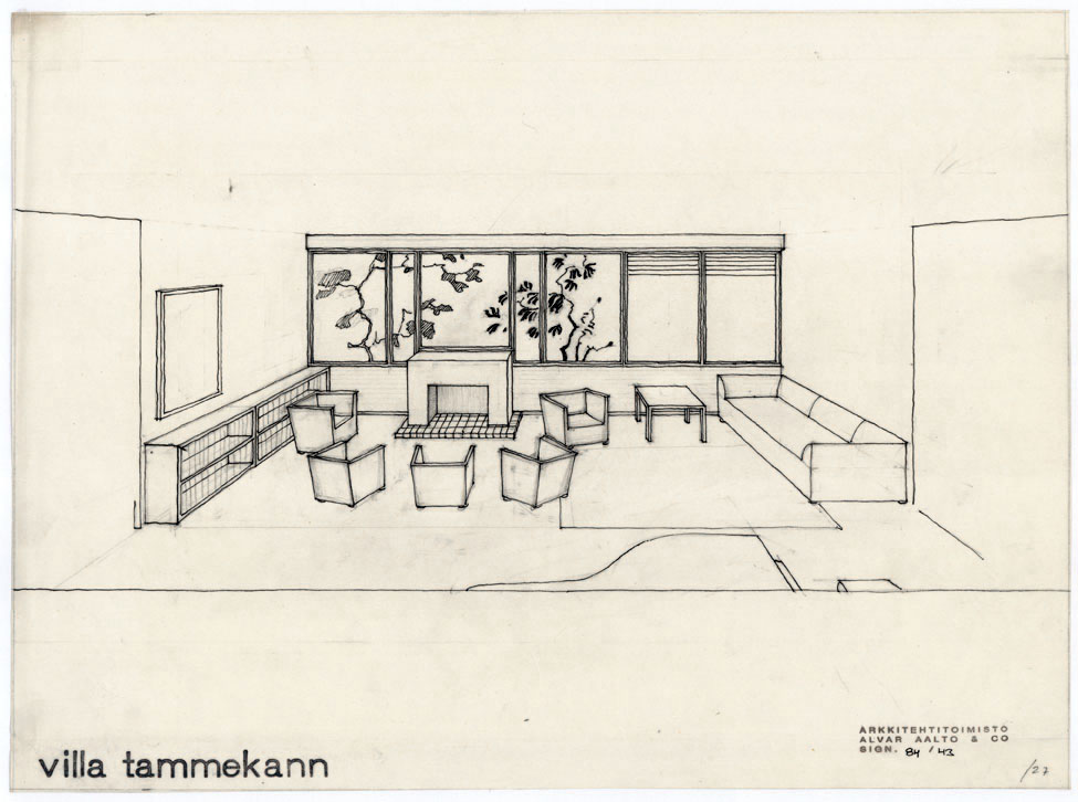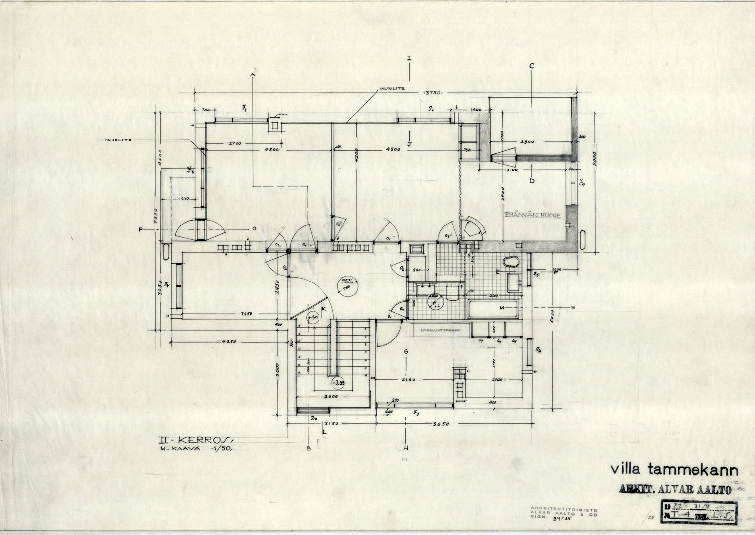 Villa Tammekann’s functionalistic appearance incorporates typical features of early international modernism: with its flat roof, simple cubic volume, white stucco walls, horizontal windows, terraces, and balconies, it is reminiscent of Aalto’s design for the chief physician’s house at the Paimio Sanatorium. Despite the problems during construction the room arrangement basically followed the architect’s original design. A spacious living room with large windows opening onto the garden was at the centre of the house. A fireplace underneath the strip windows was to be the central element of the room, so that people sitting around it could see both the fire and the trees in the garden at the same time, strengthening the unity of the interior and exterior spaces. However, the fireplace remained unbuilt until the present owner renovated the building in the 1990s. The living room and its adjacent spaces— a study-library and a dining room—form an interconnected group running the length of the house. Like many other Aalto houses, the villa has a separate office for Professor Tammekann with an adjacent small storage room for maps. The house’s modern interior elements include a kitchen designed according to the Frankfurt kitchen principles, intended to improve efficiency for the housewife. This part of the house experienced the most changes due to the thickening of the walls. On the second floor were the bedrooms and children’s room.