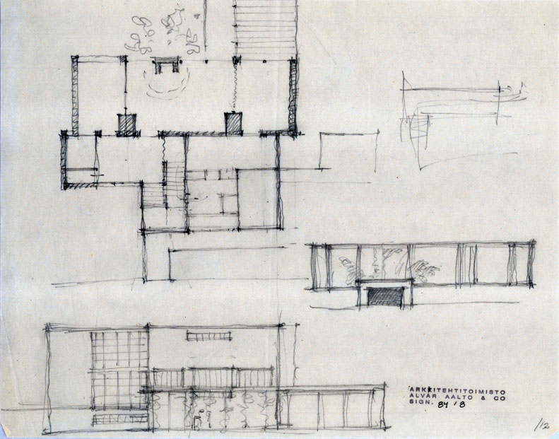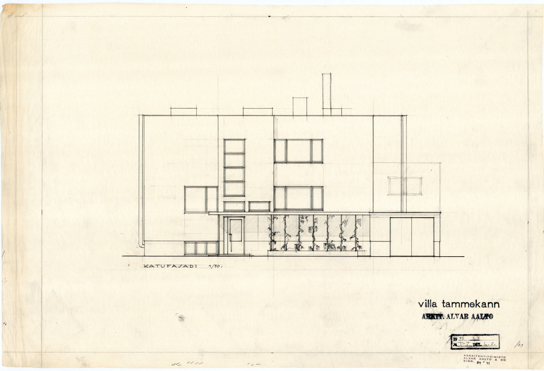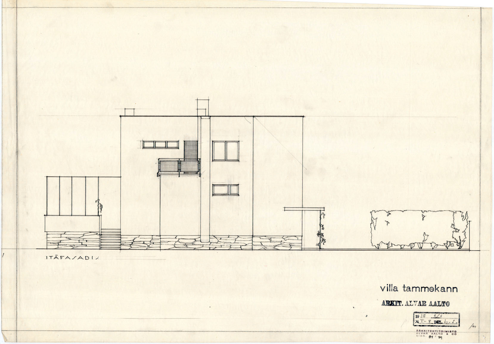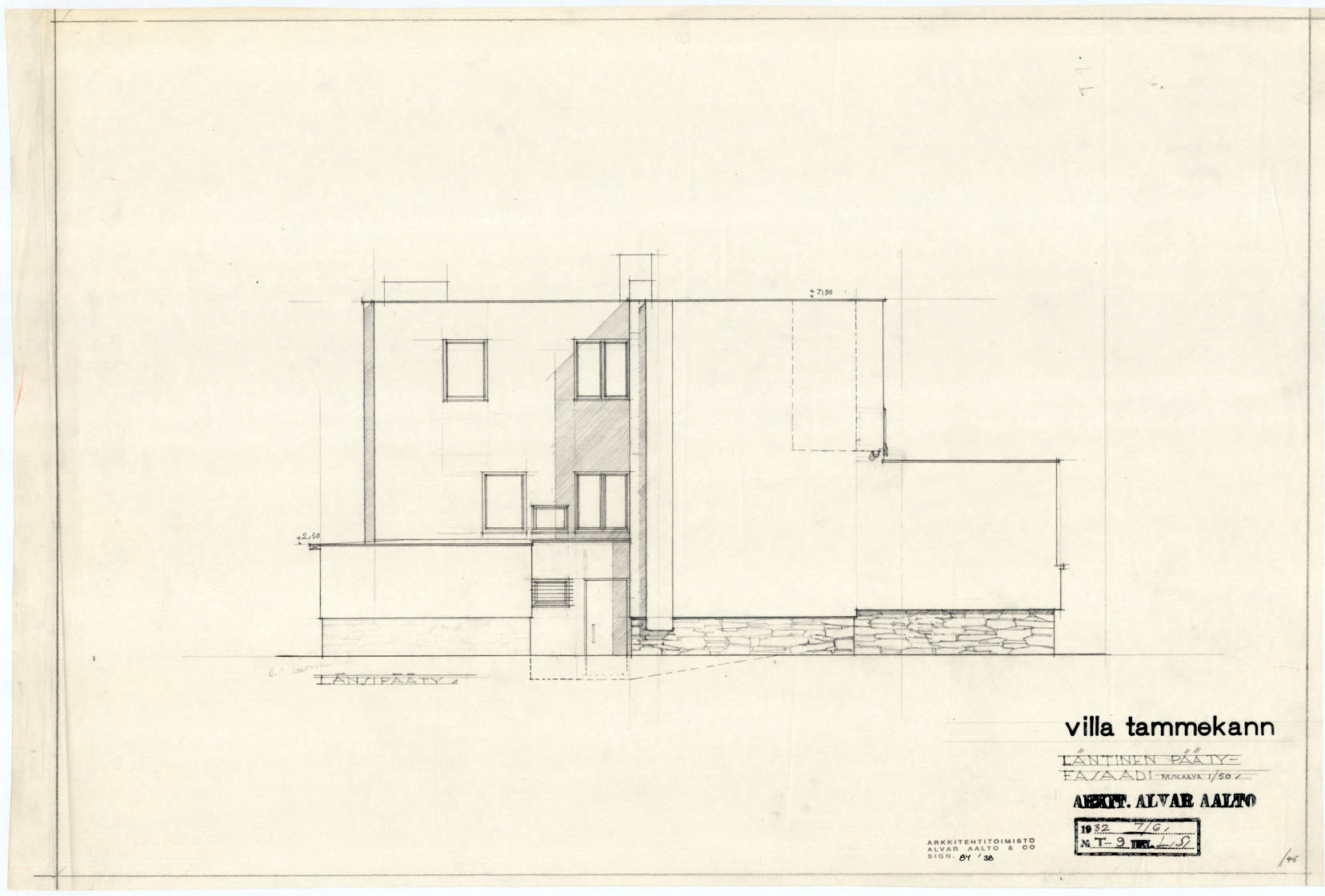 Villa Tammekann, located in the old university town of Tartu in Estonia, was the first project Aalto realized outside of Finland. August Tammekann, a professor of geography, had met Aalto in Turku in the early 1930s. At that time the effects of the Depression were still felt in Finland, and in his conversations with the professor, Aalto had mentioned the lack of commissions since the completion of the Paimio Sanatorium. When Tammekann decided to build a home for his family in March 1932, he wrote Aalto, asking for a proposal for a modern villa in a verdant single-family home area, where many members of Tartu’s intelligentsia lived. During the next few months, the two exchanged many letters to discuss and refine the design. The Tammekanns had very specific wishes for the arrangement of rooms and clearly stated the needs of the family, discussing everything from the height of the first floor to the sizes of windows. Among other things, August Tammekann’s wife, Irene Tammekann, insisted on a room of her own that provided evening sunlight and a window facing west: “I am forced to inform you that if I do not get my own room and the kind of room that I myself want, then the house will not be built.” The project proceeded quickly, and after the building permit was issued in mid-July, construction began immediately. Although the main idea of the building and many details were realized according to Aalto’s plans, some essential changes happened along the way. The most serious was the thickness of the walls, which had to be increased from 18 inches to massive brick walls of 25.5 inches, due to technical problems and the unavailability of some materials in Estonia in the early 1930s. Thus the proportions and dimensions of the spaces were altered, and room sizes dramatically reduced. When Aalto learned of the decision, he, quite cordially, wrote to complain that he was not informed of this problem, explaining that he would have revised the plan if he had known. Technical problems continued with the flat roof, which leaked from the beginning. The family moved into the half-finished house in the spring of 1933, and even in early 1935, many parts of the house were still incomplete, including the balconies and the facade finishes as well as parts of the interior. Financial problems in Estonia and restrictions for payments abroad also caused delays in the payment of the architect’s salary.