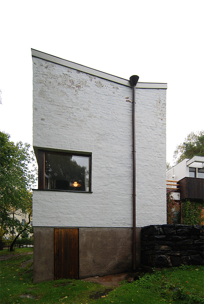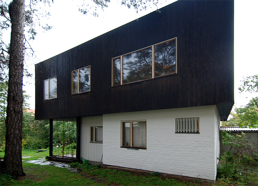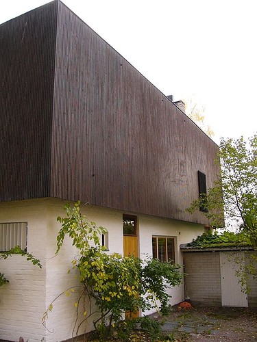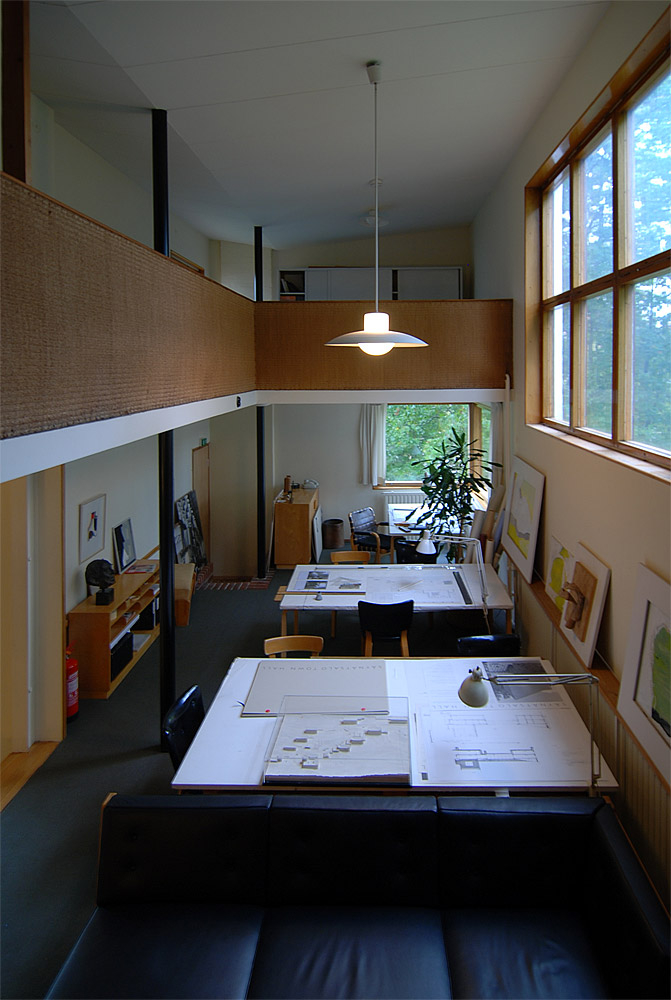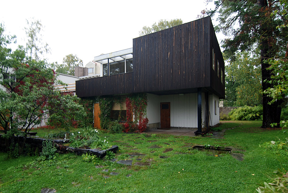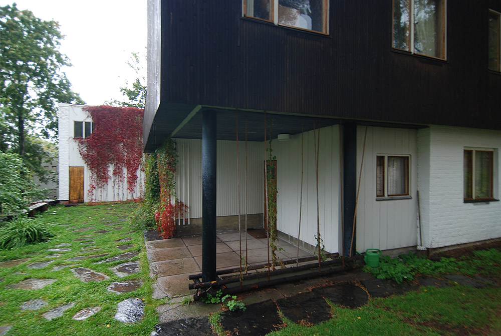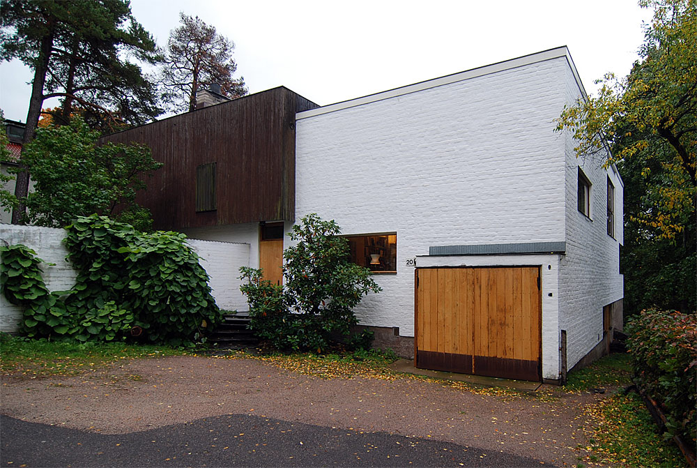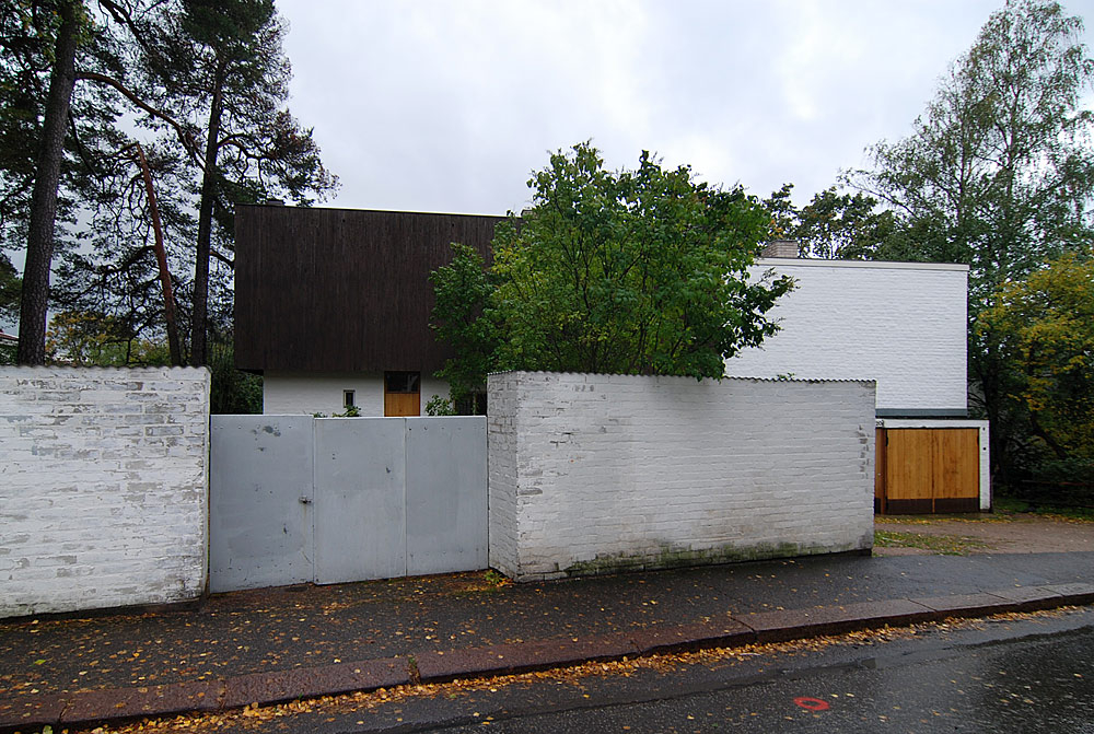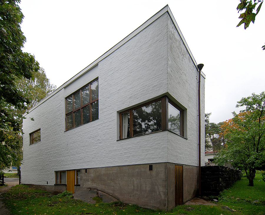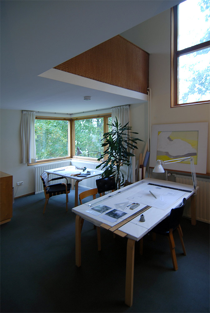 only as residence and private studio of Aalto. Materials: Frame of tubular steel filled with concrete. Exterior walls of whitewashed brick. The living areas of the house have walls of wood, the roofs have only a very slight slope, the terrace on the upper Ievel serves as a roof garden between the dwelling area and the studio area . |