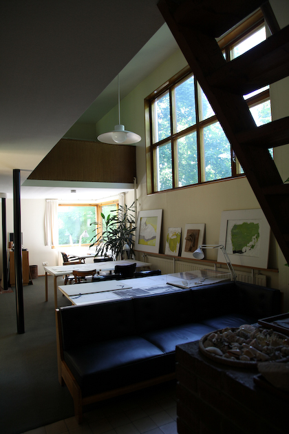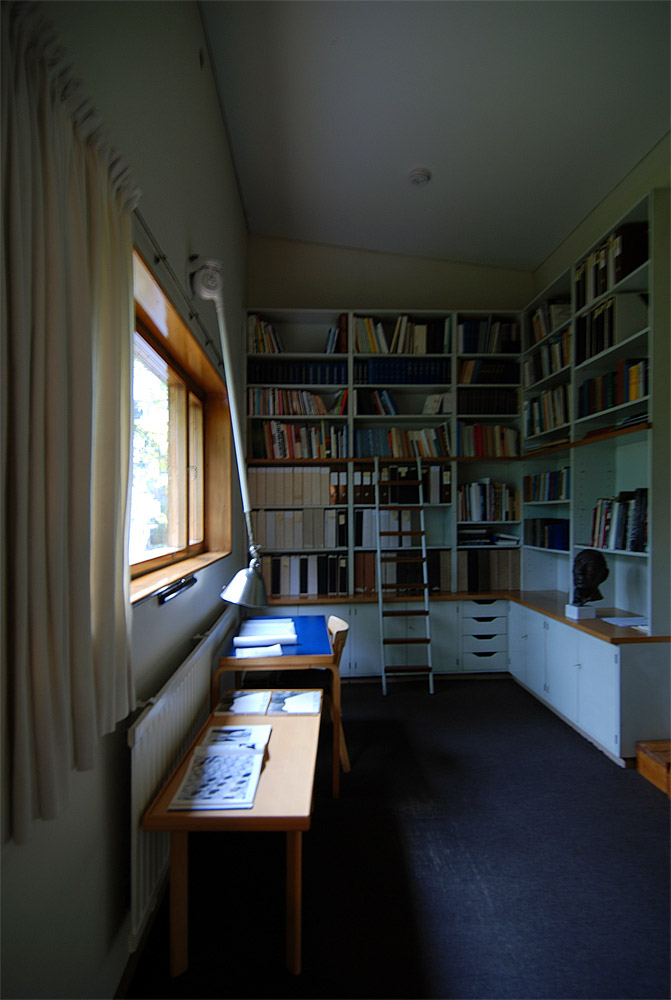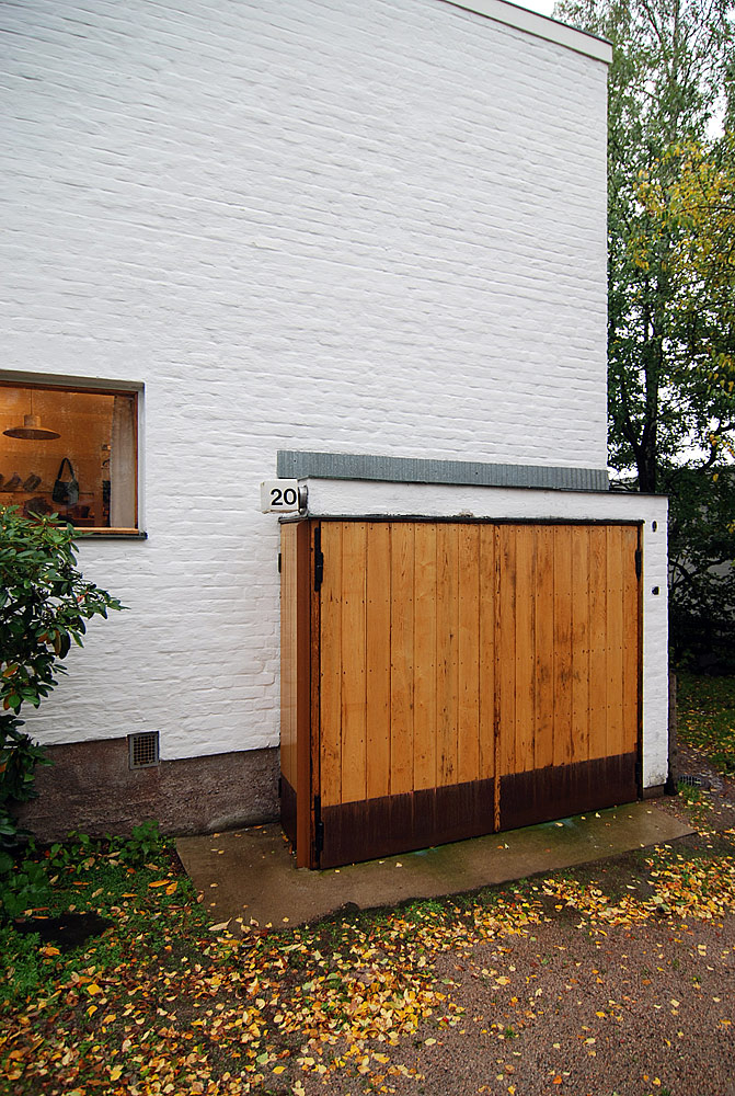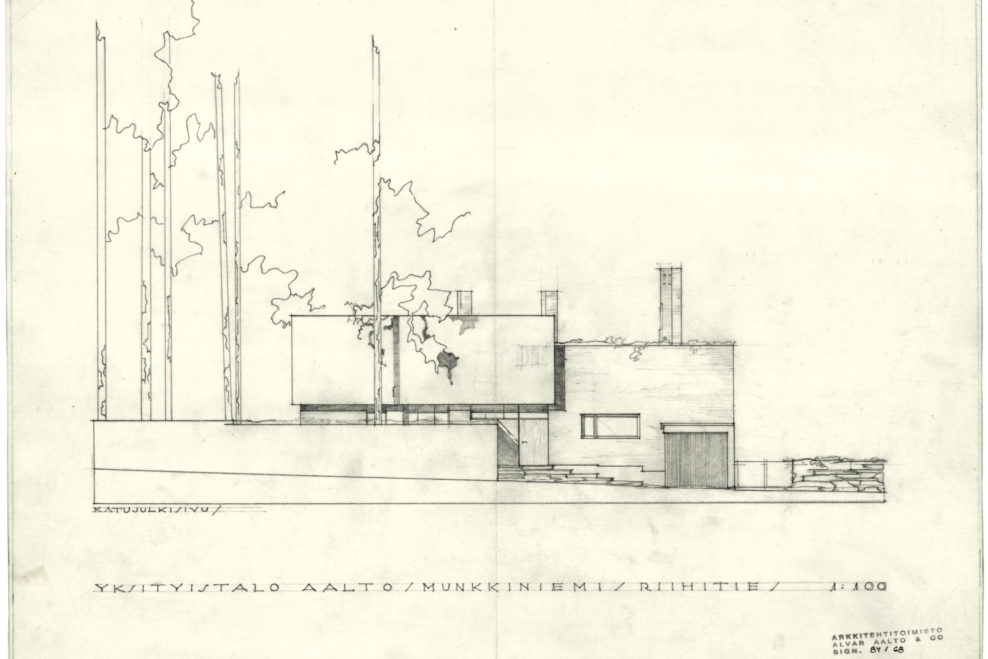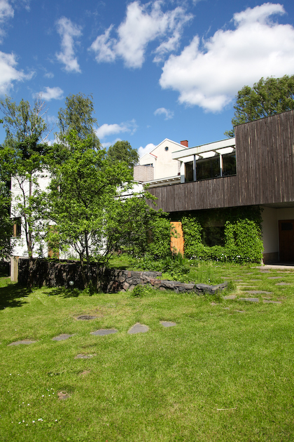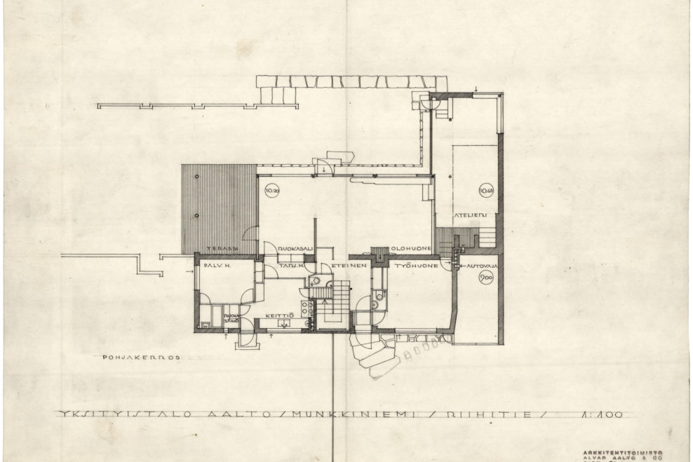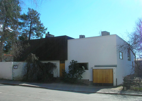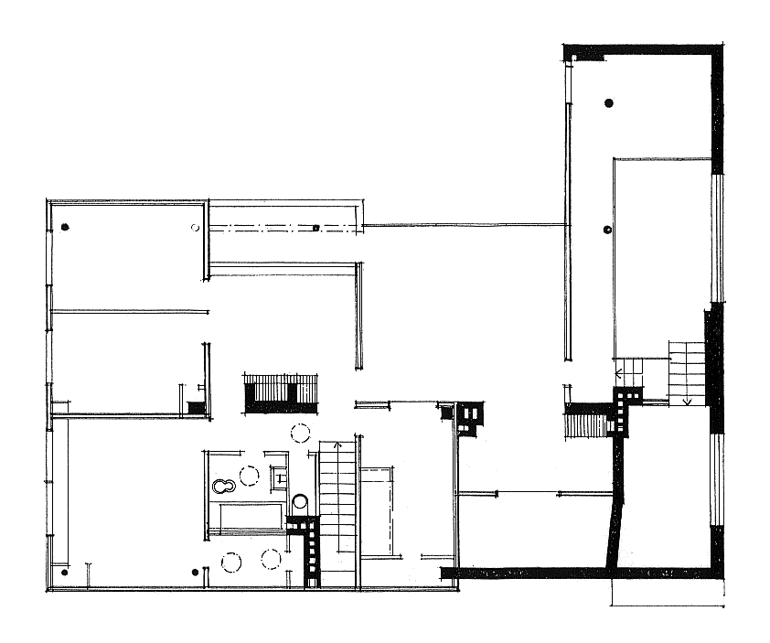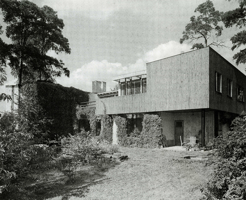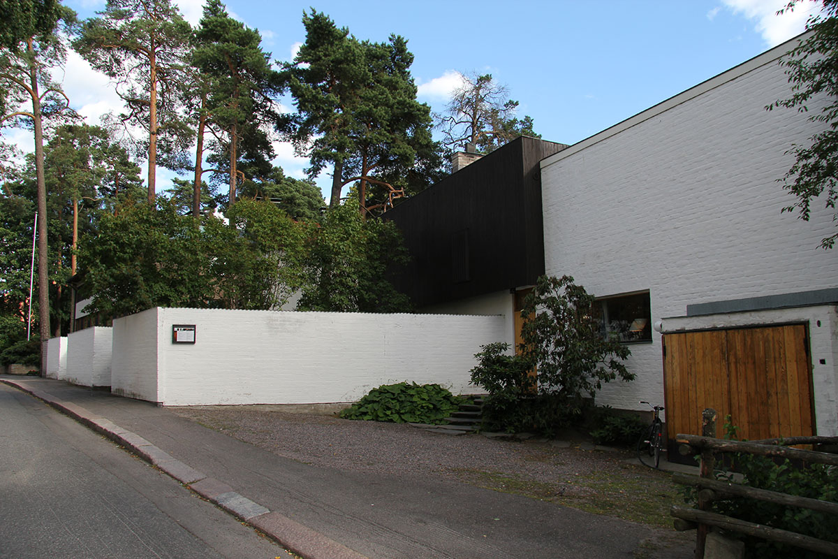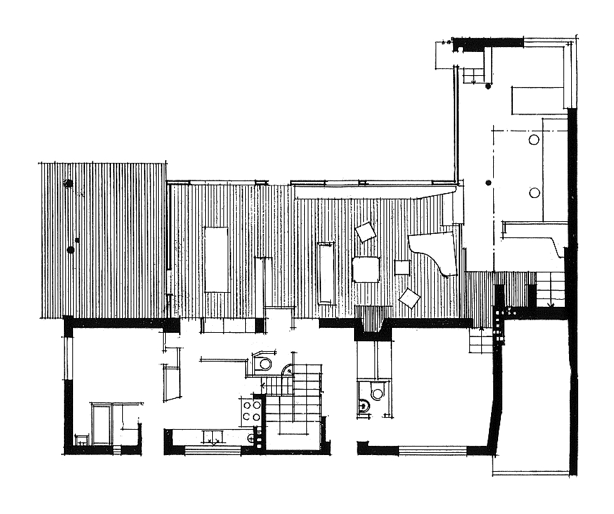 only as residence and private studio of Aalto. Materials: Frame of tubular steel filled with concrete. Exterior walls of whitewashed brick. The living areas of the house have walls of wood, the roofs have only a very slight slope, the terrace on the upper Ievel serves as a roof garden between the dwelling area and the studio area . |