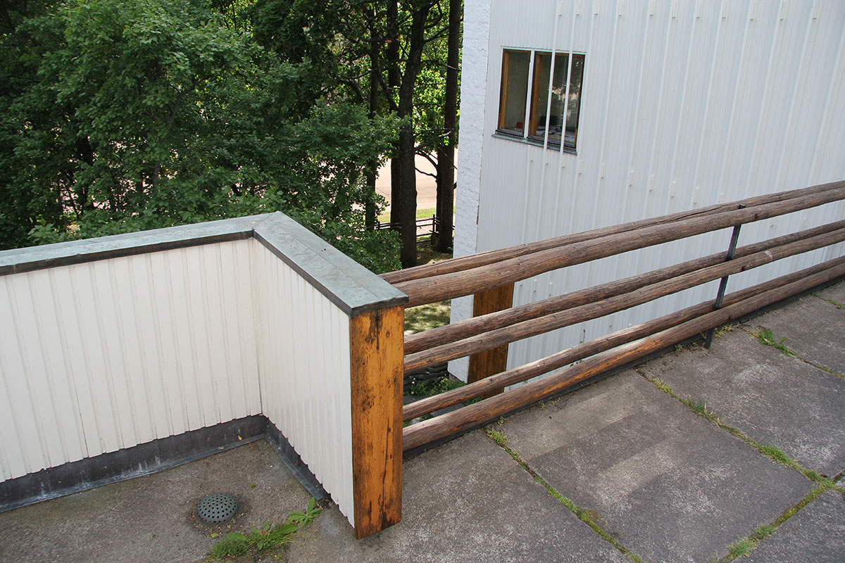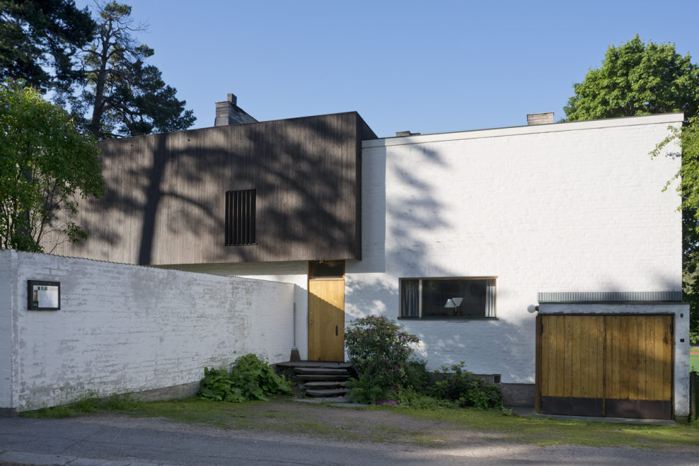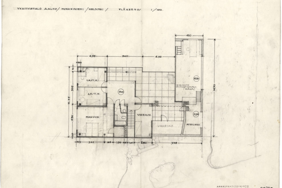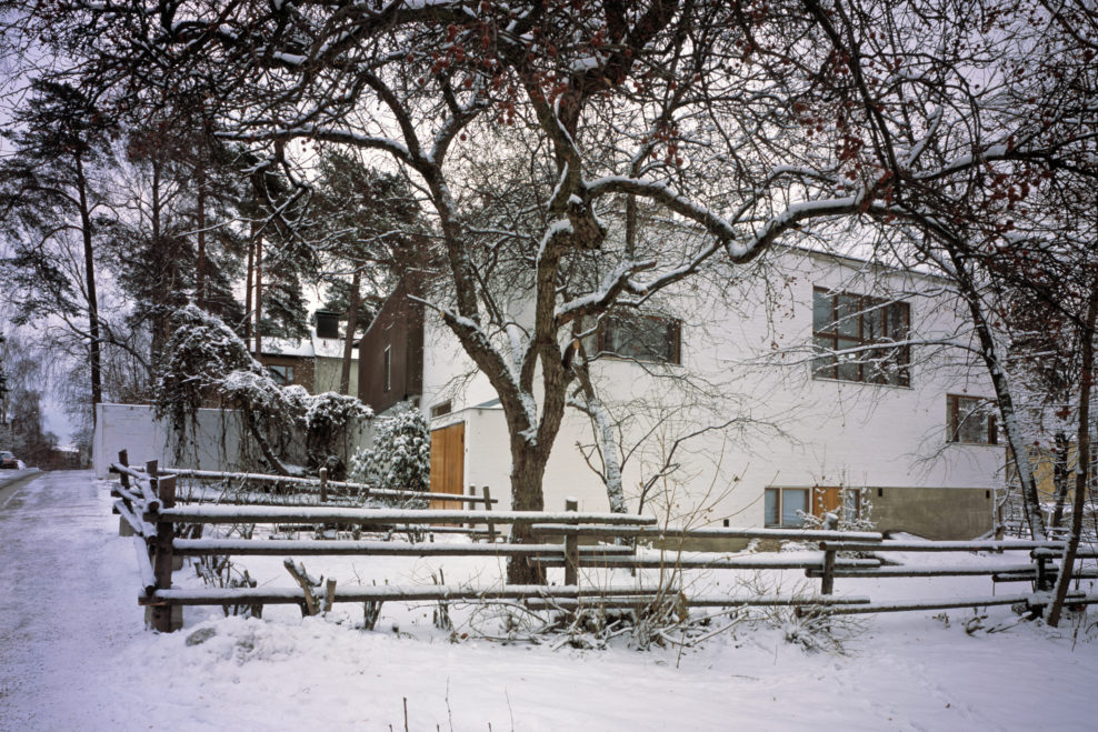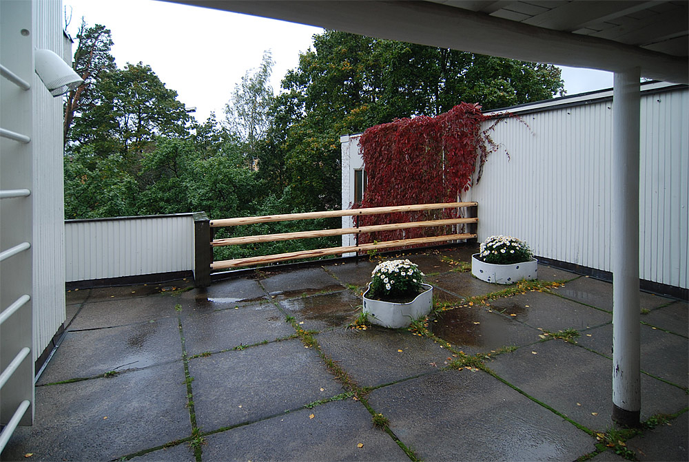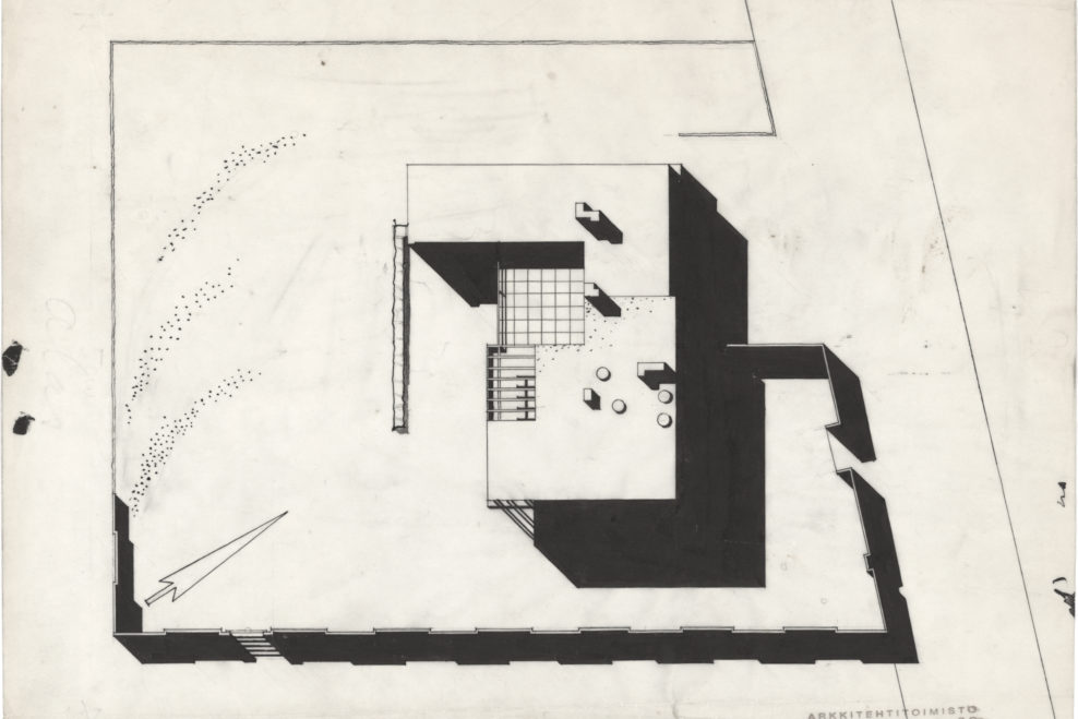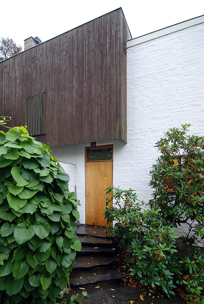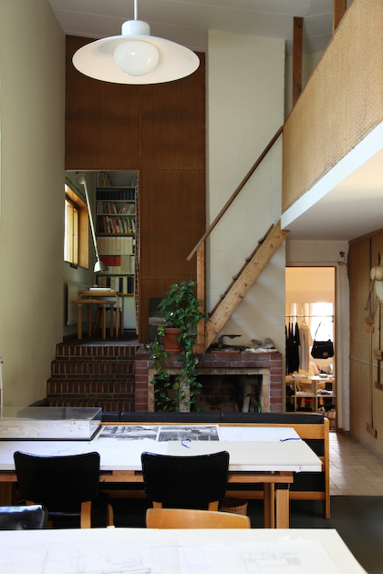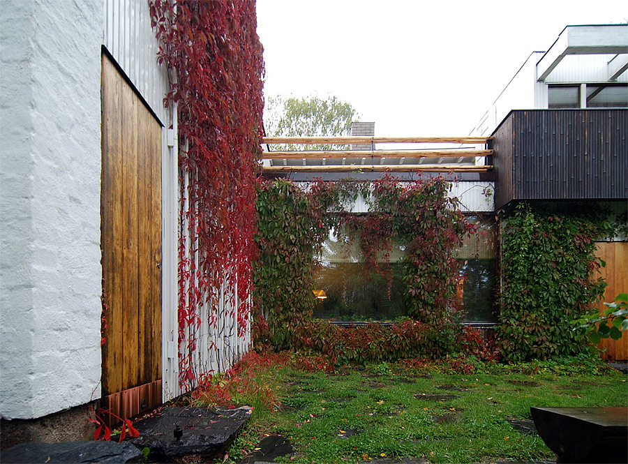 only as residence and private studio of Aalto. Materials: Frame of tubular steel filled with concrete. Exterior walls of whitewashed brick. The living areas of the house have walls of wood, the roofs have only a very slight slope, the terrace on the upper Ievel serves as a roof garden between the dwelling area and the studio area . |