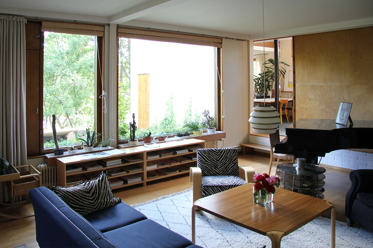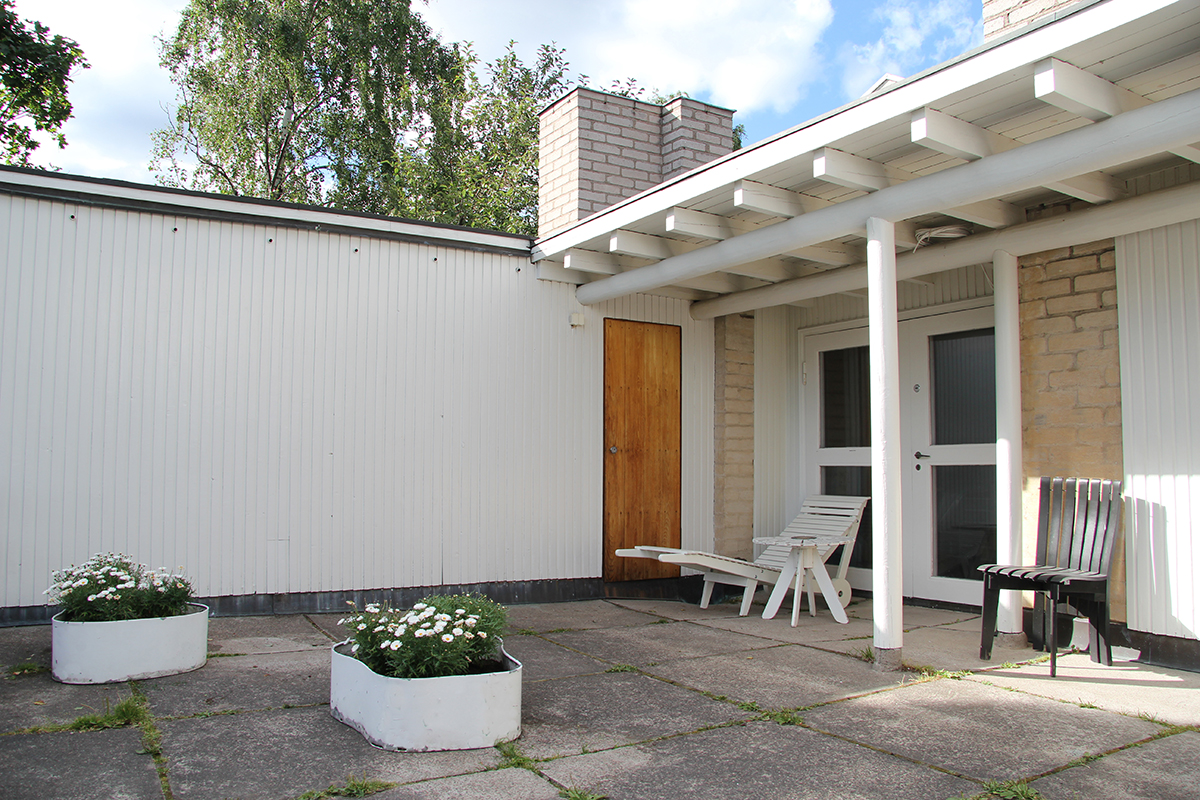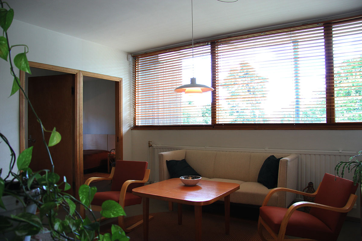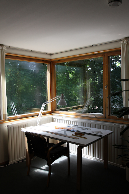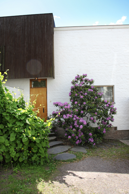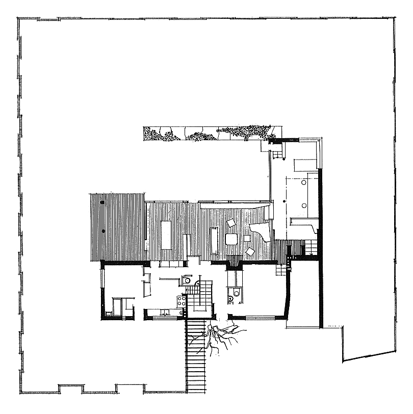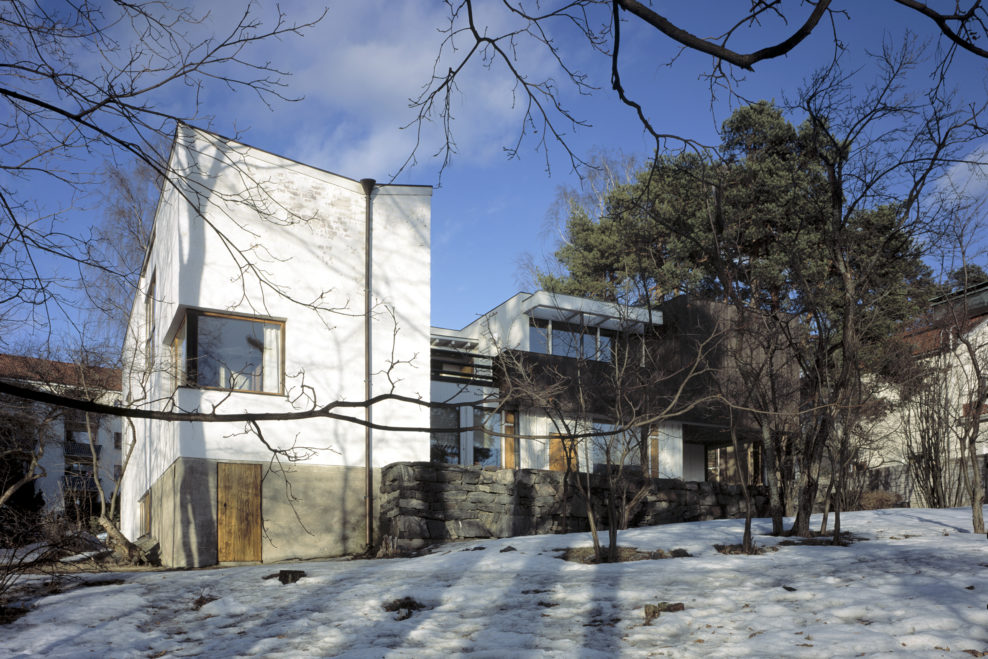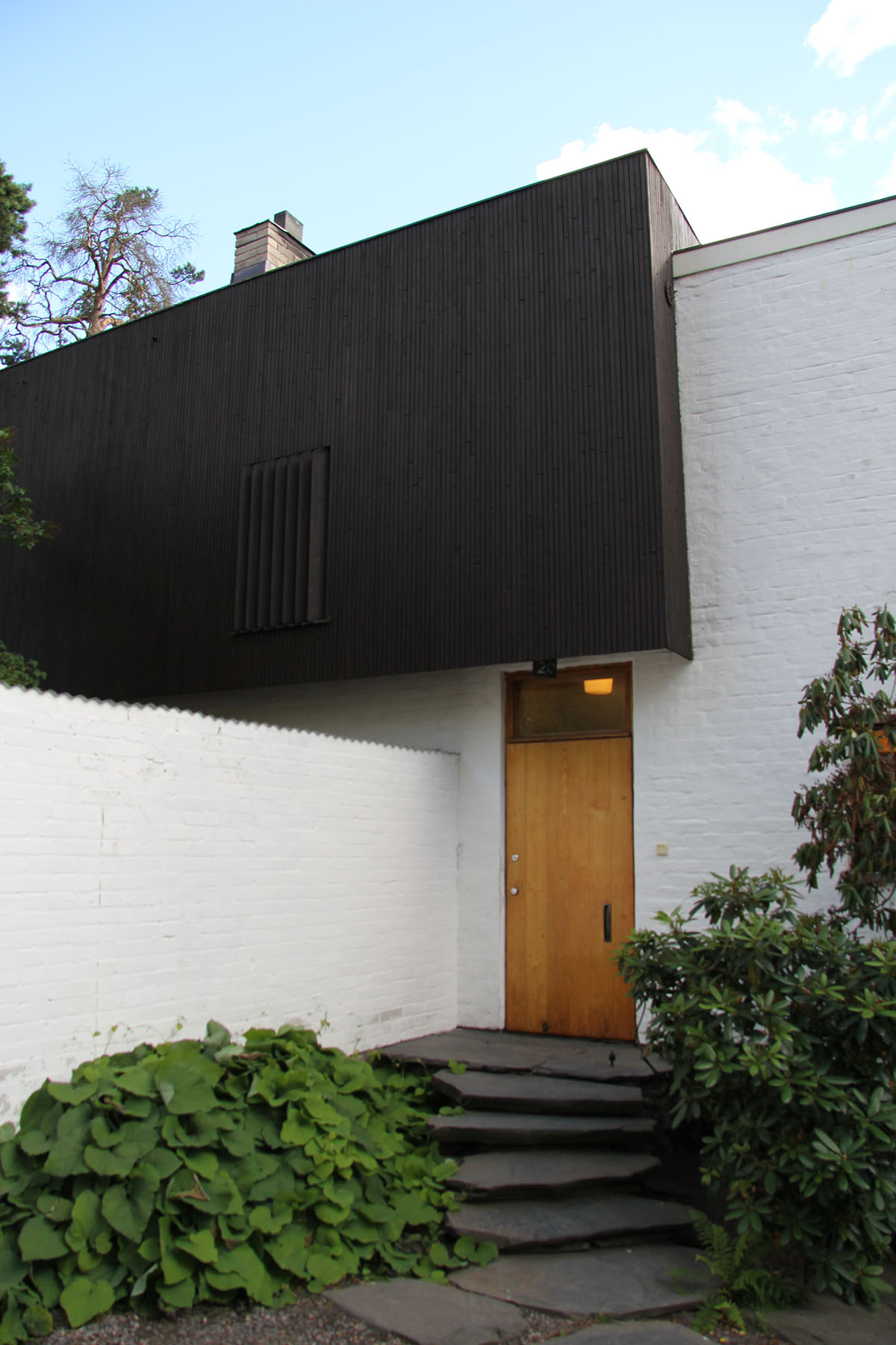 only as residence and private studio of Aalto. Materials: Frame of tubular steel filled with concrete. Exterior walls of whitewashed brick. The living areas of the house have walls of wood, the roofs have only a very slight slope, the terrace on the upper Ievel serves as a roof garden between the dwelling area and the studio area . |