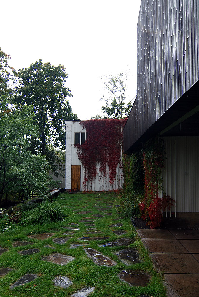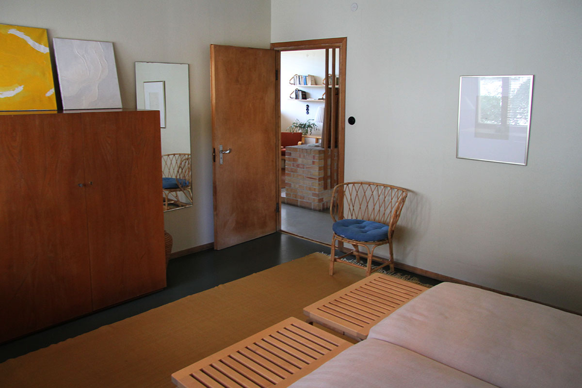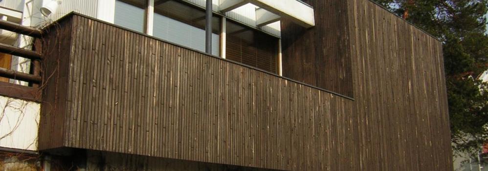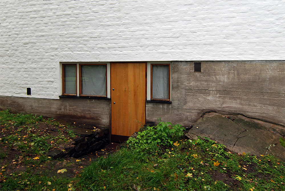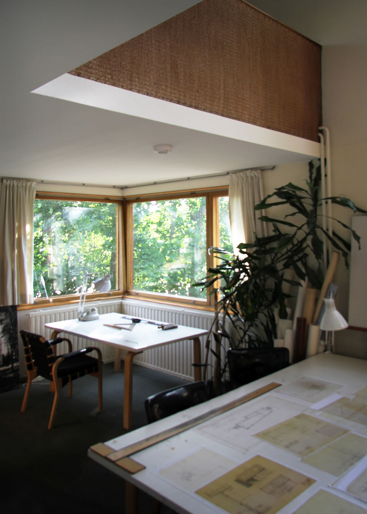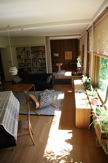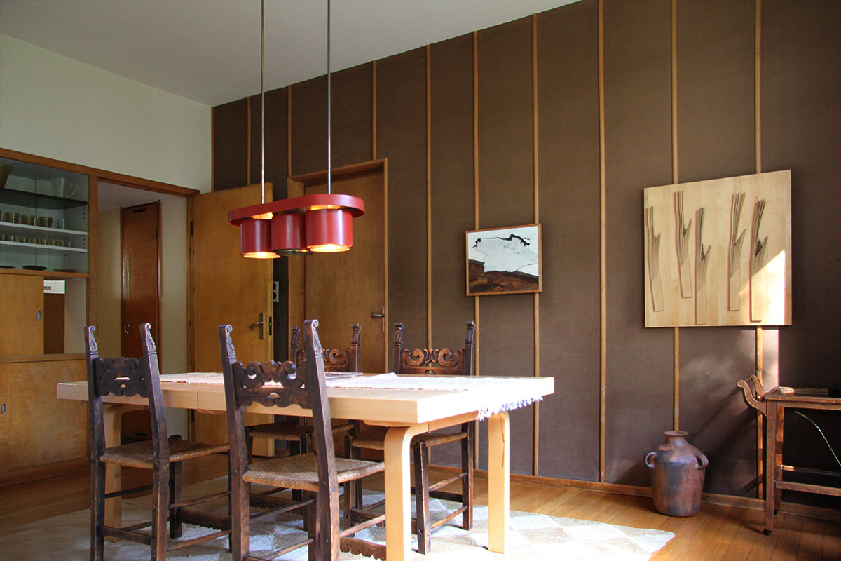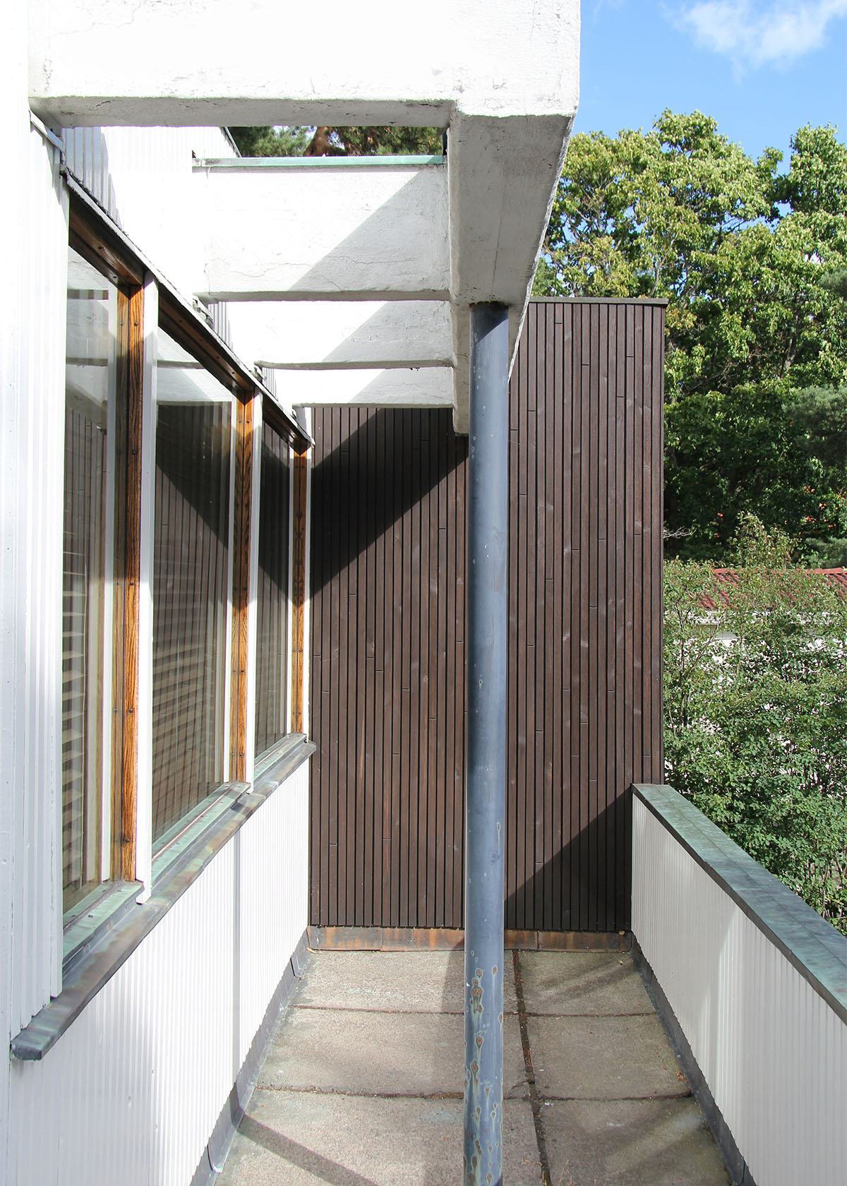 only as residence and private studio of Aalto. Materials: Frame of tubular steel filled with concrete. Exterior walls of whitewashed brick. The living areas of the house have walls of wood, the roofs have only a very slight slope, the terrace on the upper Ievel serves as a roof garden between the dwelling area and the studio area . |