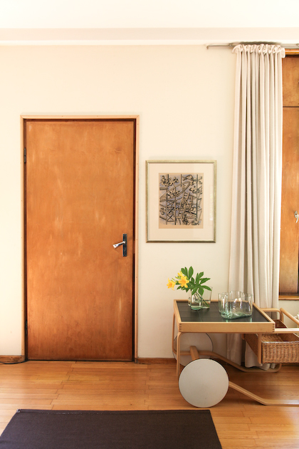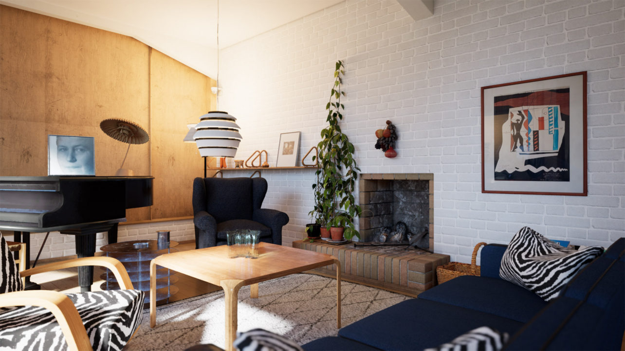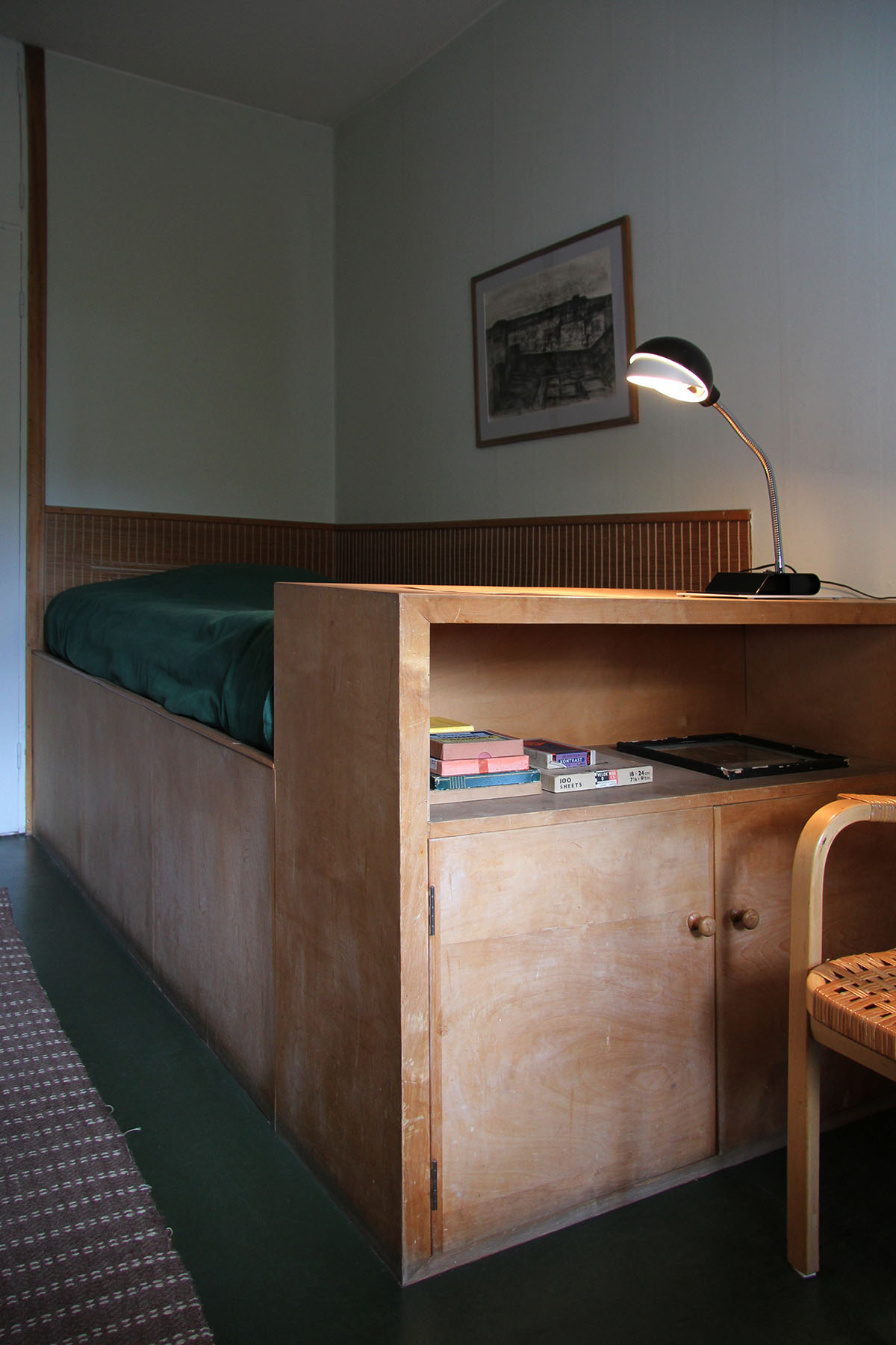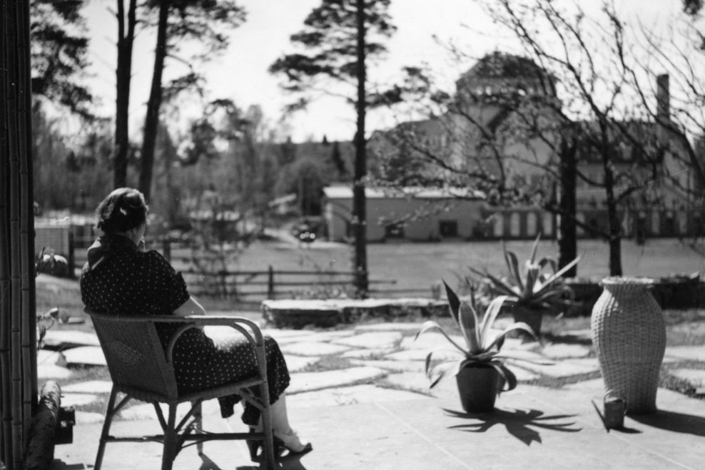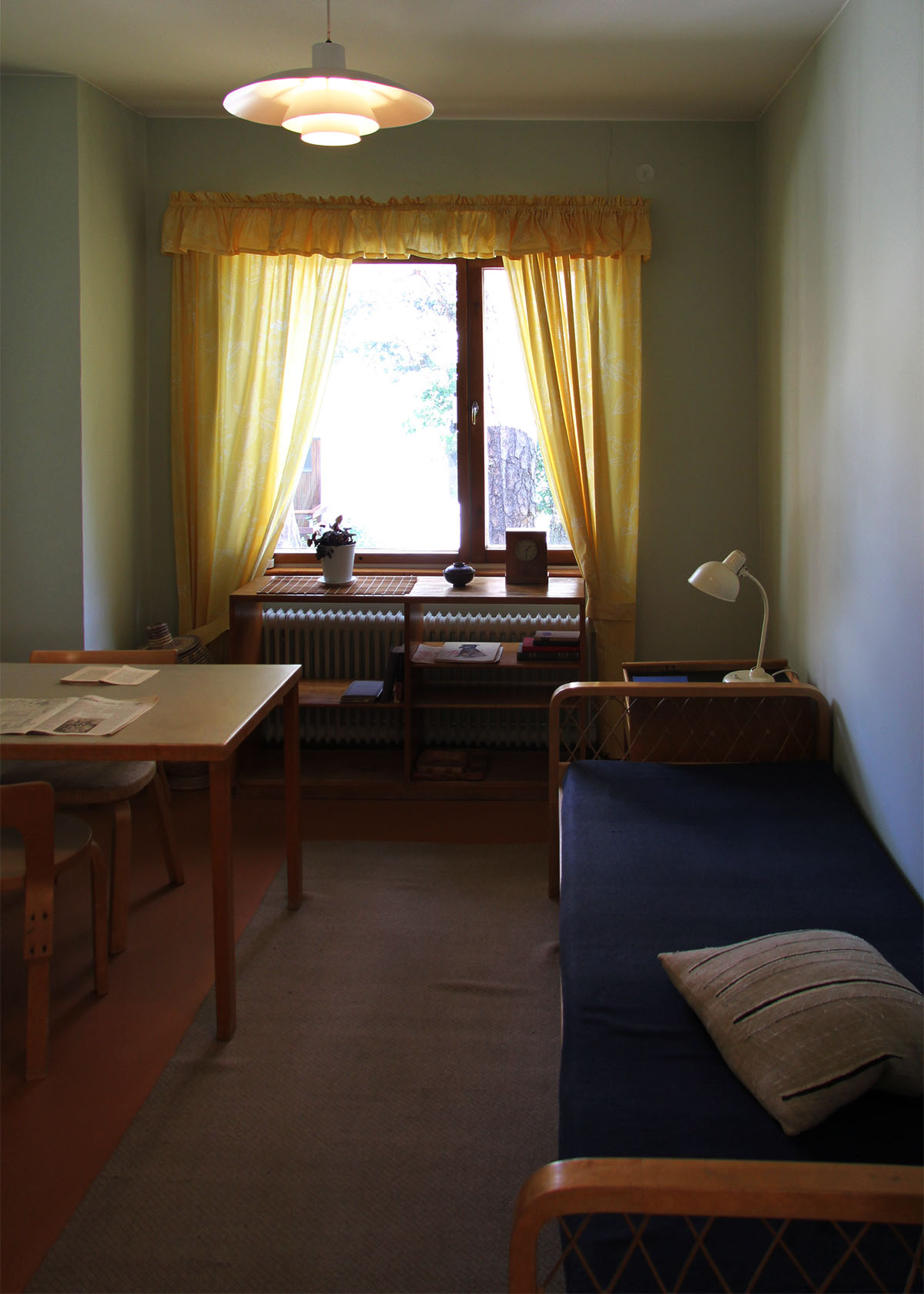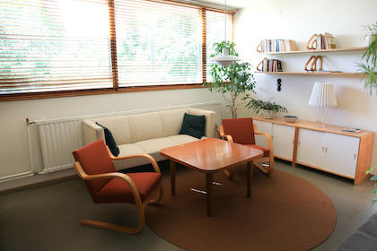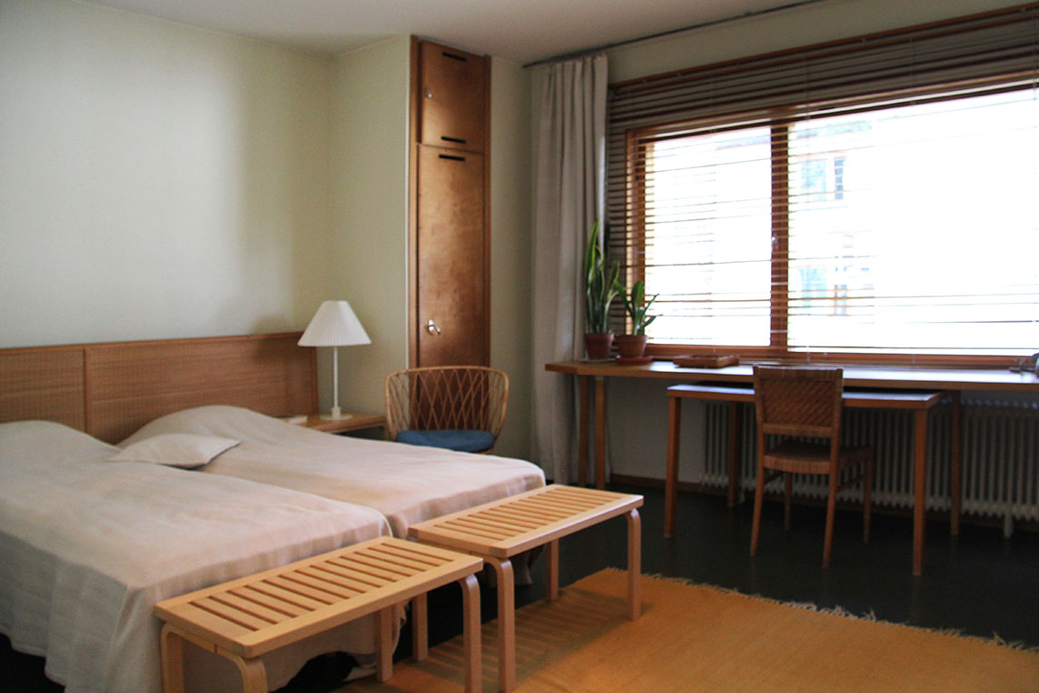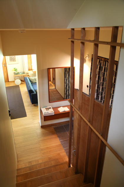 only as residence and private studio of Aalto. Materials: Frame of tubular steel filled with concrete. Exterior walls of whitewashed brick. The living areas of the house have walls of wood, the roofs have only a very slight slope, the terrace on the upper Ievel serves as a roof garden between the dwelling area and the studio area . |