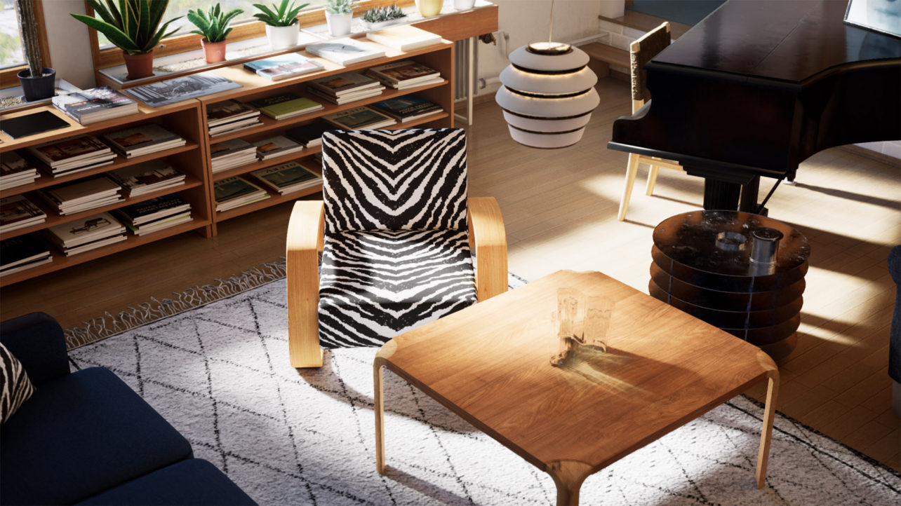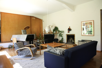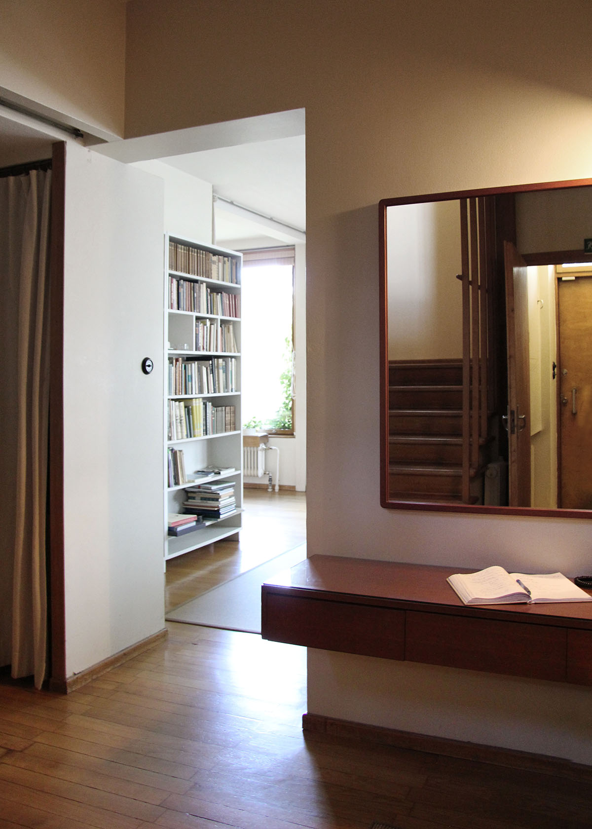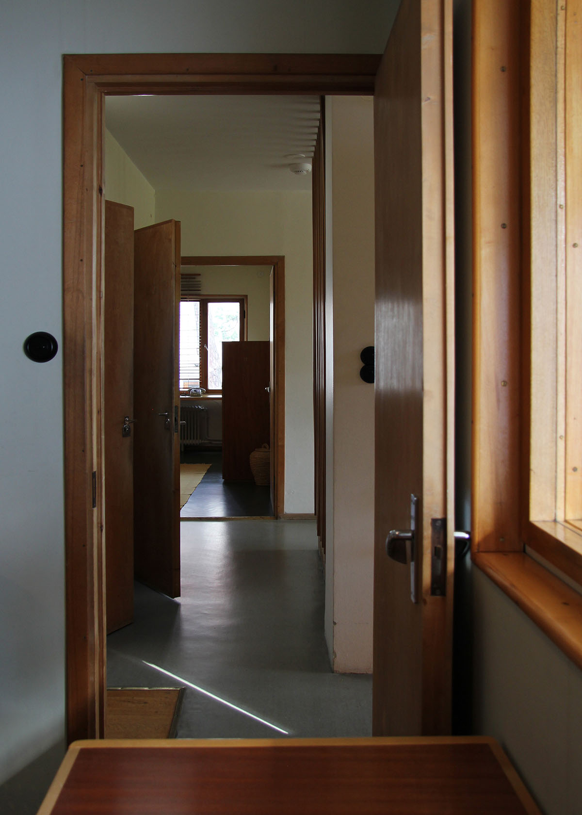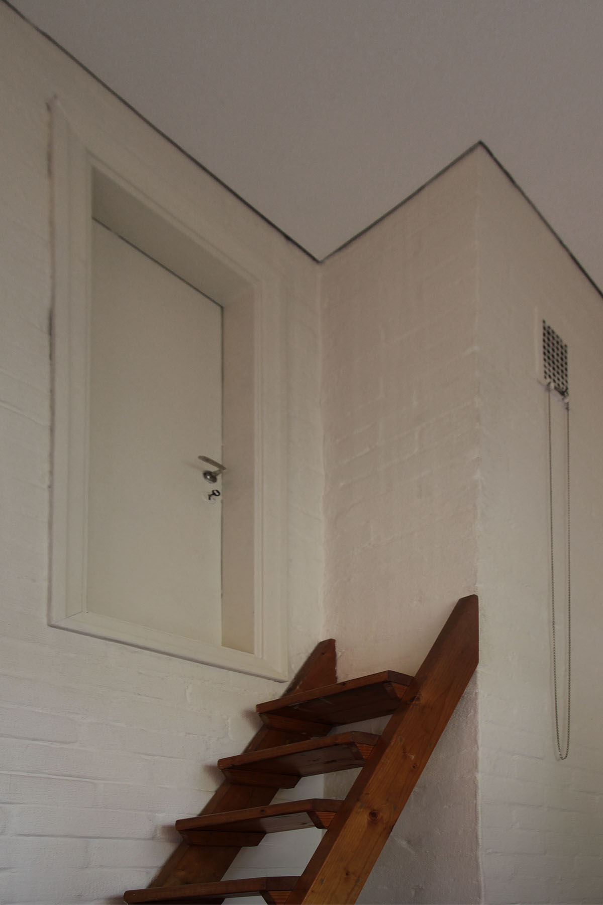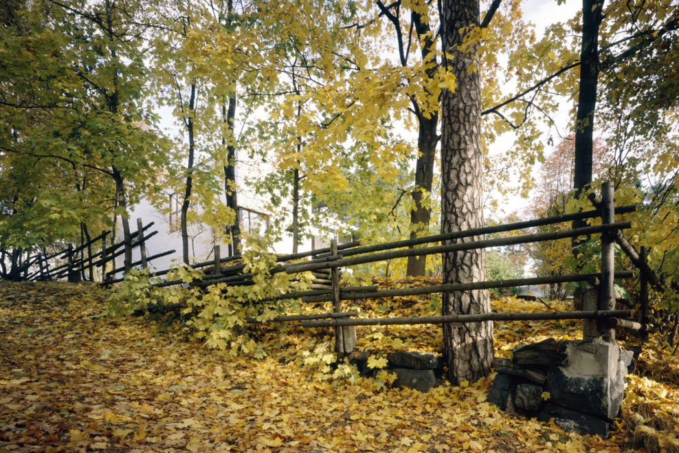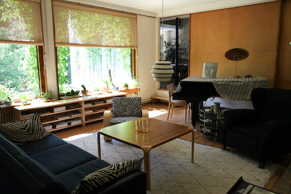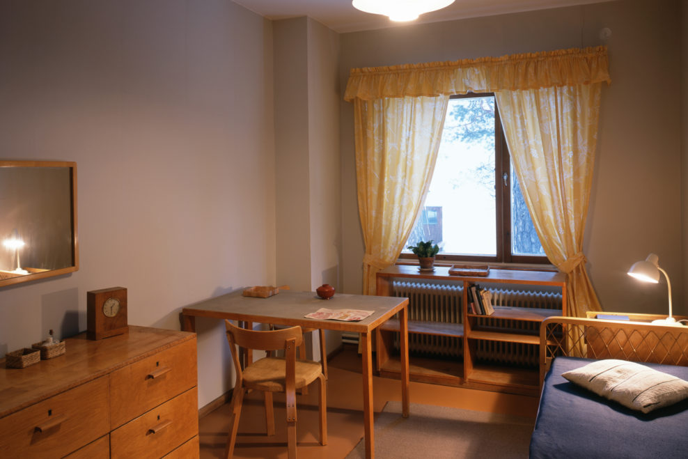 only as residence and private studio of Aalto. Materials: Frame of tubular steel filled with concrete. Exterior walls of whitewashed brick. The living areas of the house have walls of wood, the roofs have only a very slight slope, the terrace on the upper Ievel serves as a roof garden between the dwelling area and the studio area . |