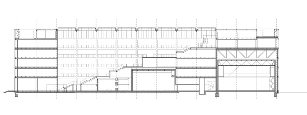 The most immediate problem posed by the project brief lay in the compositional relationship between technical elements such as studios, which had to be hermetically enclosed, and office space, which had to be transparent to enjoy the surrounding views. However, combining large television studios with relatively small office spaces created the opportunity to stack studios in a gradual succession of increasing height in the centre of the building and leave the office spaces on either side. The roofs of the studios became the basis of a terraced landscape. This solution enhanced the importance of the public and social space, which became an integral part of the daily workings of the institution.