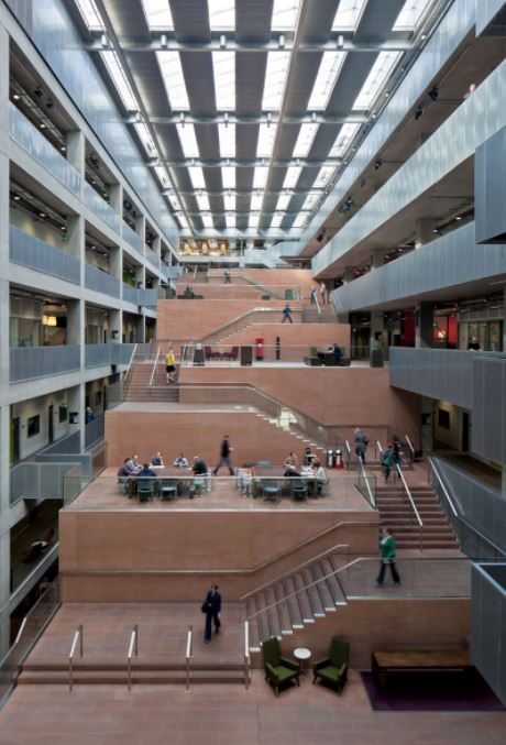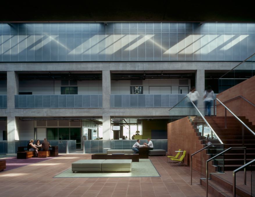 Encompassing a broad remit including television, radio, internet, production facilities, digital studios, technical support and office space, the design encourages creative interaction between its many occupants by connecting all the workspaces. This is achieved by means of a central atrium configured as a tiered sequence of steps, platforms and terraces, crafted from local red sandstone. Circulation and communication through the building and between office floors is facilitated by this promenade, which not only offers informal meeting areas but also encourages movement between areas, giving visual representation to the public aspect of the building.