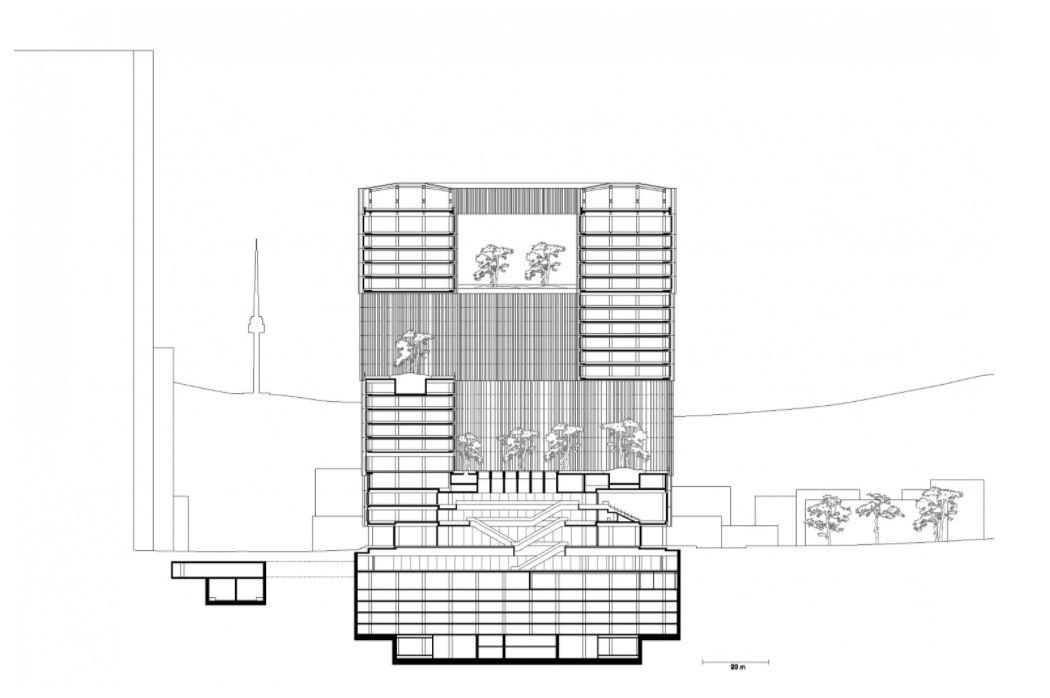 The form of the building is both abstract and gestural. Focusing on a single, clear volume, the proportions of the building have been carefully developed around a central courtyard to maximise the effectiveness of natural ventilation and daylight. Three large urban openings connect this central void with the exterior surroundings, providing views over the city and the mountains in the distance and therefore establishing a sense of orientation and belonging. As ‘hanging gardens’, these openings give scale and allow nature to extend from the adjacent park into all parts of the building.