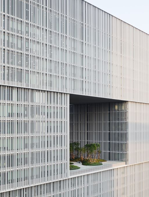 The façades with their diaphanous brise-soleil cladding not only facilitate the environmental performance of the building by providing shading and reducing heat load, but also give the building a coherent and strong yet at the same time open and light form. Metaphorically, the new building echoes the aspirations of a modern organisation, mediating between local and global, private and public, collective and individual, formal and informal, and in doing so establishing its dynamic identity. |