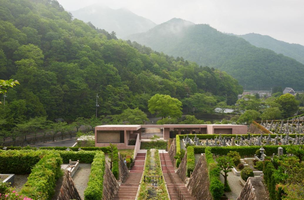 Inagawa Cemetery is located on a steep site in the Hokusetsu mountain range of the Hyogo prefecture, approximately 40 kilometres north of Osaka. The cemetery is laid out across terraces and bisected by a monumental flight of steps leading up to a shrine at the highest point – an axis that orients the whole project.