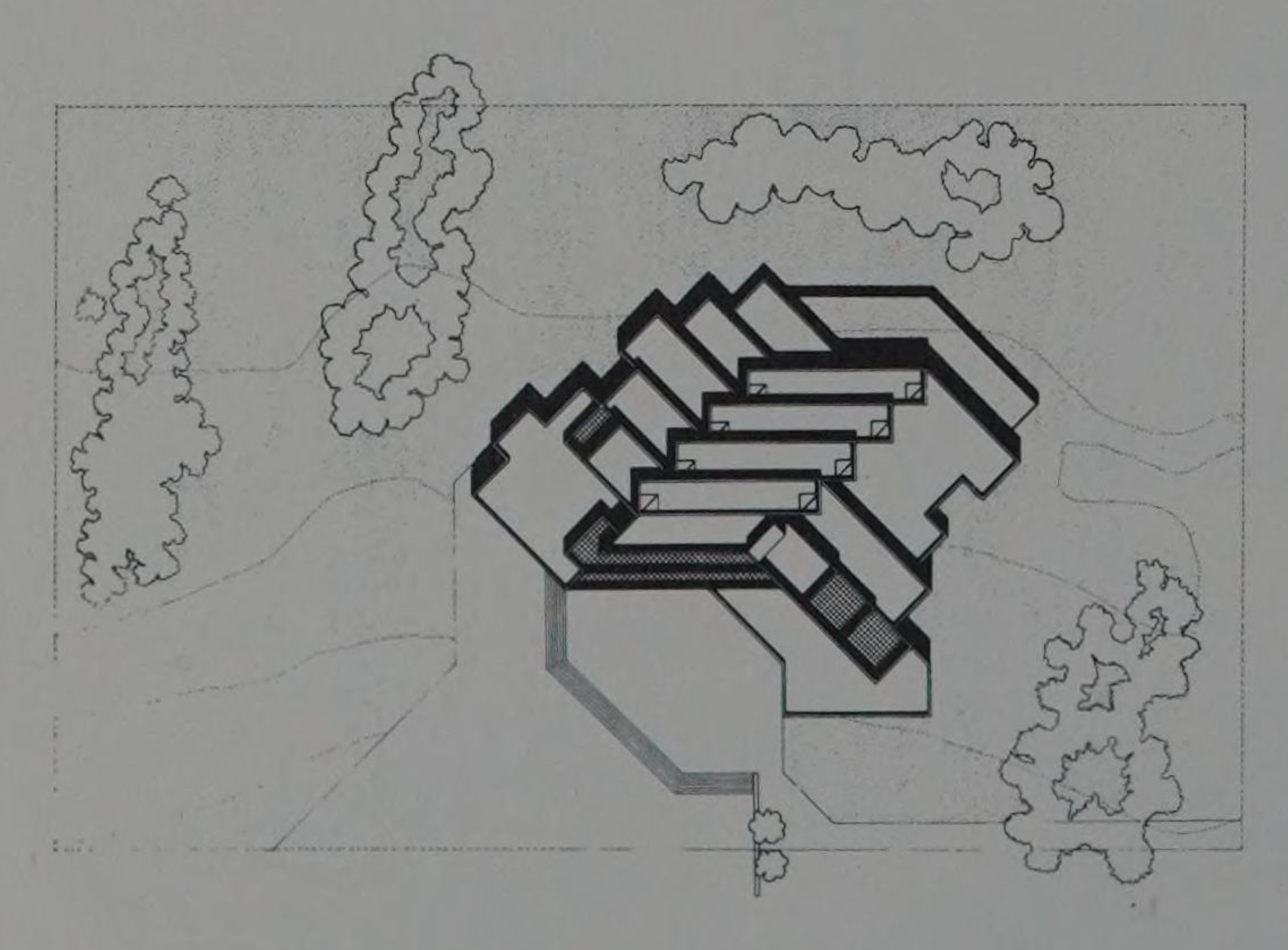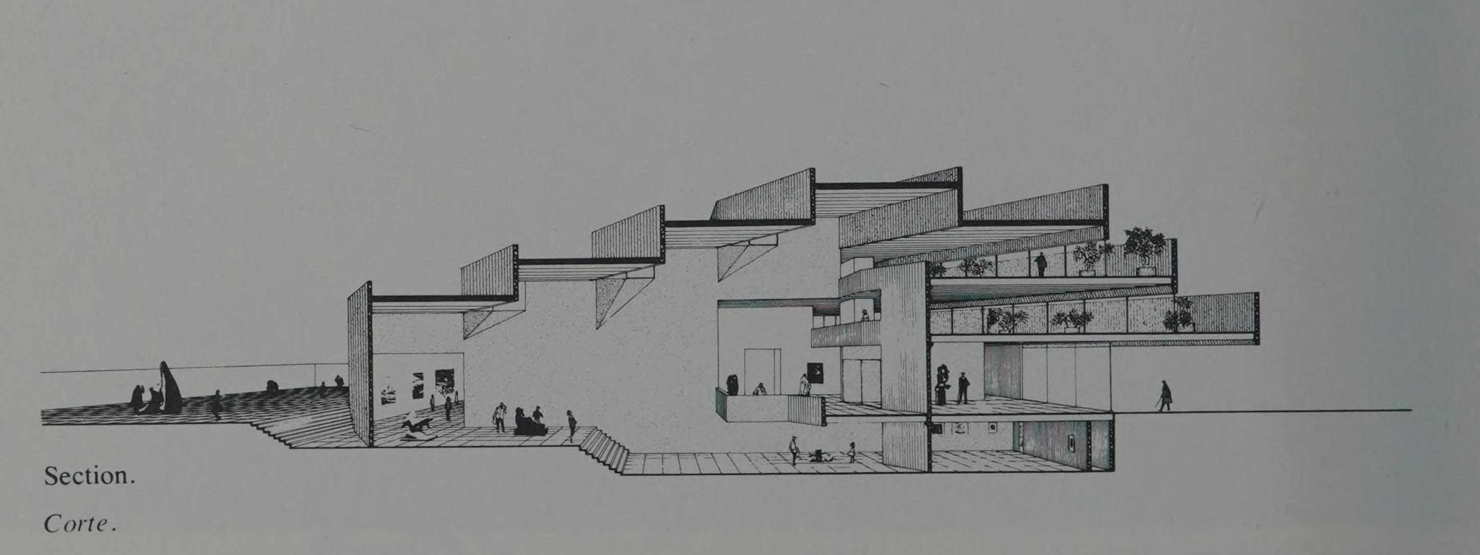 thirteen rooms showing the different schools of contemporary art, including architecture and design. The closed rooms will be loosely connected by ramps, so that the visitor can follow a random, rather than a predetermined route. The museum will also have an